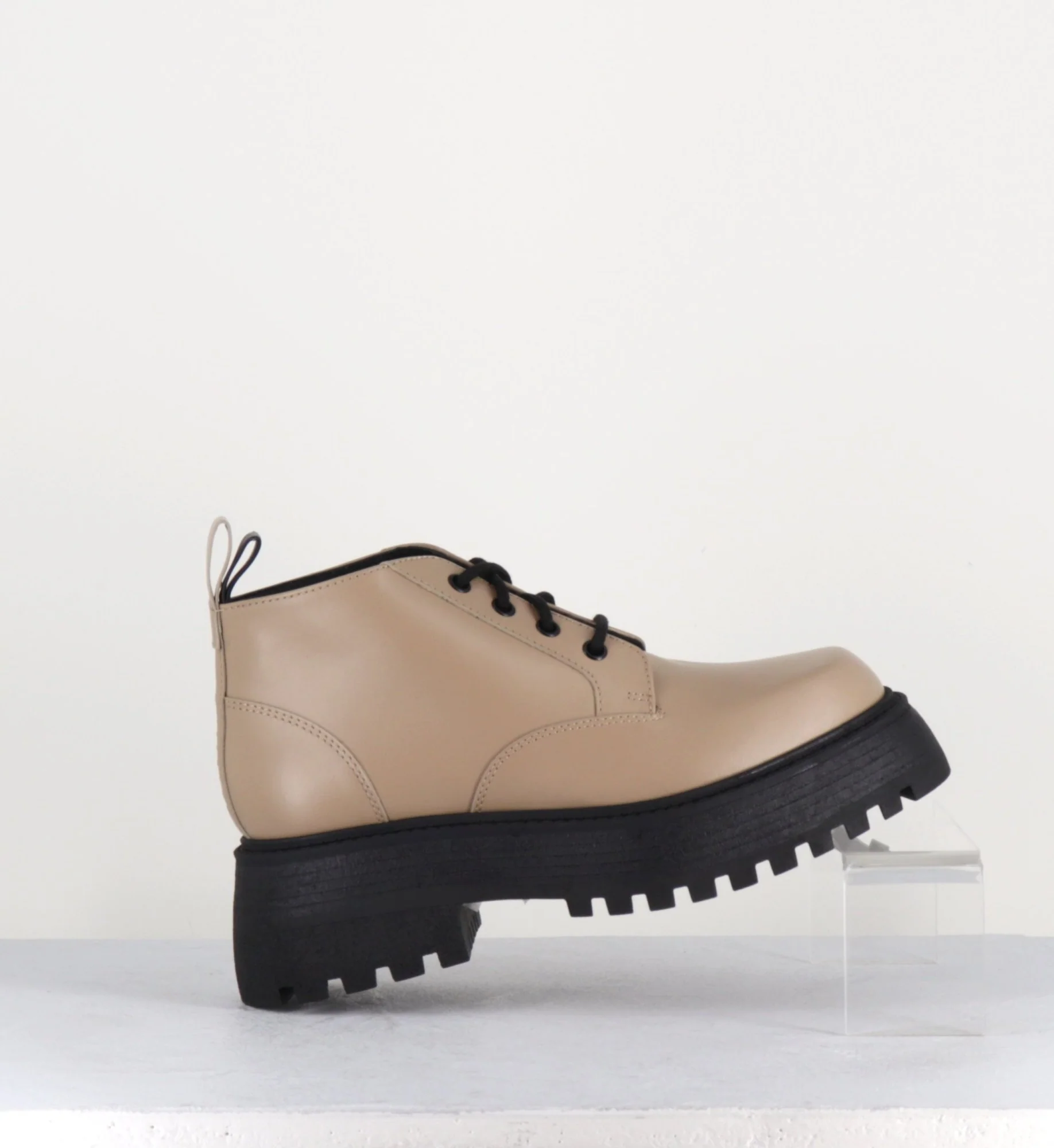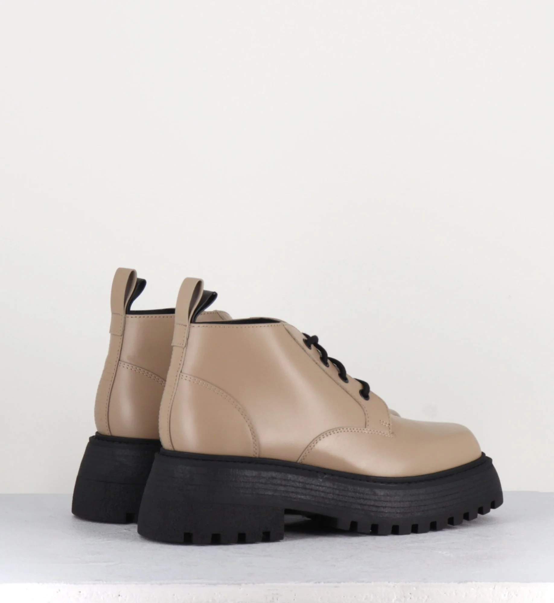 Chaussures chunky bout carré à lacets en cuir lisse couleur beige-taupe, montées sur une semelle épaisse en gomme noire, 90s style Fabrication Artisanale Italienne – Ateliers 3juin Chausse plutôt grand