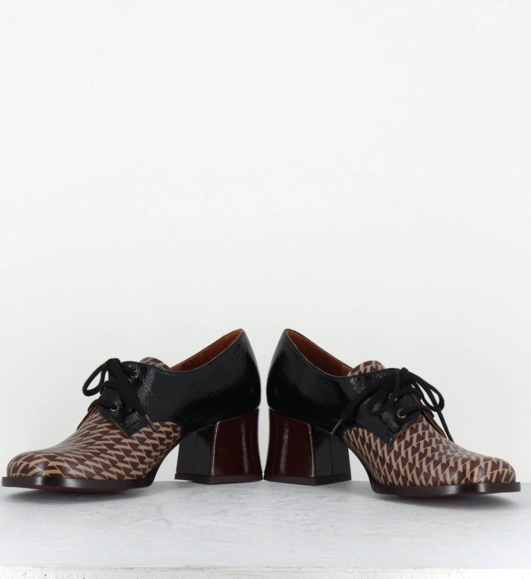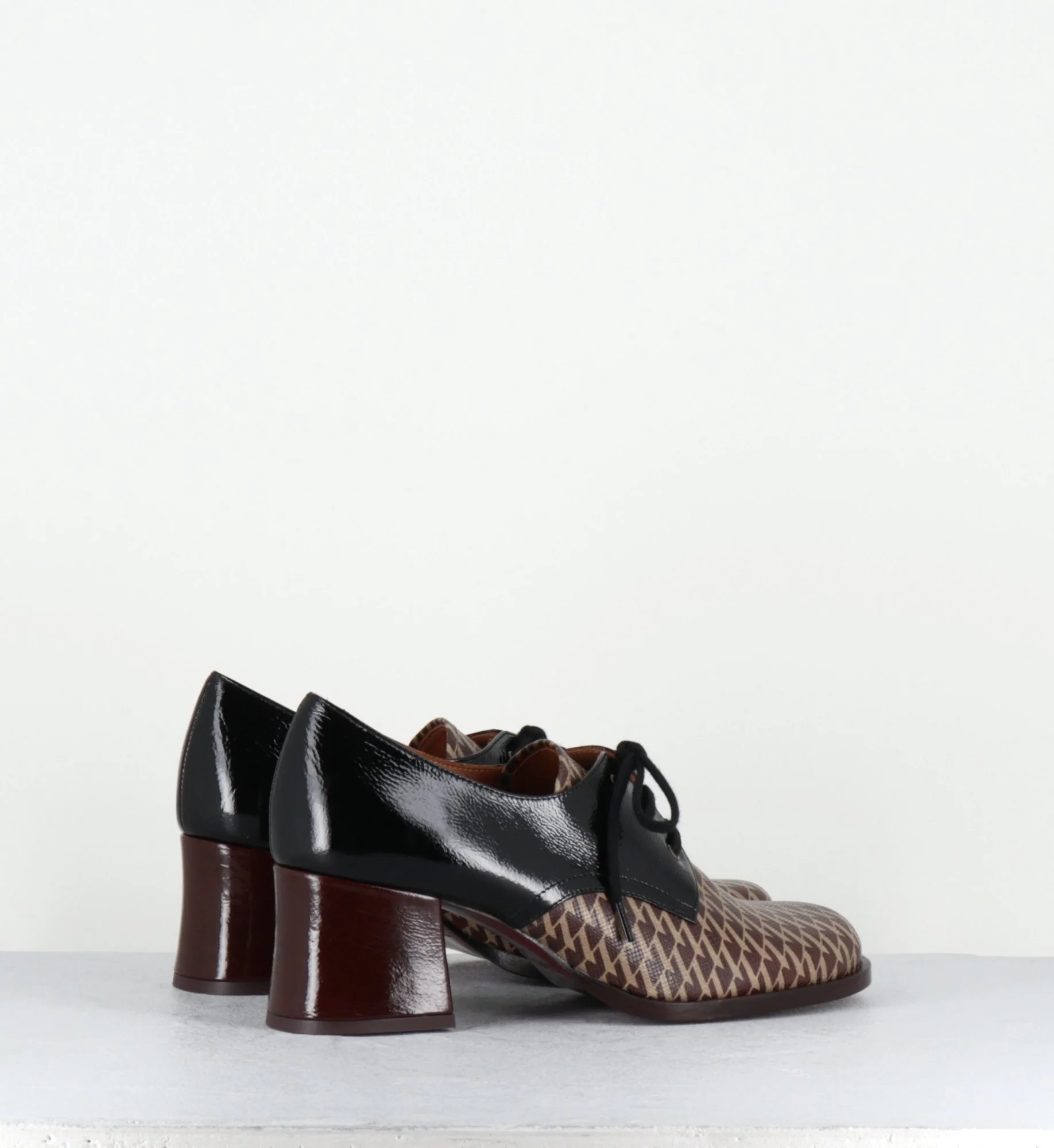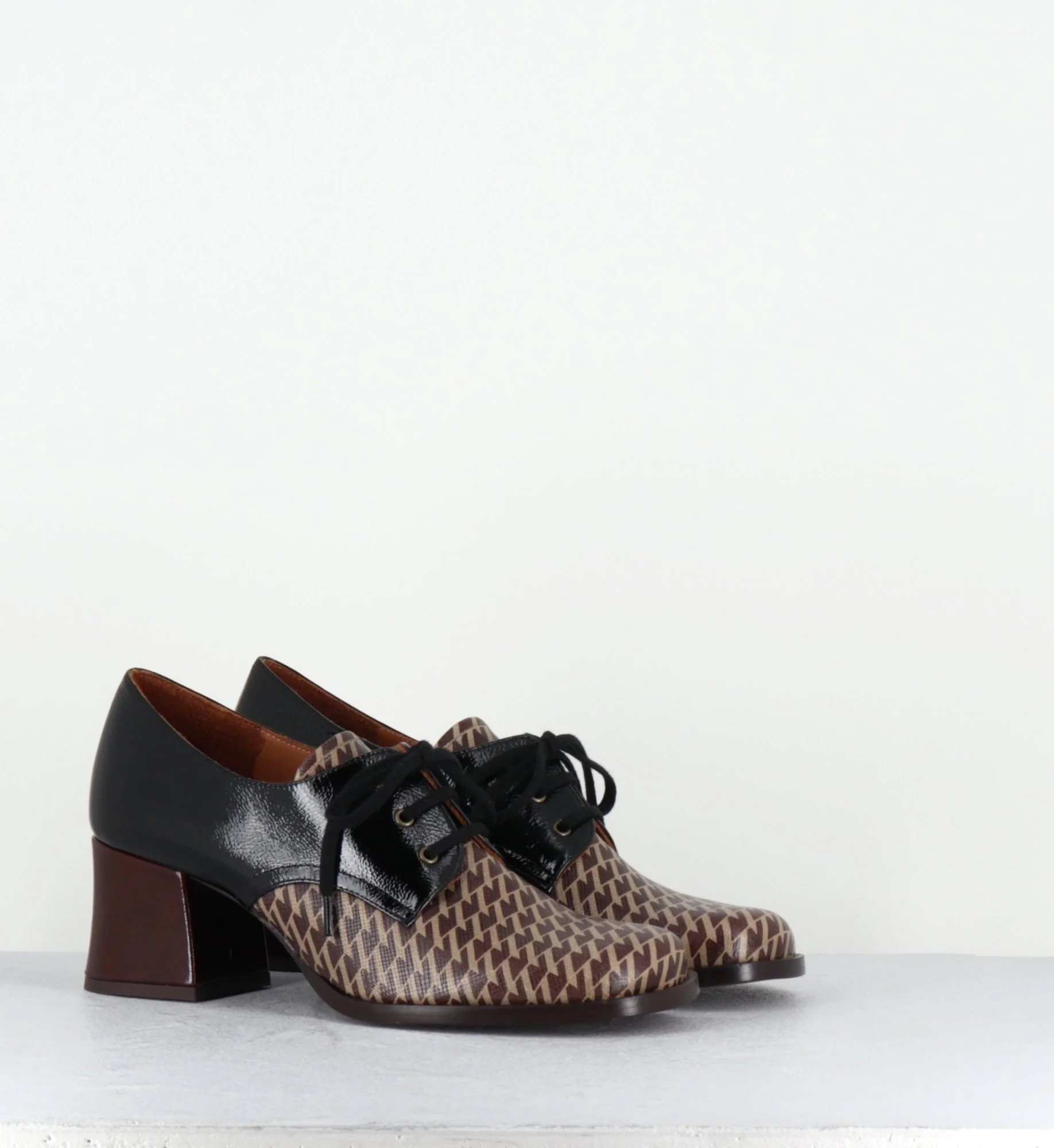 Chaussures à lacets en cuir gaufré imprimé pied-de-poule marron, bout carré arrondi, montées sur un petit talon rétro légèrement évasé recouvert de cuir vernis marron Fabrication Artisanale Espagnole – Ateliers Chie Mihara Chausse un peu grand