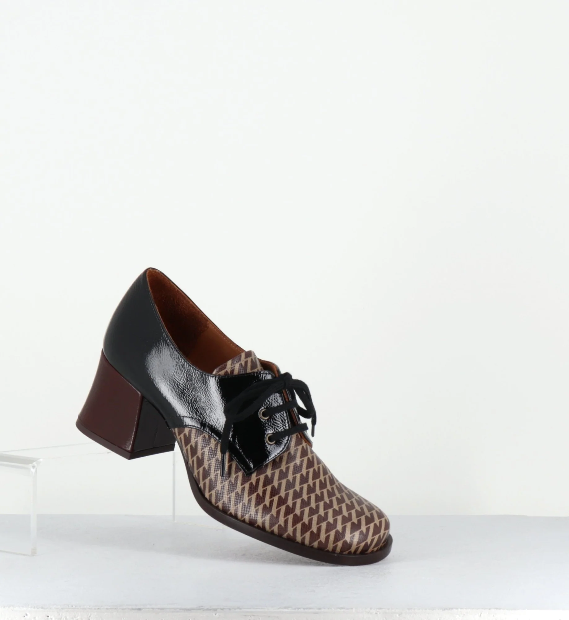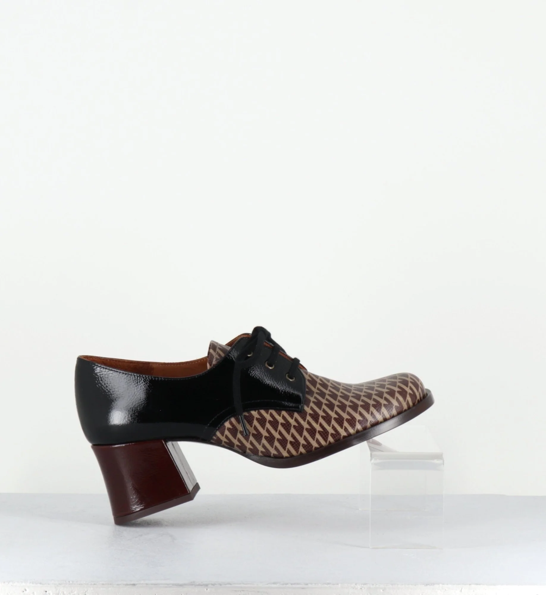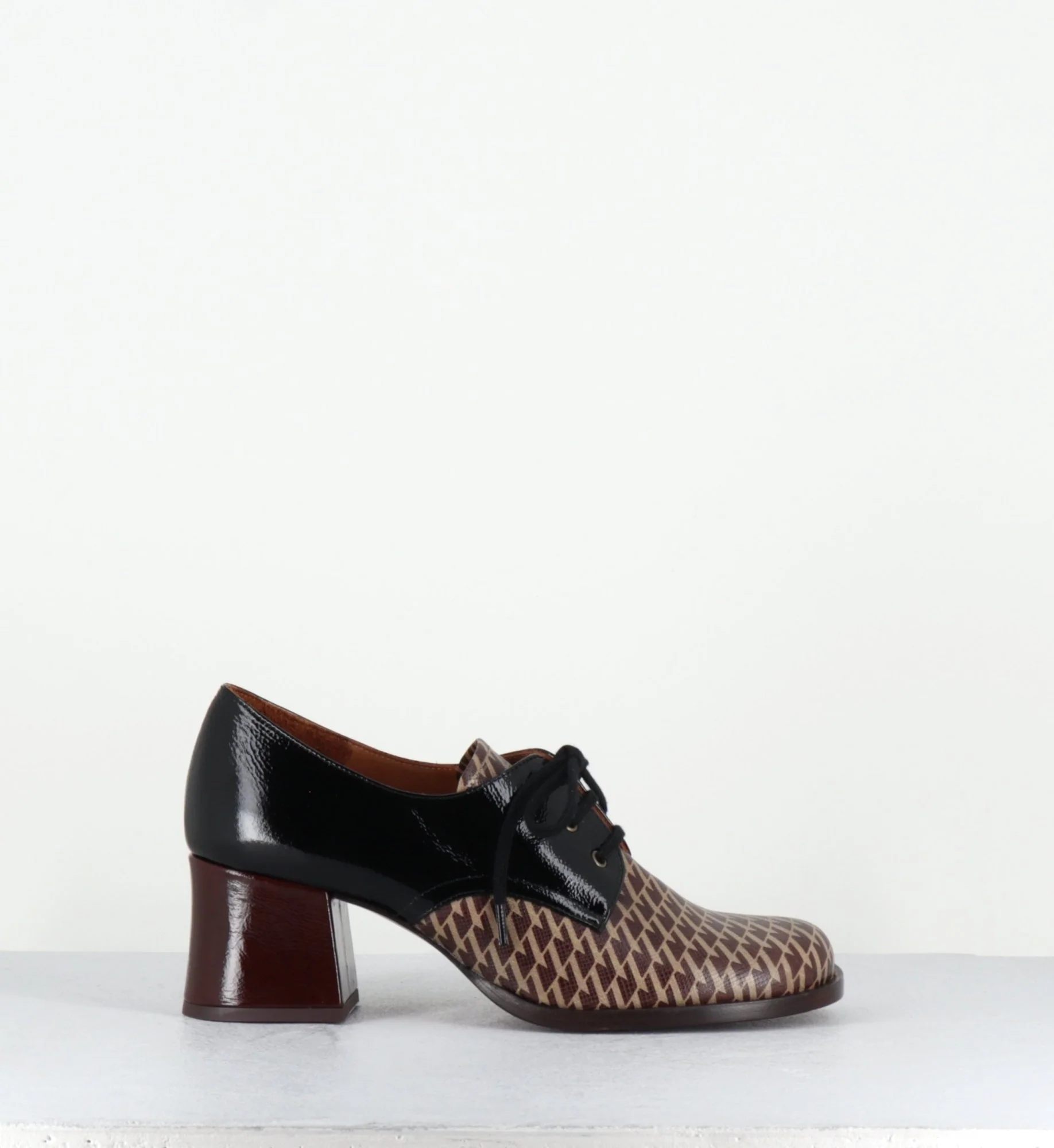 Chaussures à lacets en cuir gaufré imprimé pied-de-poule marron, bout carré arrondi, montées sur un petit talon rétro légèrement évasé recouvert de cuir vernis marron Fabrication Artisanale Espagnole – Ateliers Chie Mihara Chausse un peu grand