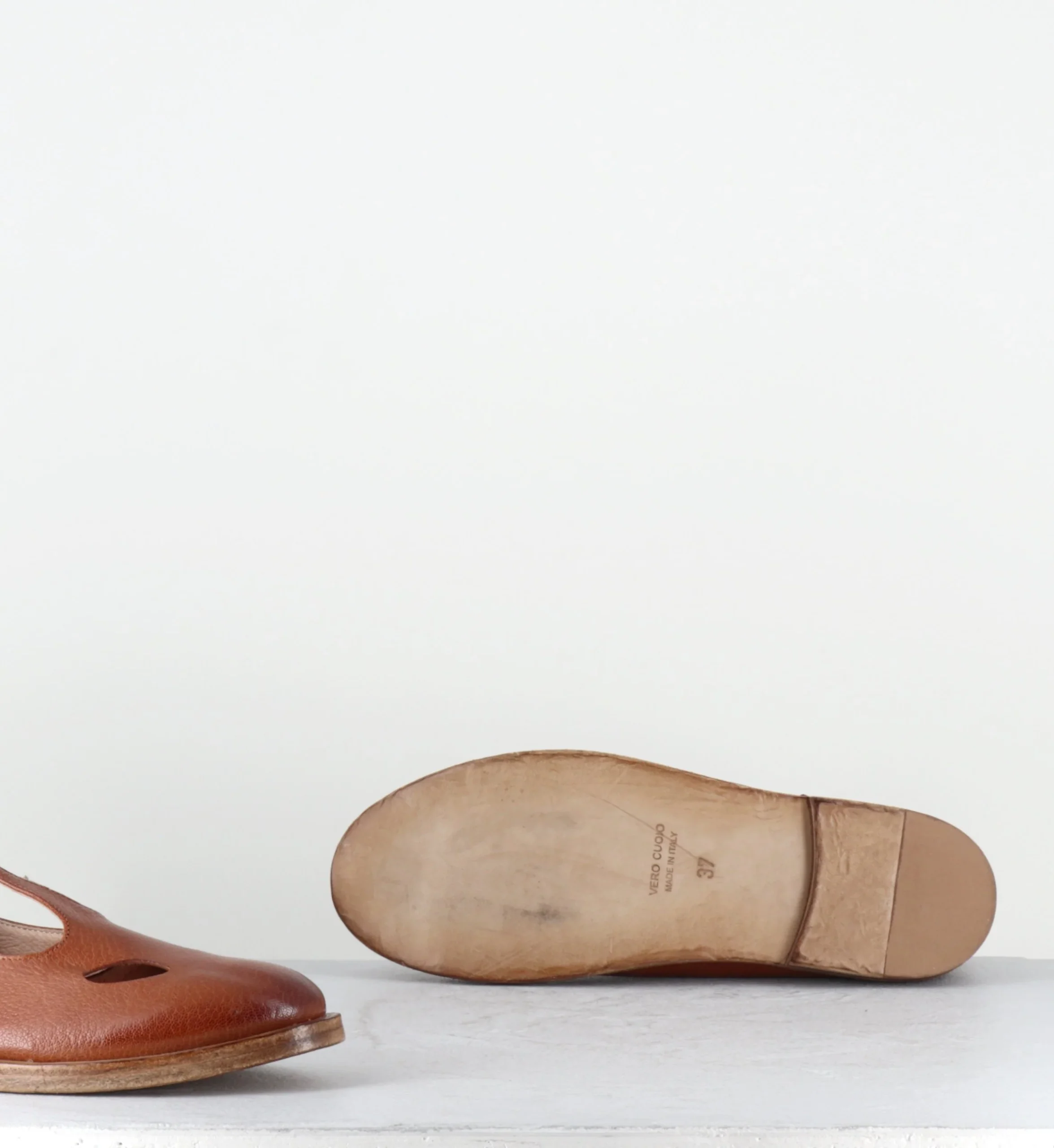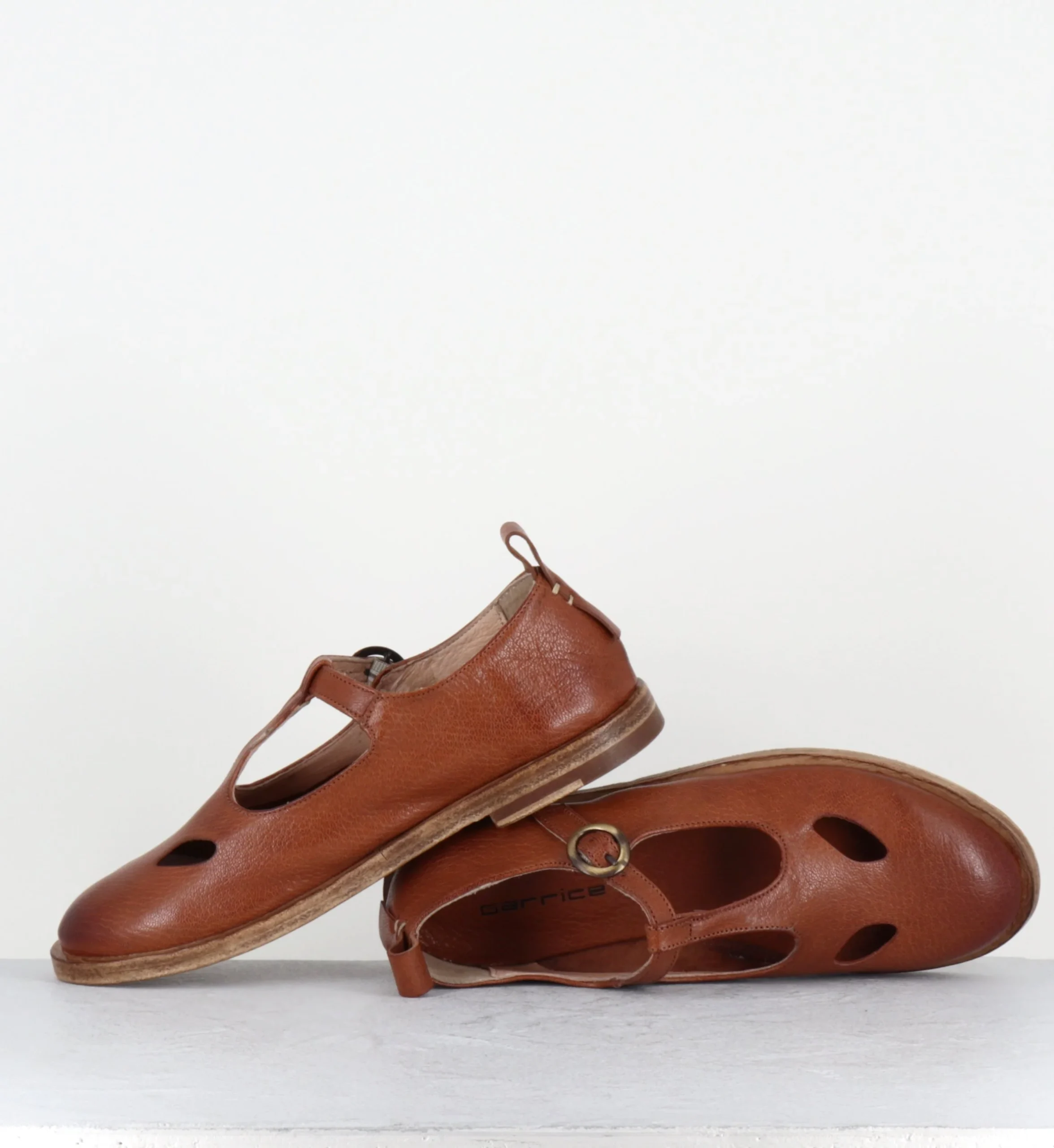Chaussures Mary-Jane en cuir camel légèrement brossé pour un effet ‘vintage’, montés sur une semelle en cuir légère et souple Fabrication Artisanale Italienne – Ateliers GarriceLab Chausse légèrement grand