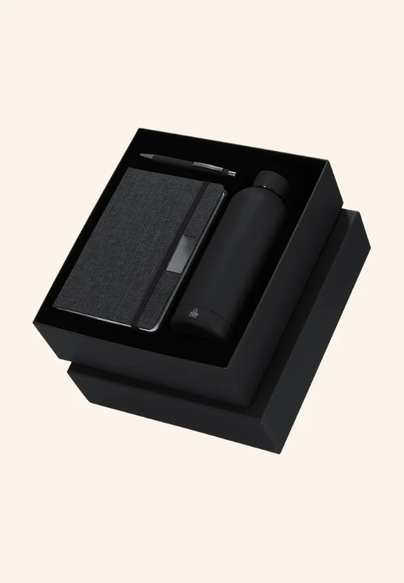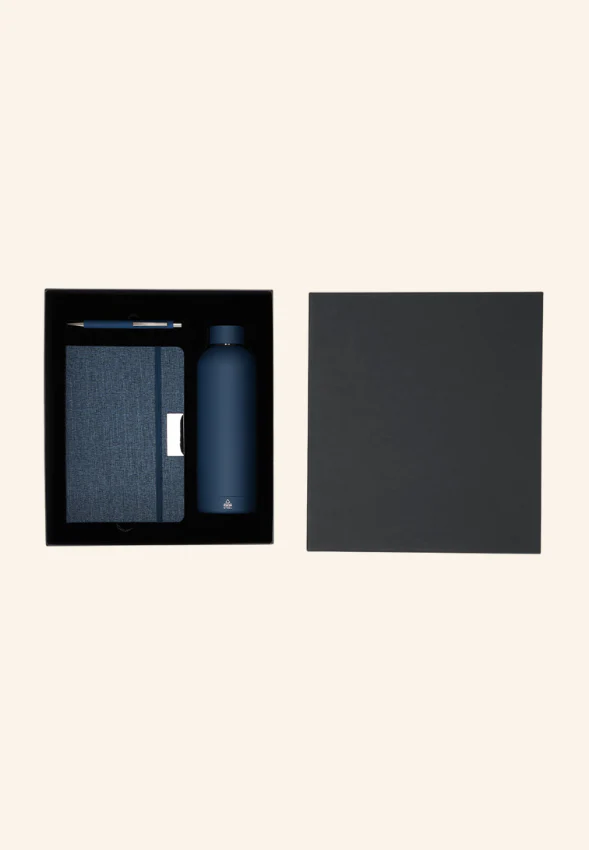 • Coffret complet avec bloc-notes, stylo et bouteille thermique pour un usage quotidien.