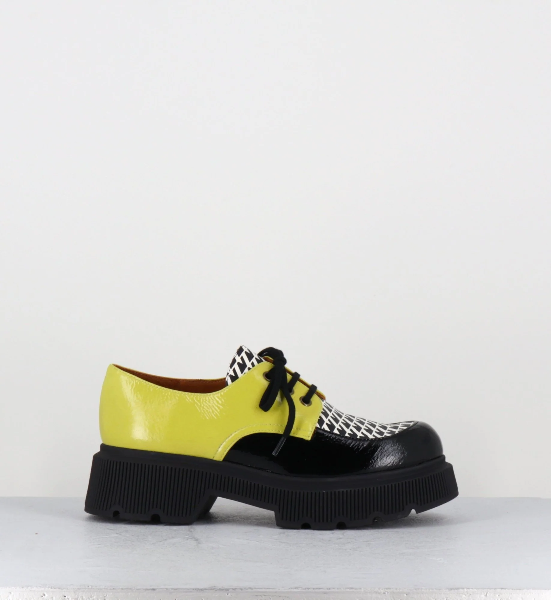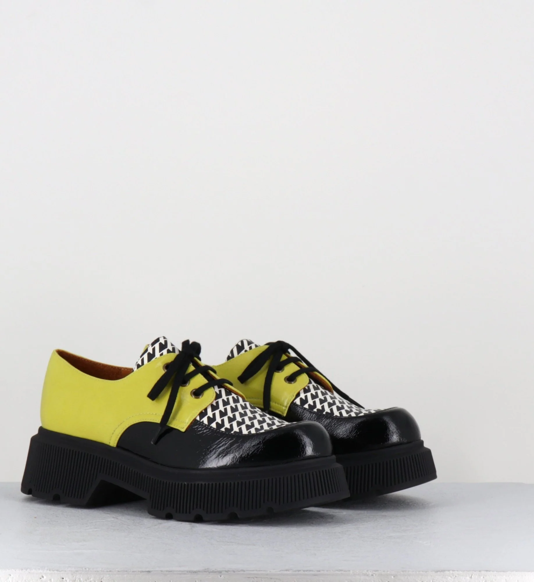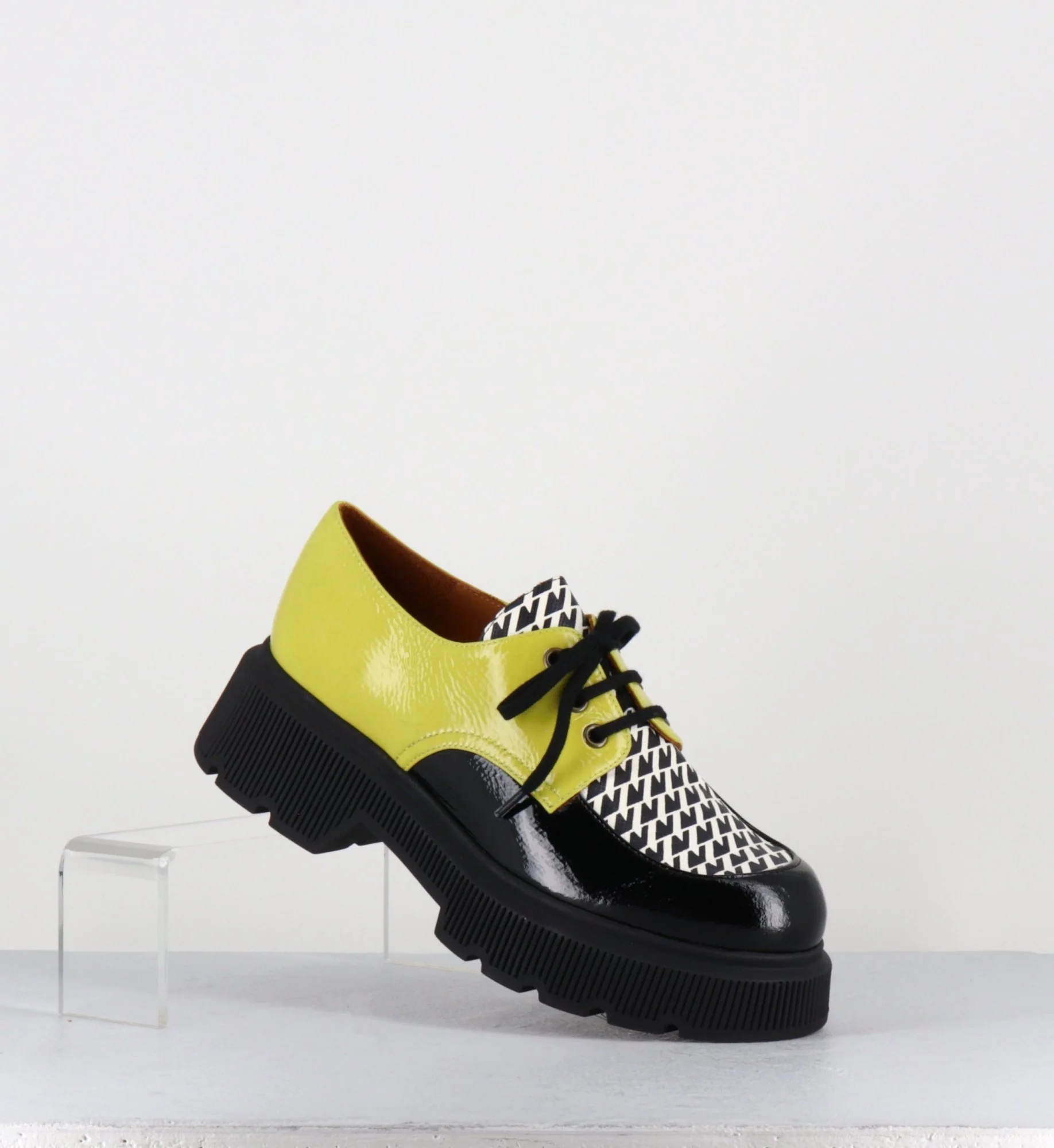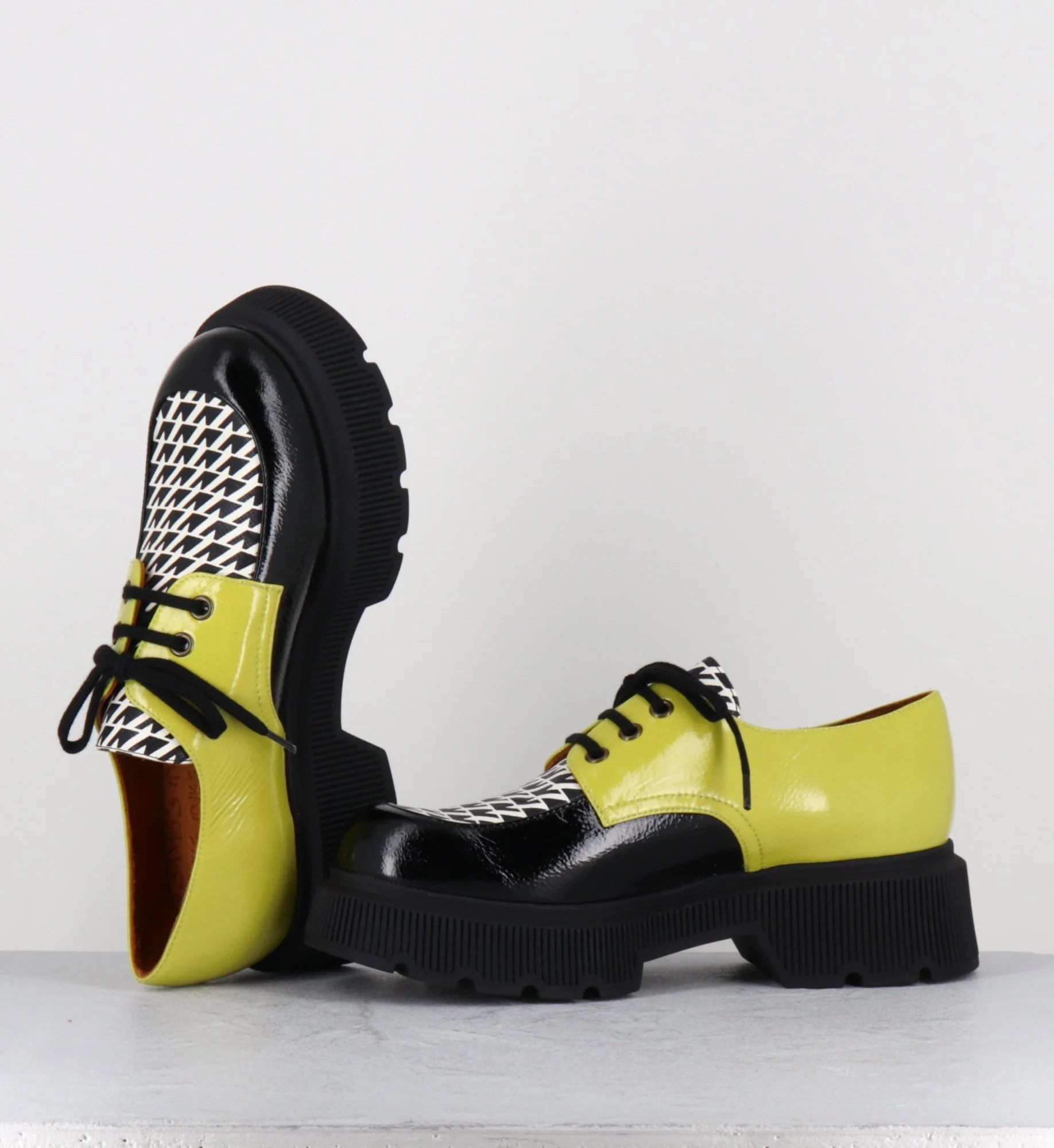 Chaussures derbies à lacets en cuir vernis souple noir et jaune avec empeigne à l’avant imprimé pied-de-poule noir & blanc, montées sur une semelle épaisse en gomme légère Fabrication Artisanale Espagnole – Atelies Chie Mihara Chausse légèrement grand