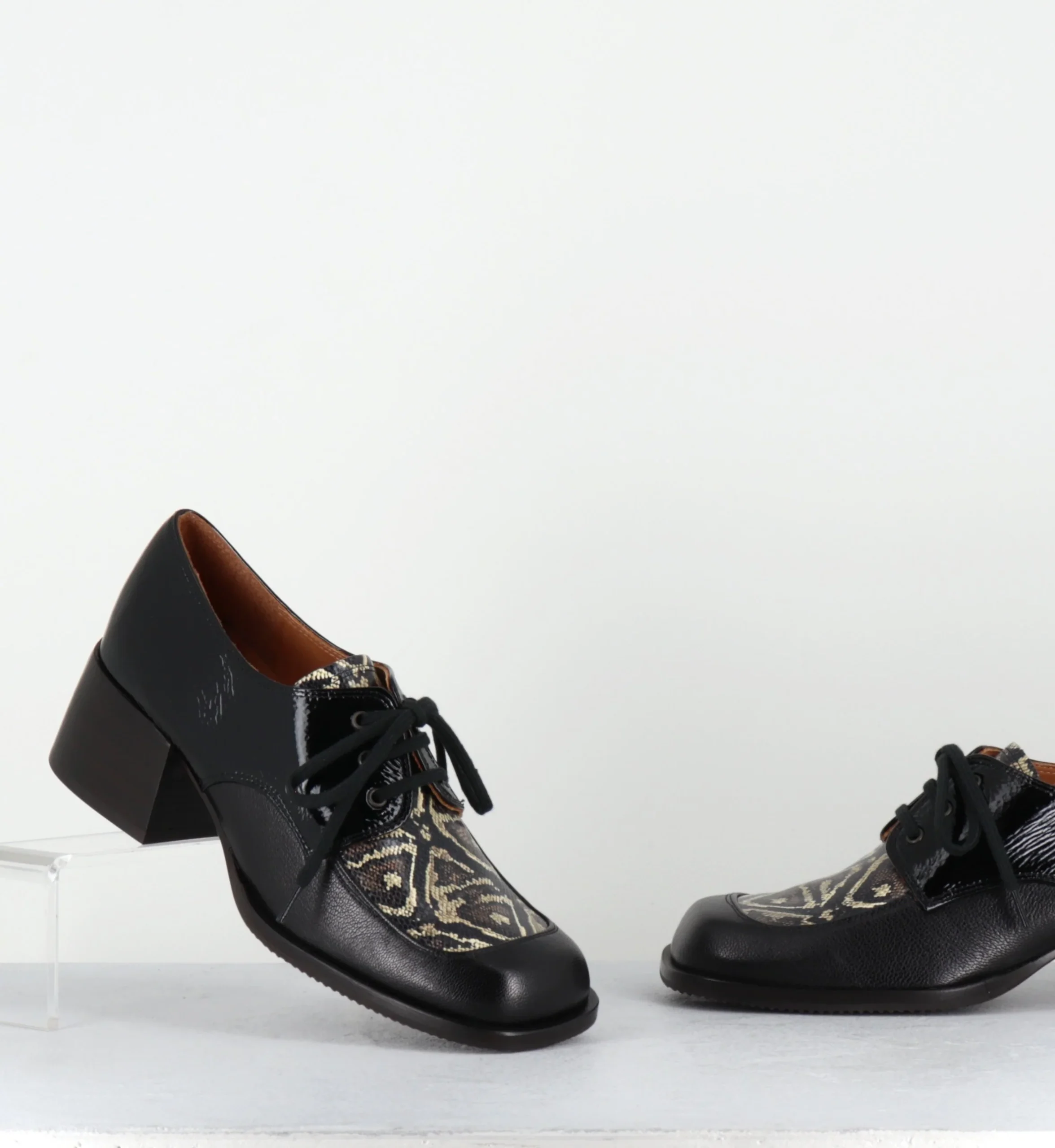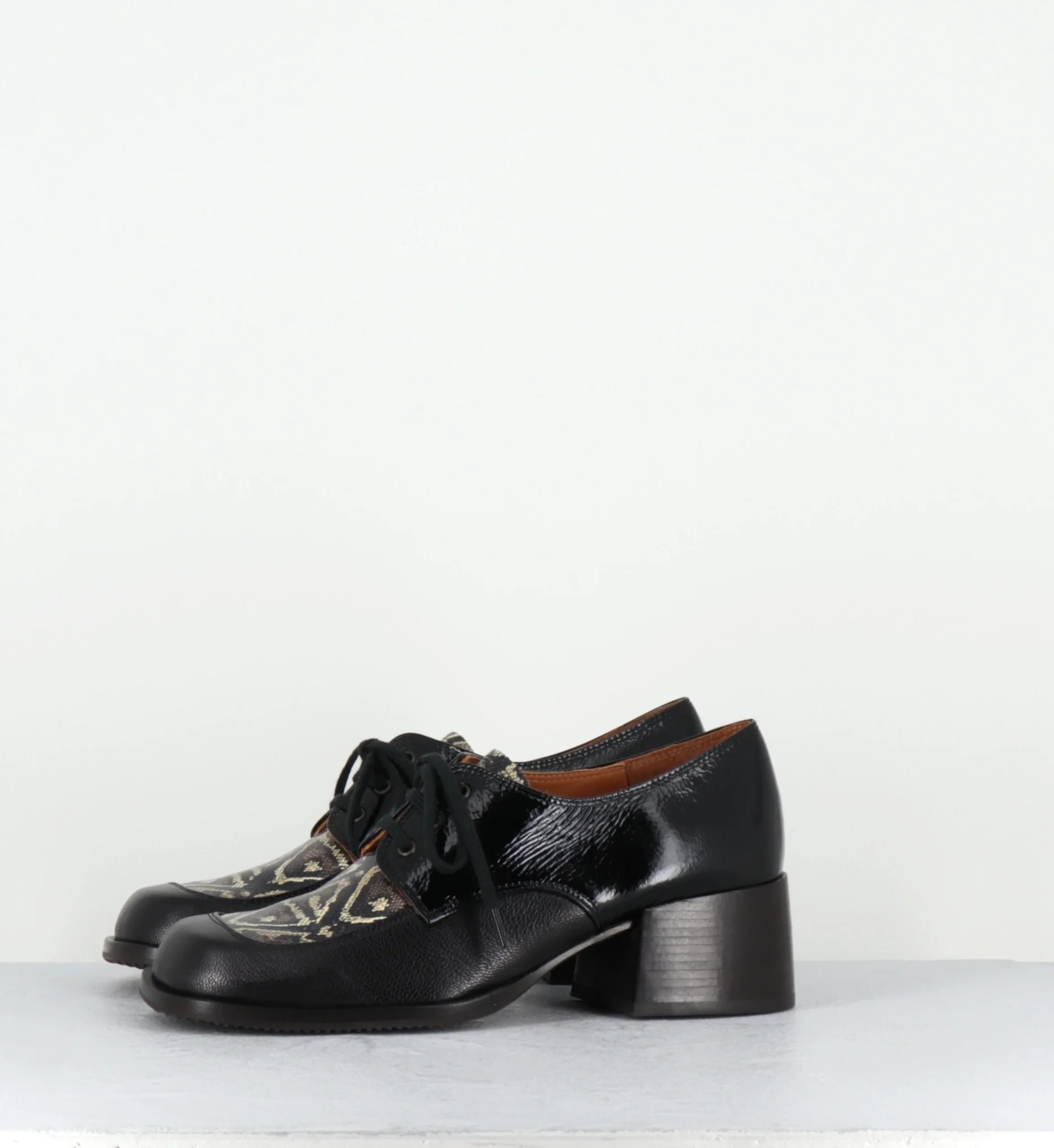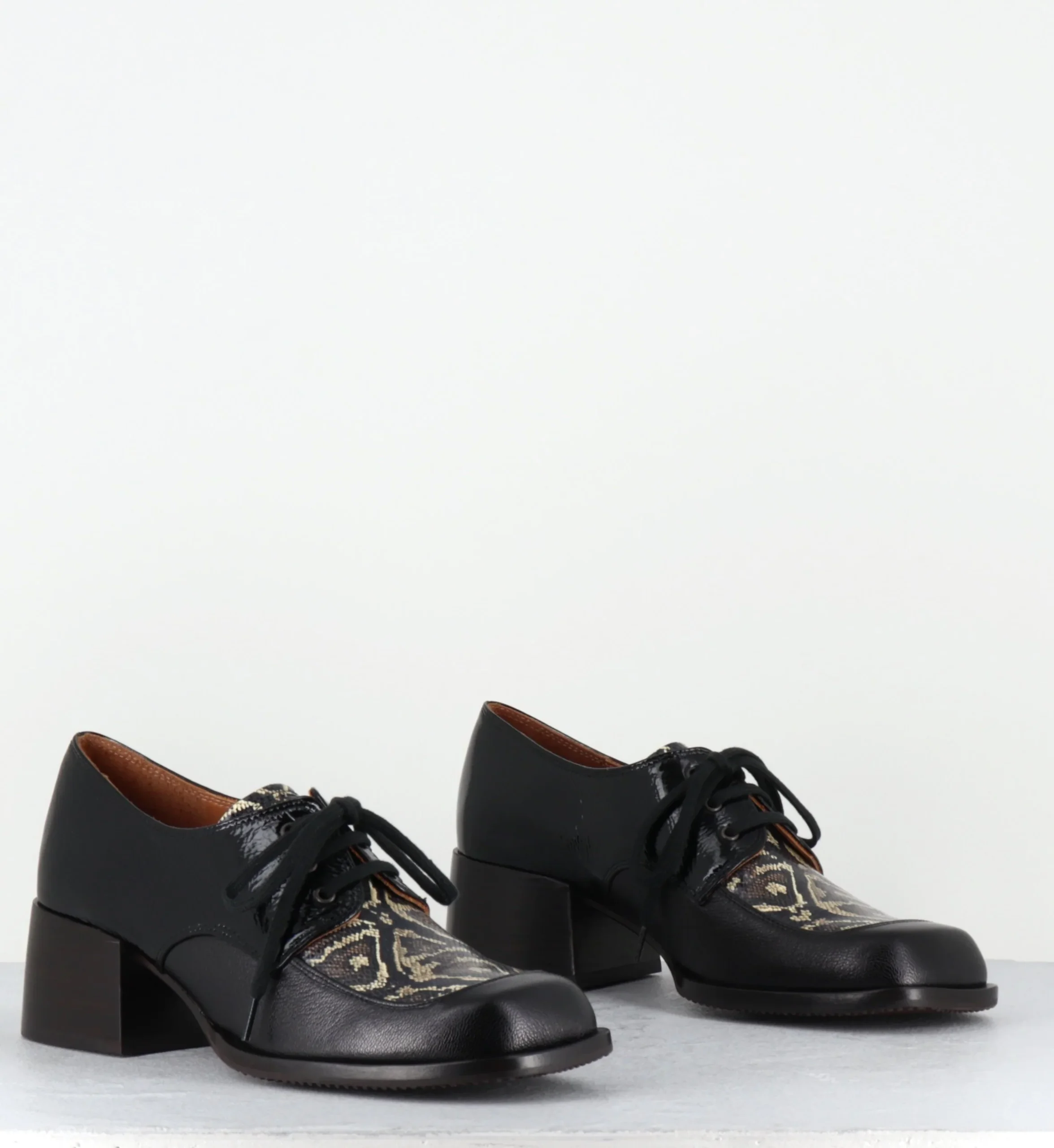 Derby à lacets bout carré en cuir & vernis noir, imprimé animal sur l’empeigne, montés sur un petit talon large confortable esprit 70s Fabrication Artisanale Espagnol – Ateliers Chie Mihara Chausse grand