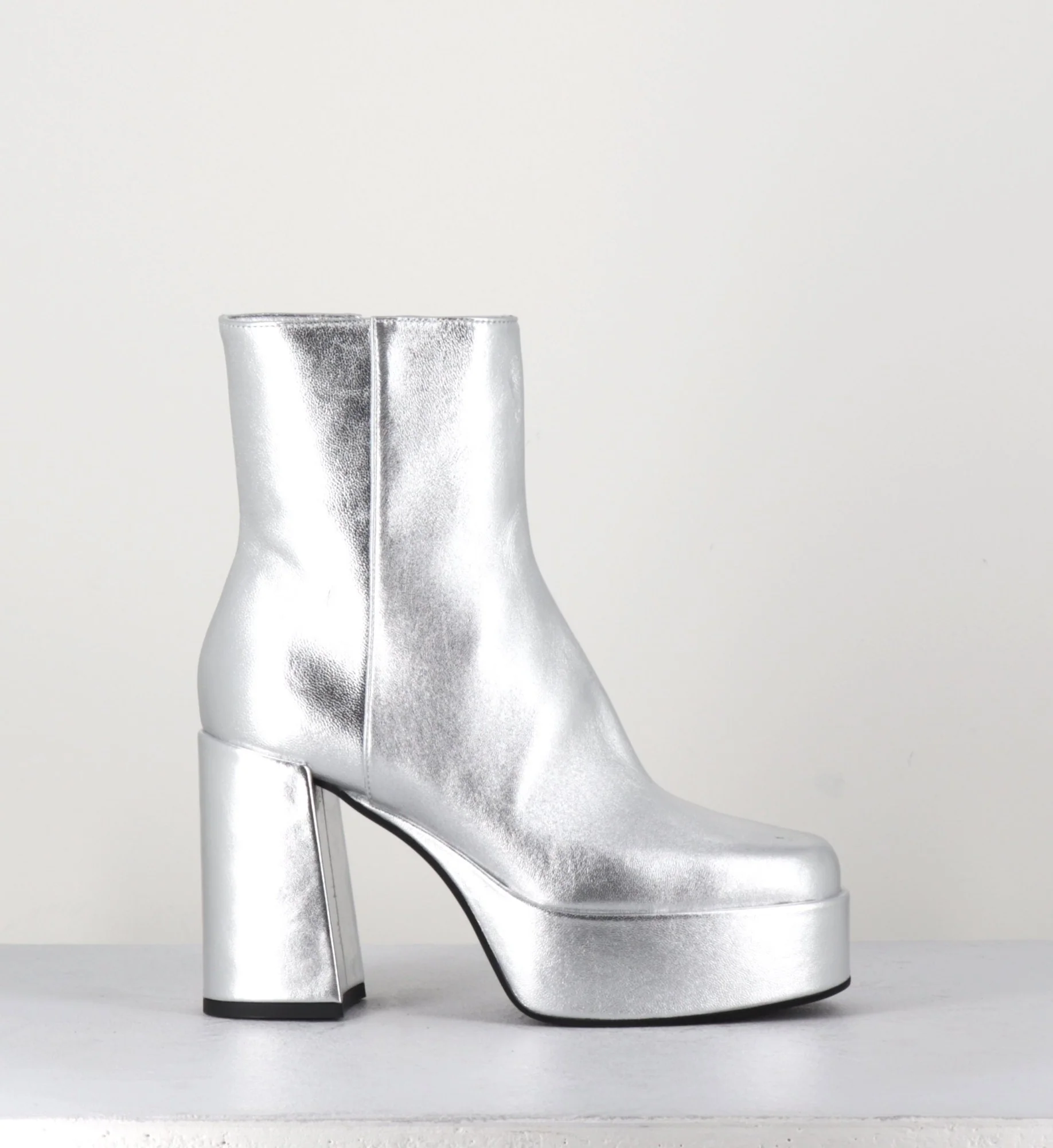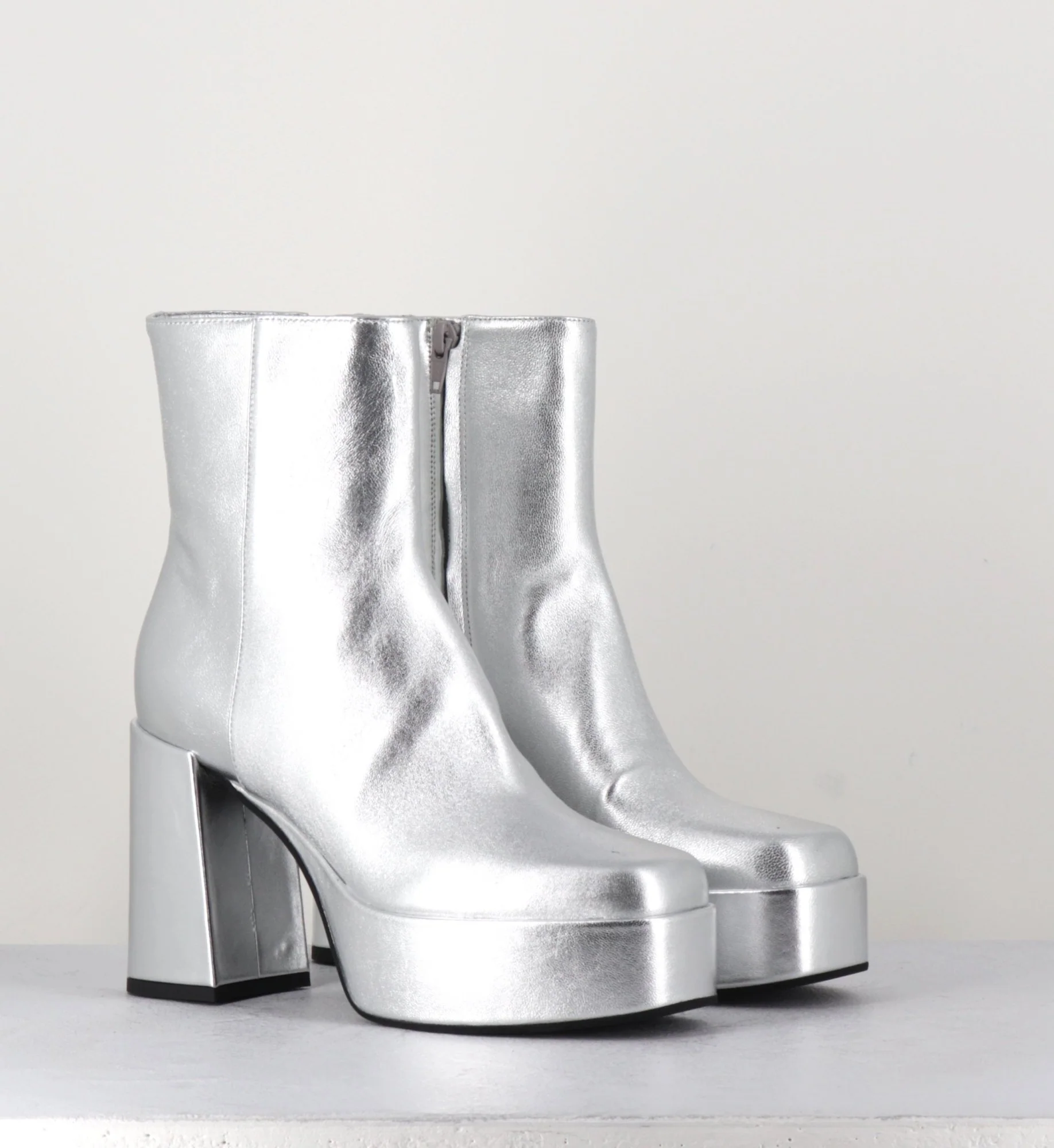 Boots à plateforme 70s en cuir métallisé argent, bout carré arrondi, montées sur un talon large légèrement évasé look rétro