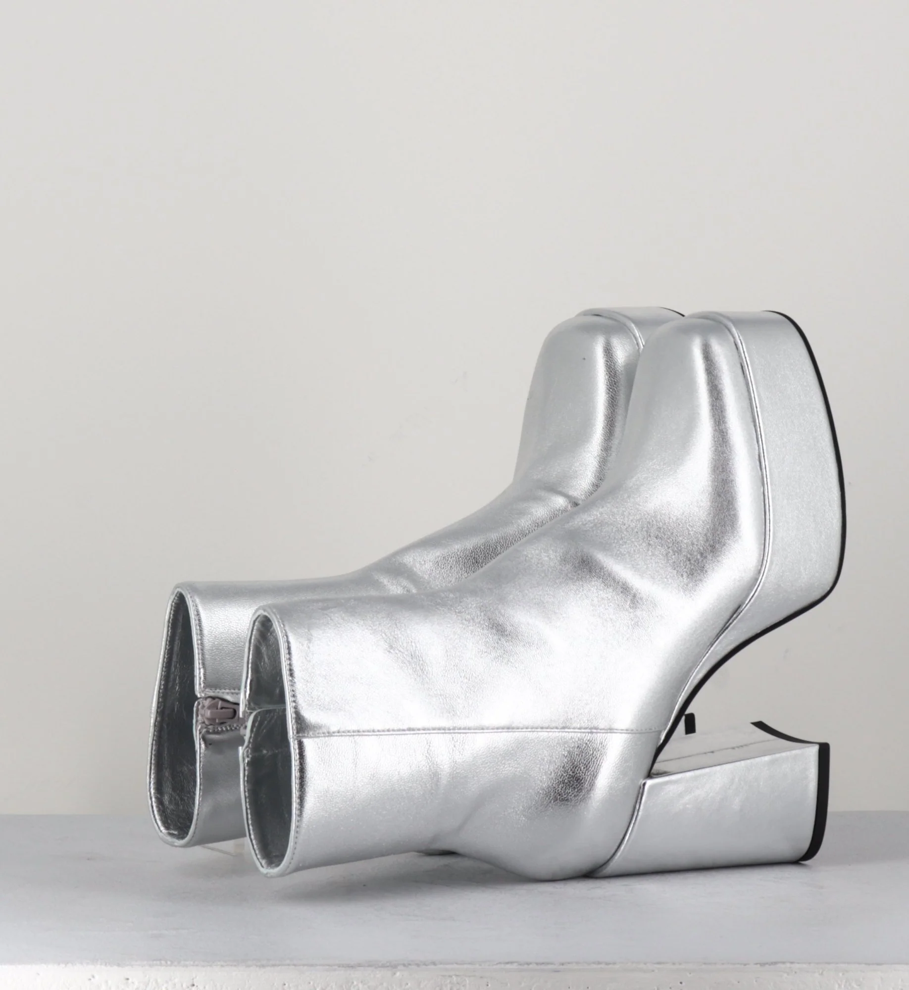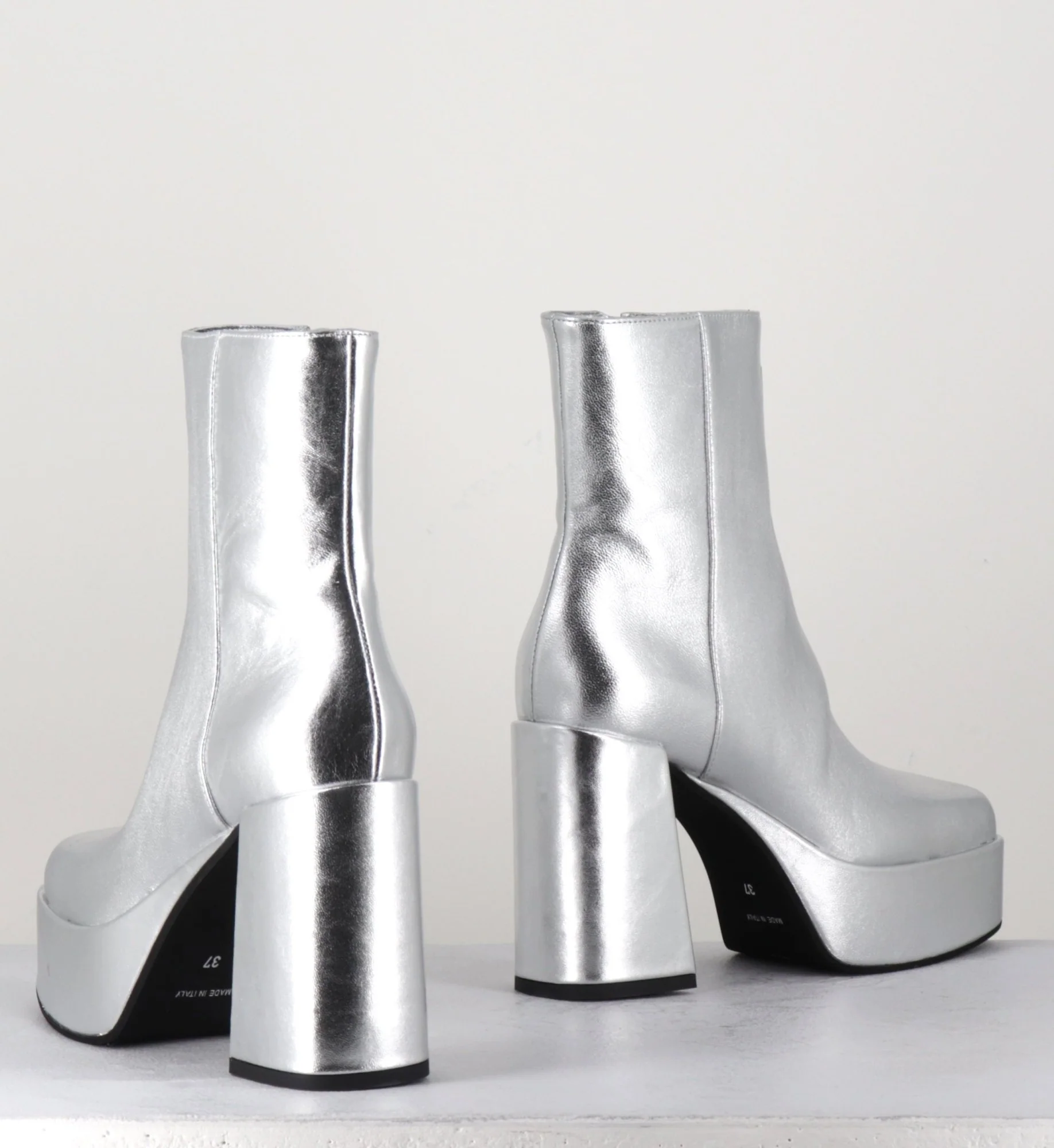 Boots à plateforme 70s en cuir métallisé argent, bout carré arrondi, montées sur un talon large légèrement évasé look rétro Fabrication Artisanale Italienne – Ateliers GarriceLab Chausse légèrement grand