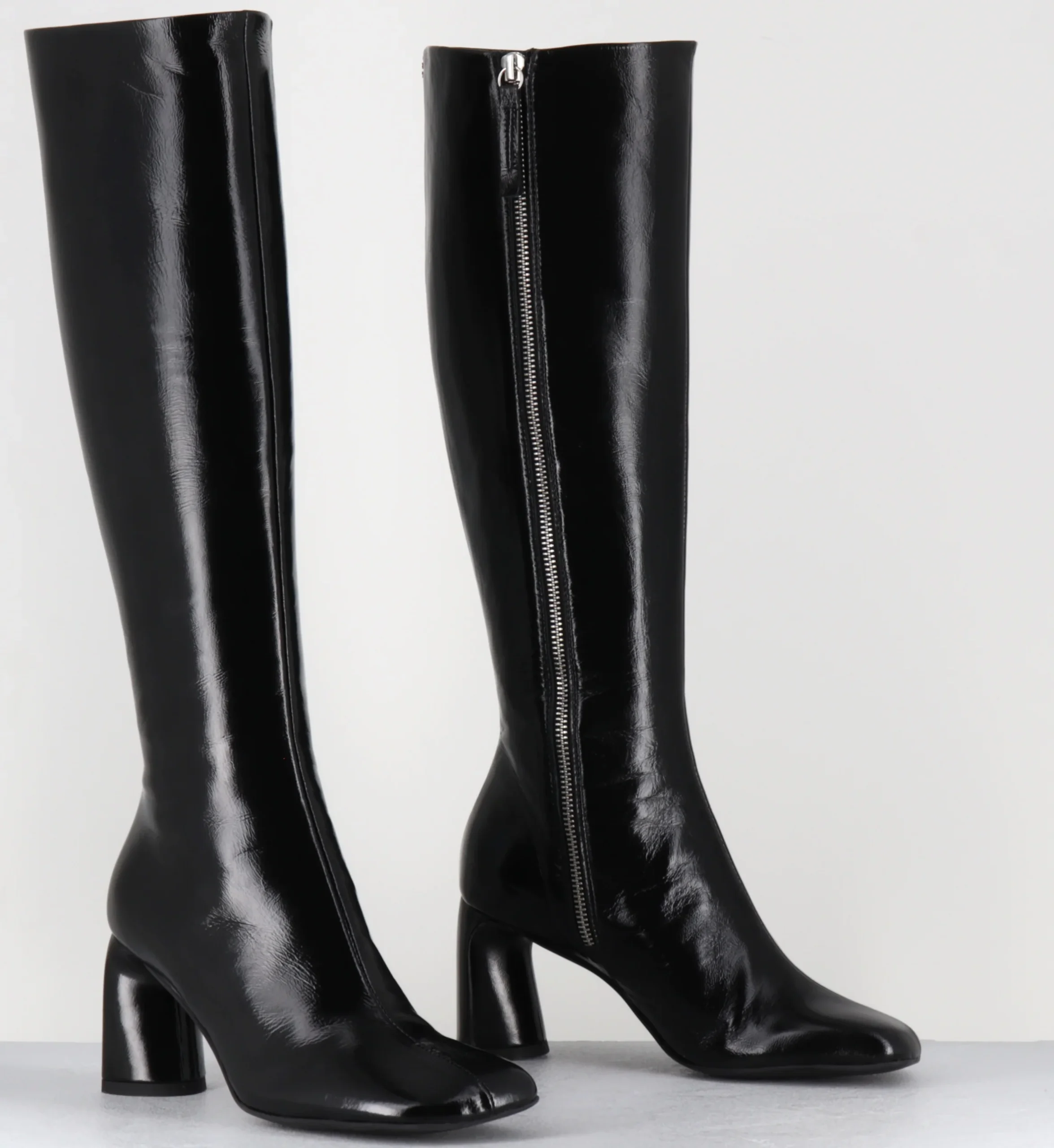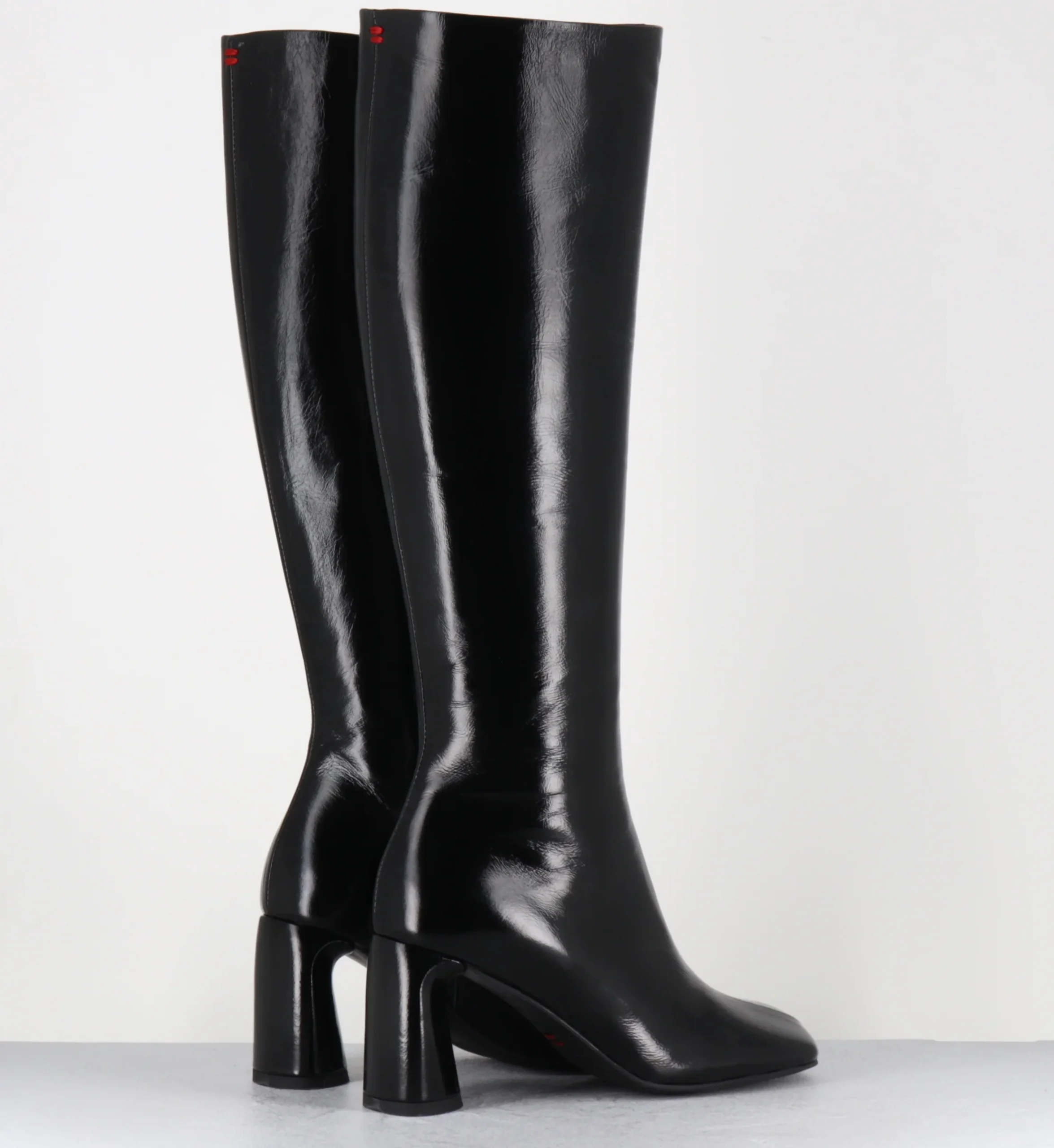 Bottes en cuir noir brillant et souple, bout carré, ligne esprit 70s, montées sur un talon stylisé Fabrication Artisanale Italienne – Ateliers Halmanera Chausse légèrement grand