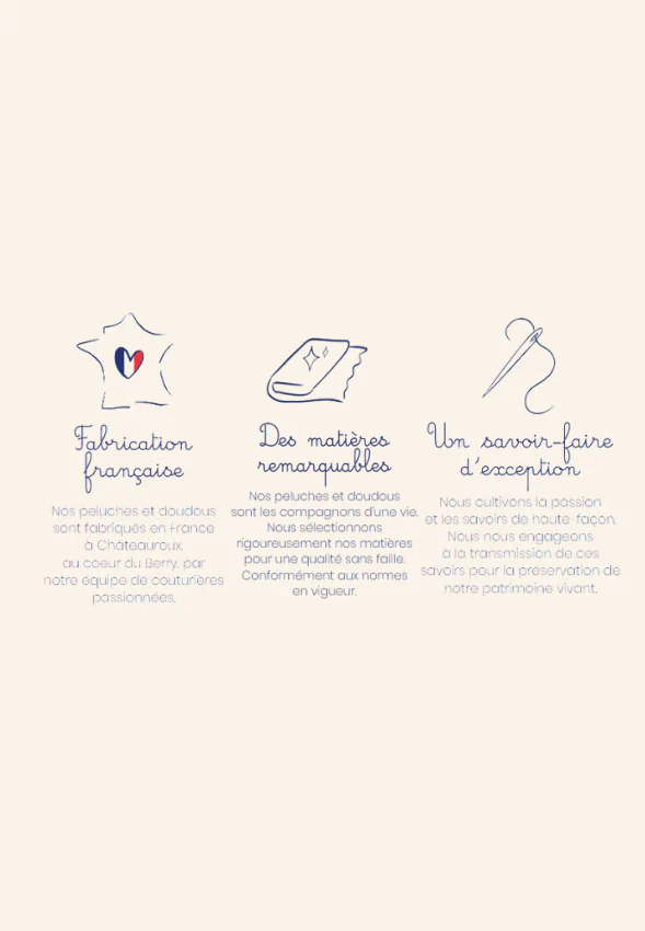 • Avec son design délicat et intemporel, Pitola est bien plus qu’un simple doudou : c’est un véritable ami pour la vie. Votre compagnon est fabriqué avec soin en France, dans le respect d’un savoir-faire de haute qualité.