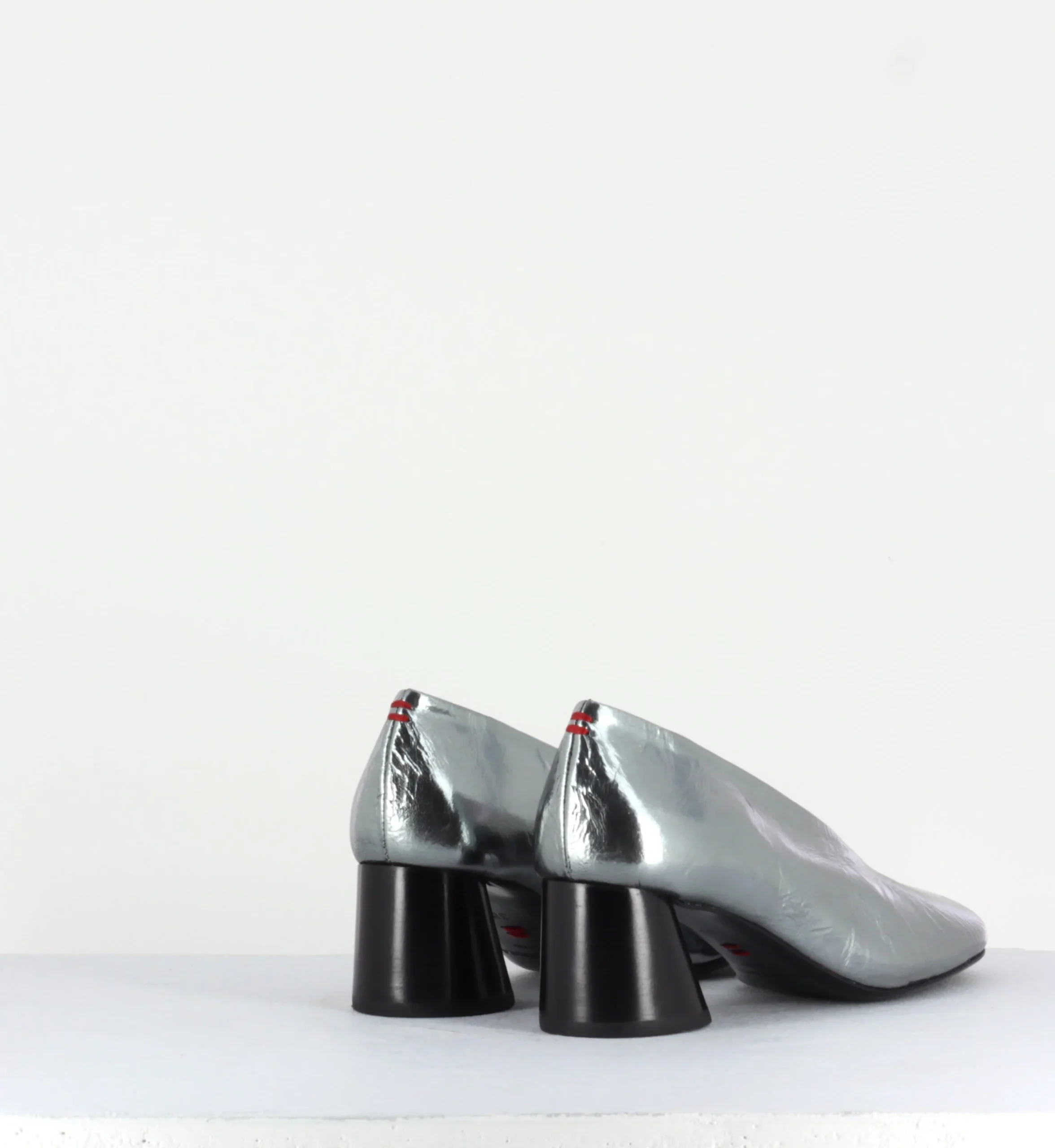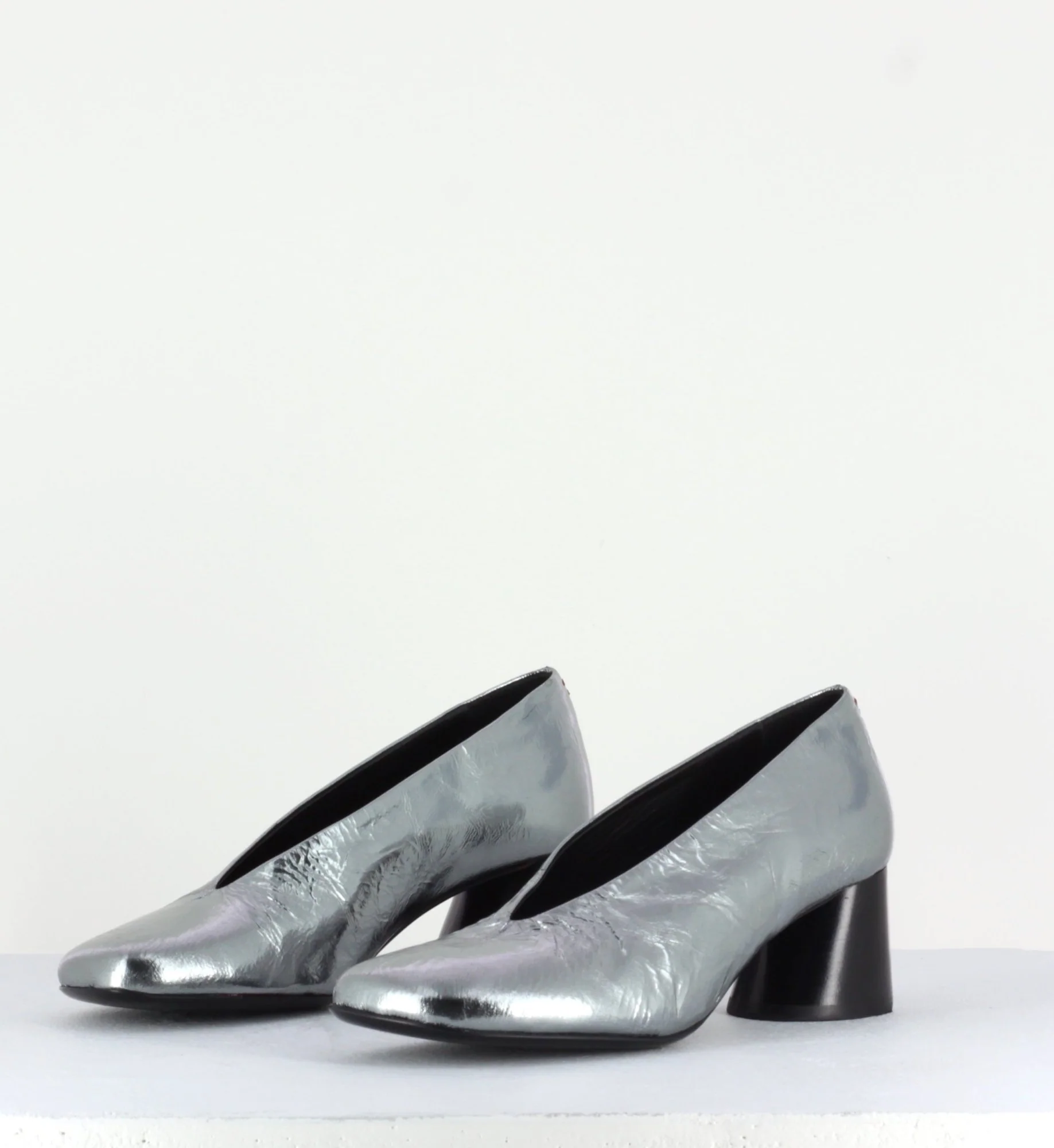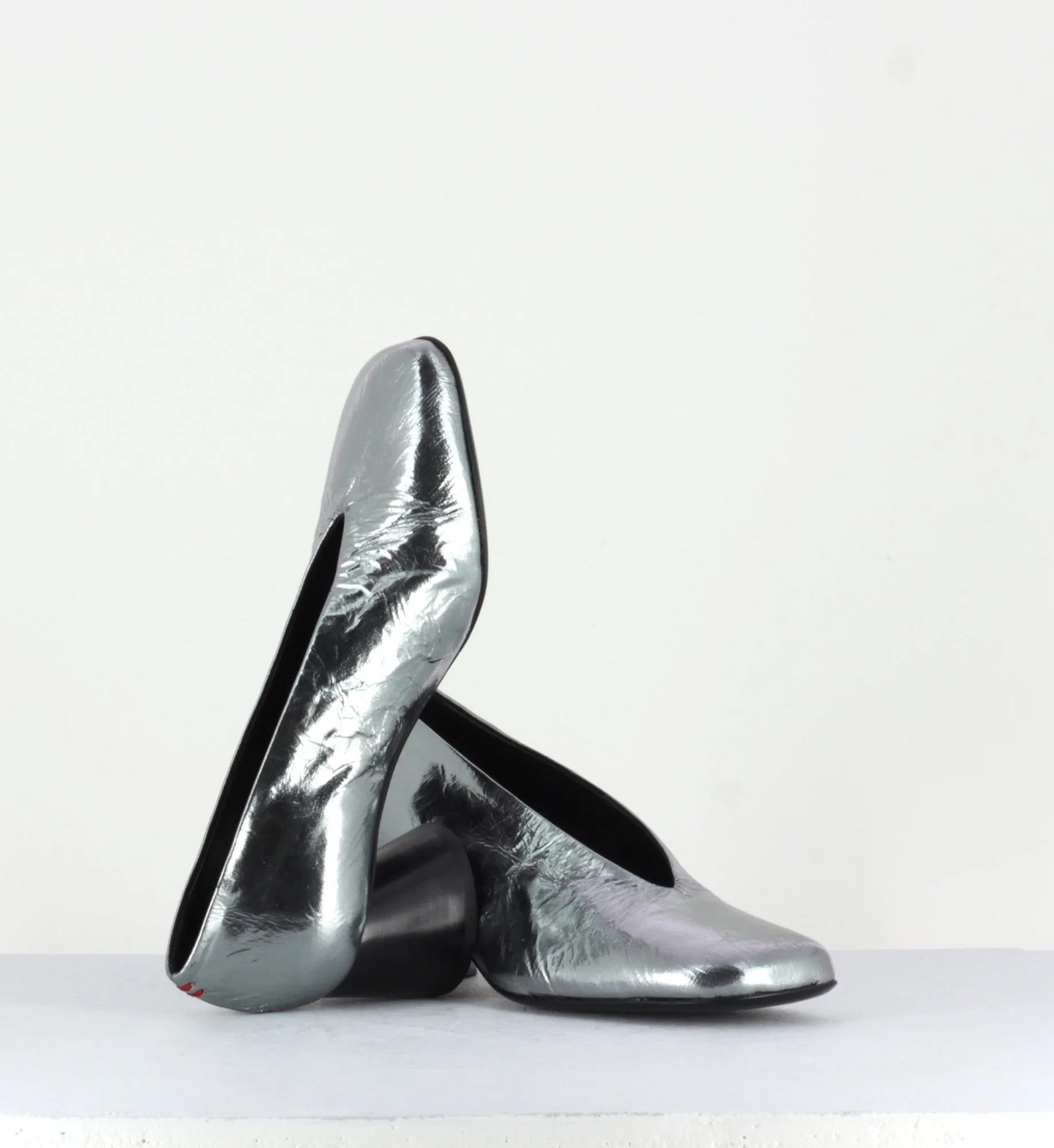 Escarpins en cuir froissé ultra souple métallisé argent, bout carré légèrement asymétrique et découpe en V, montées sur un petit talon à la structure légèrement évasé et peint à la main en noir