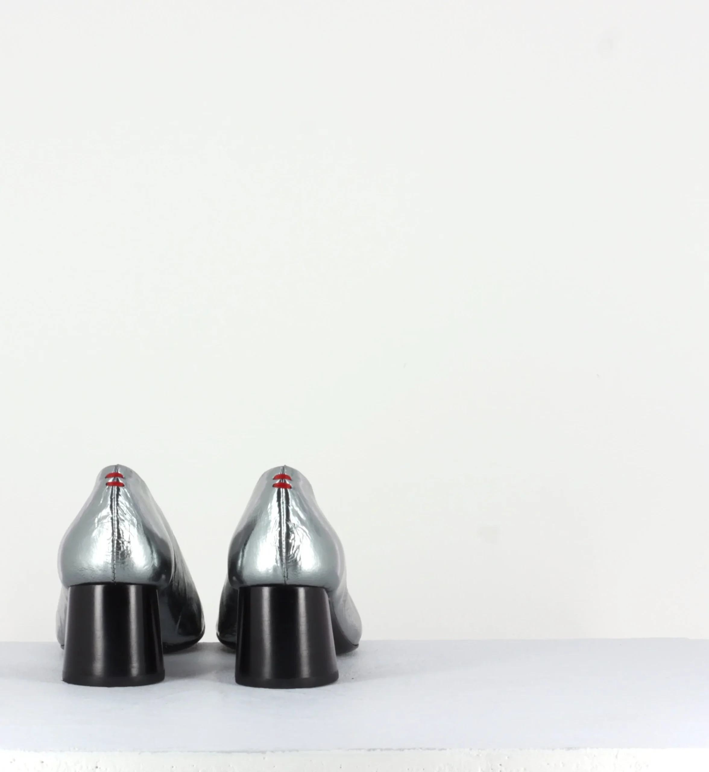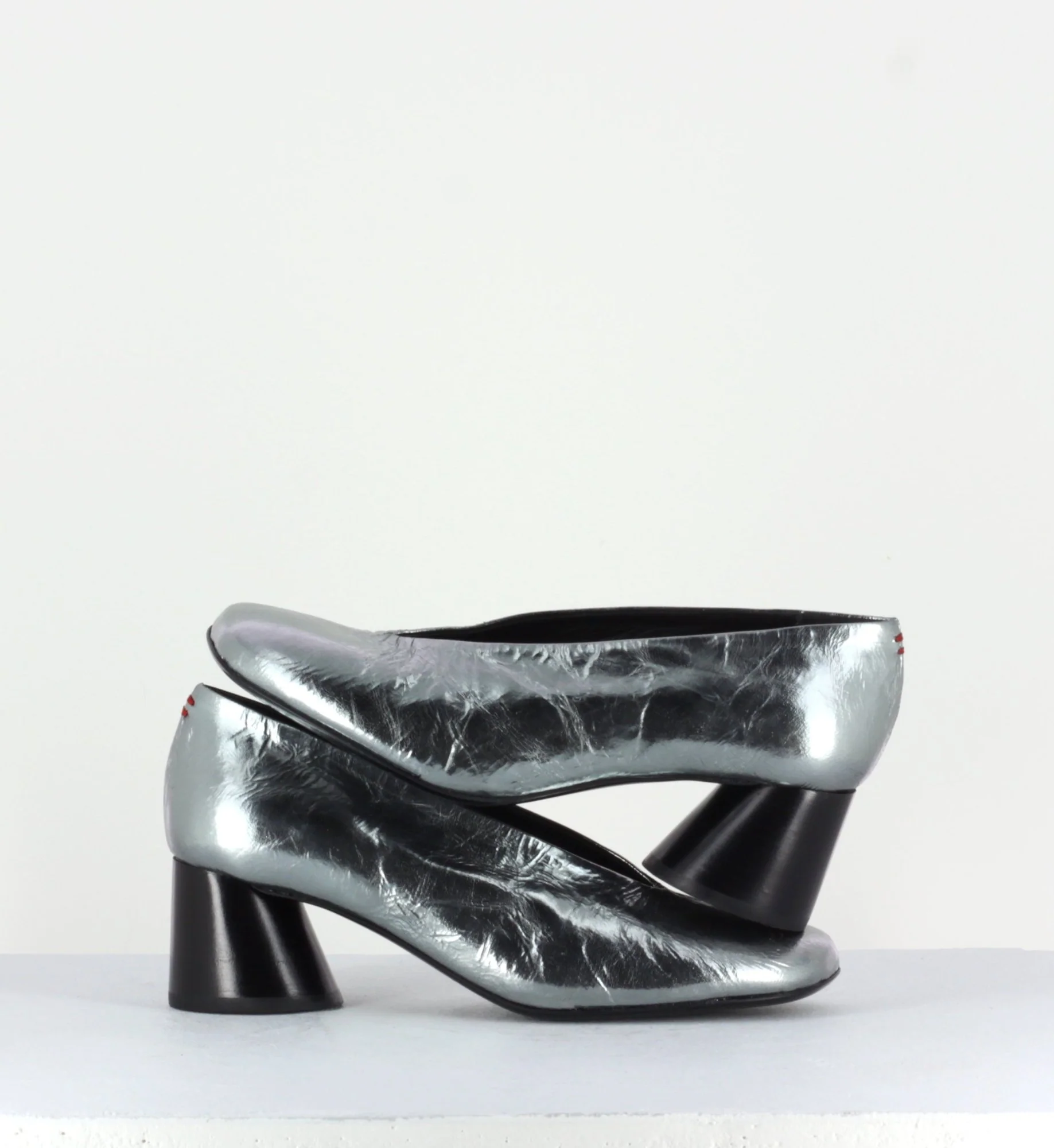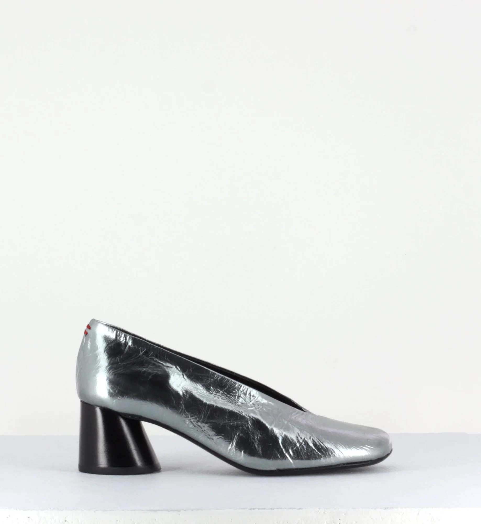 Escarpins en cuir froissé ultra souple métallisé argent, bout carré légèrement asymétrique et découpe en V, montées sur un petit talon à la structure légèrement évasé et peint à la main en noir