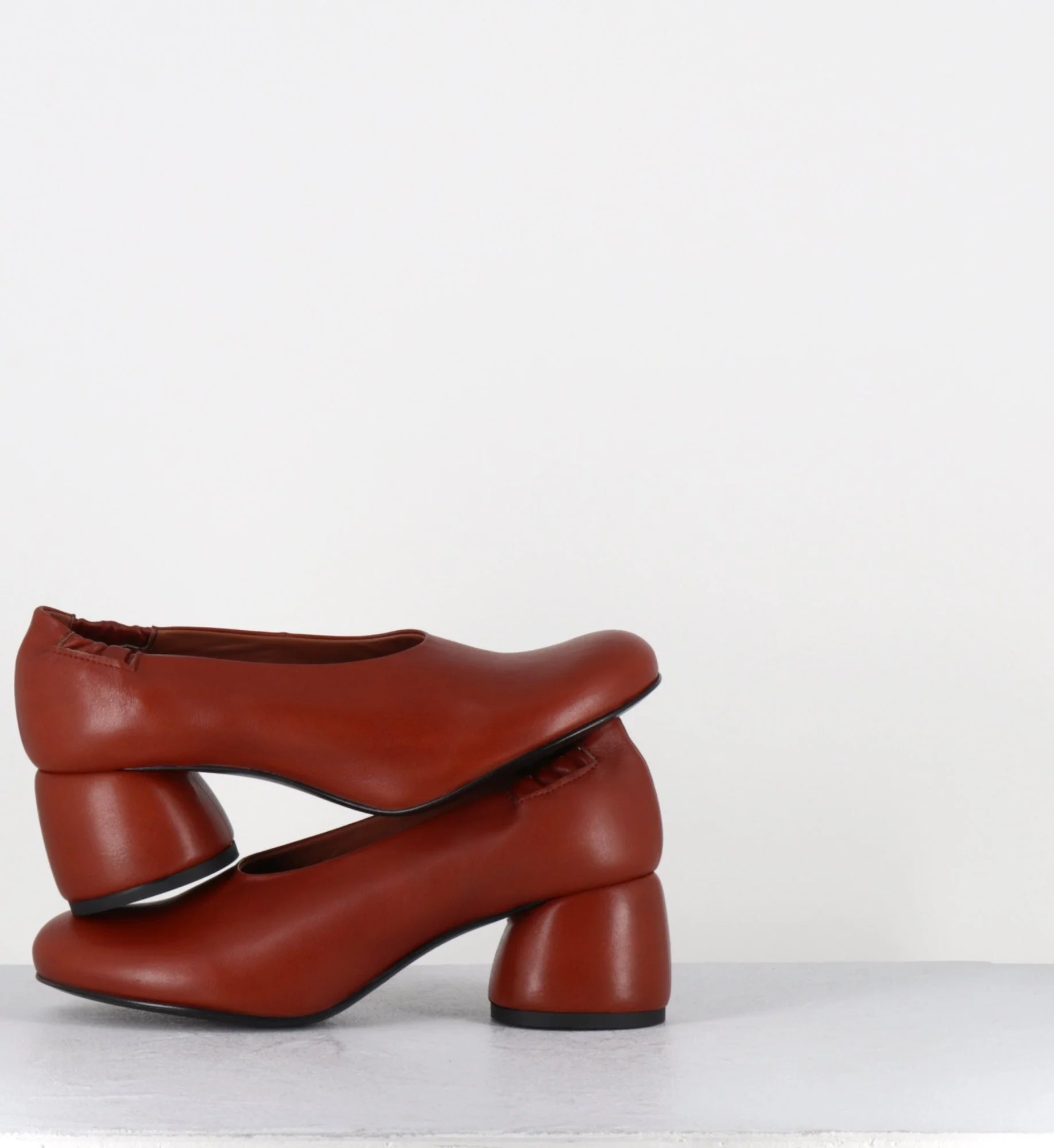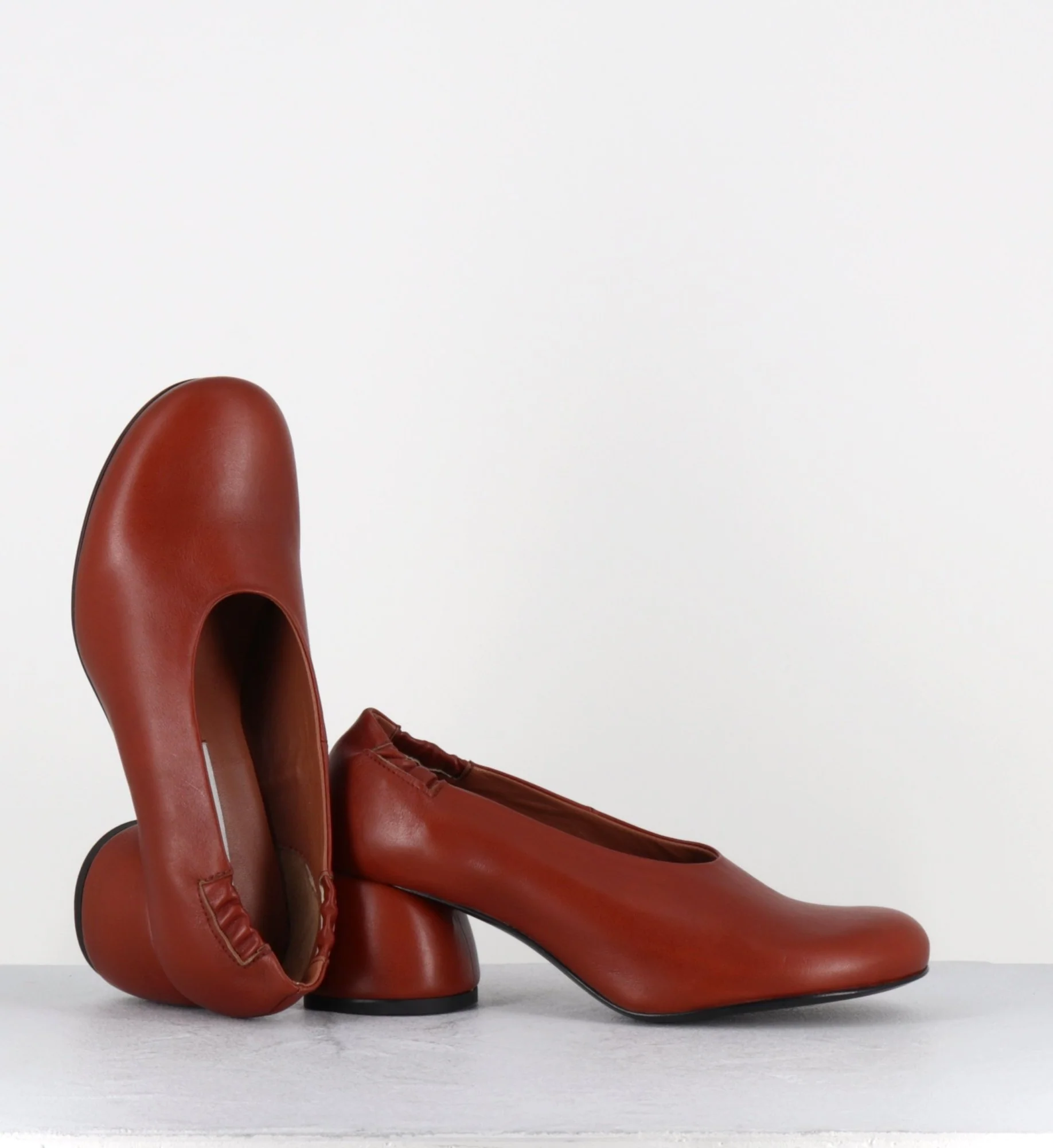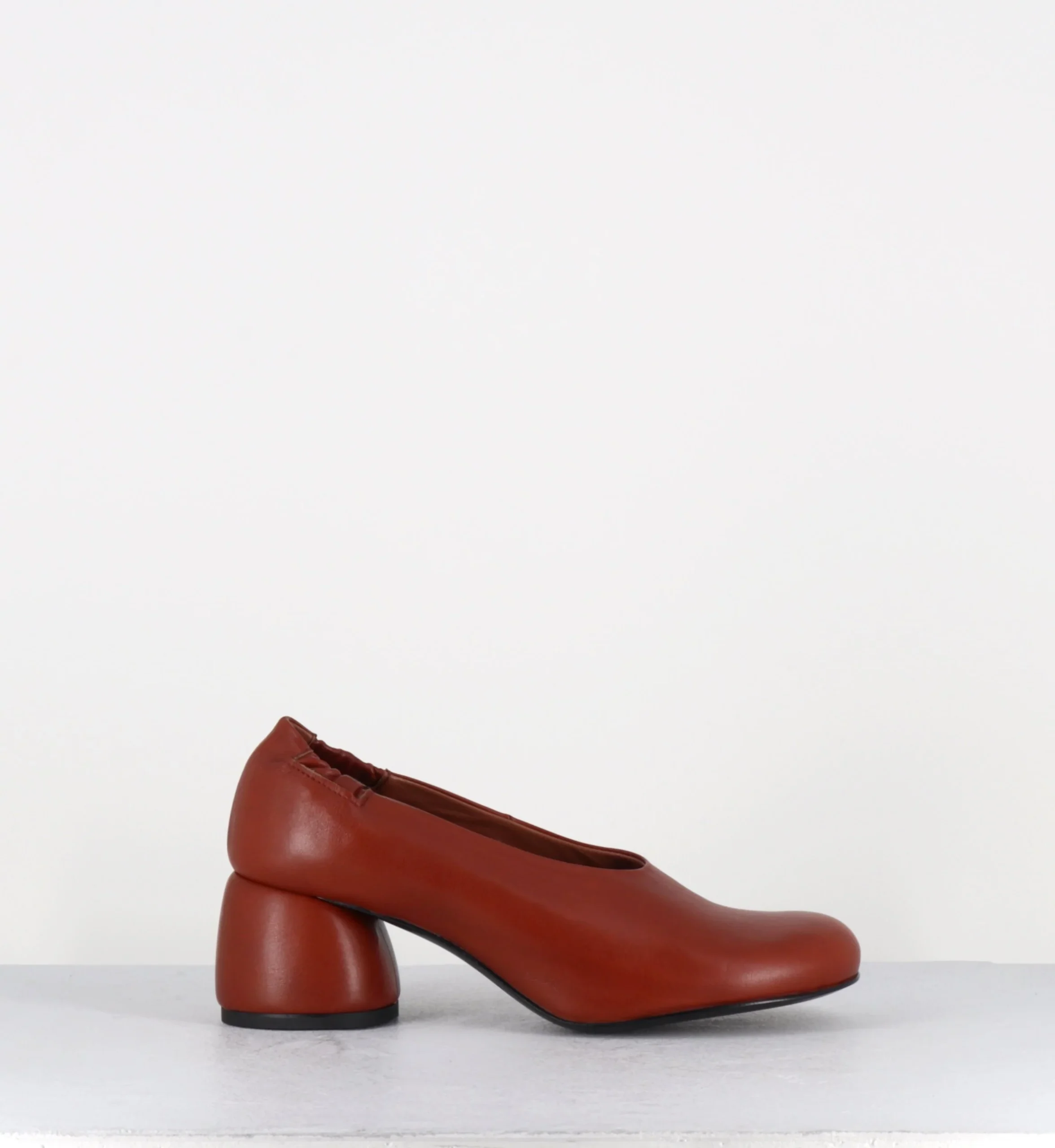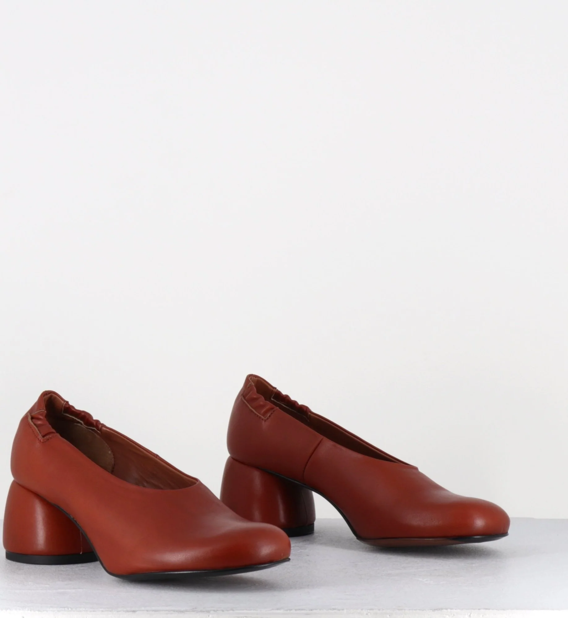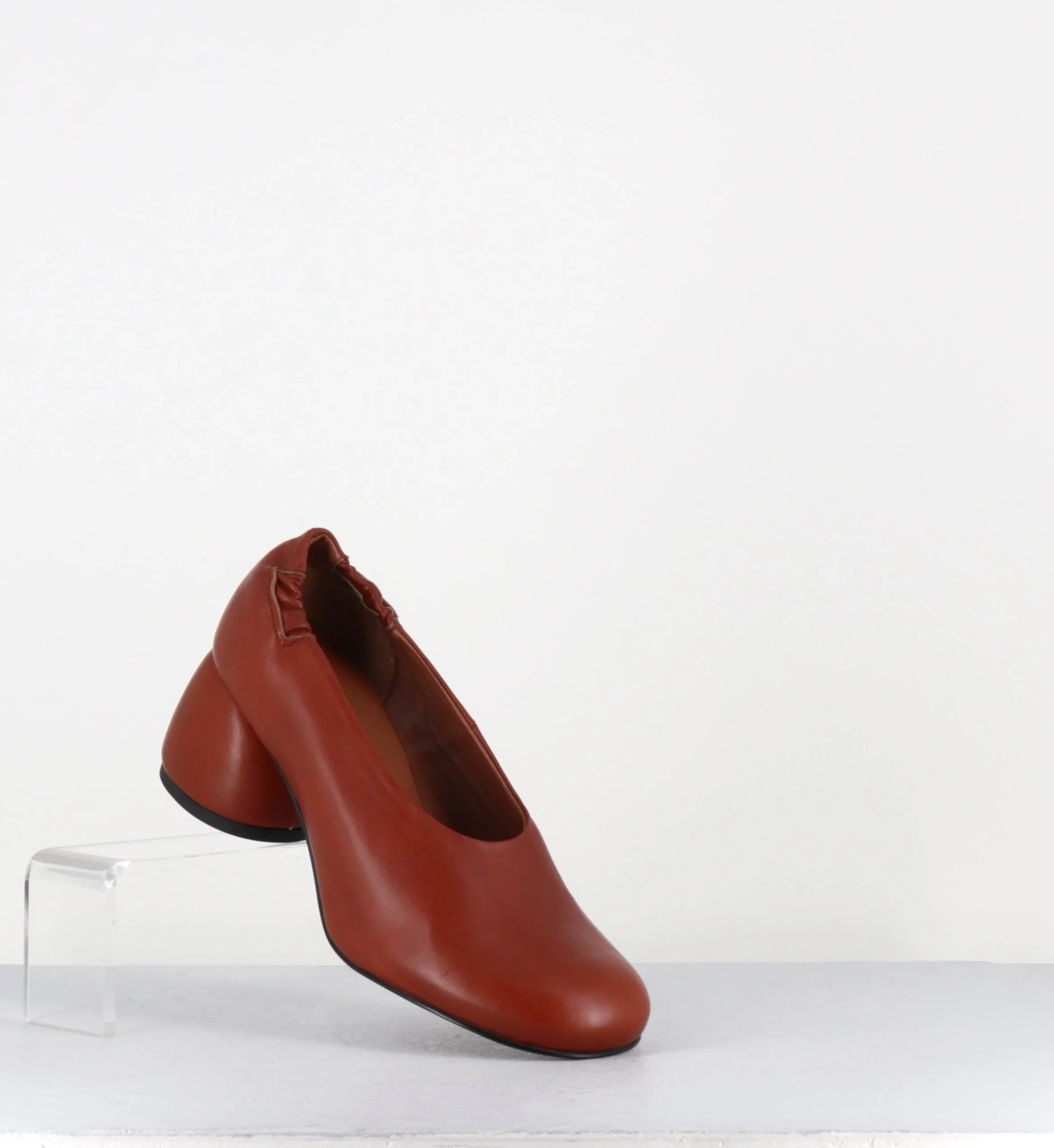 Escarpins en cuir cognac / brique, forme ronde minimaliste, montées sur un talon géométrique recouvert