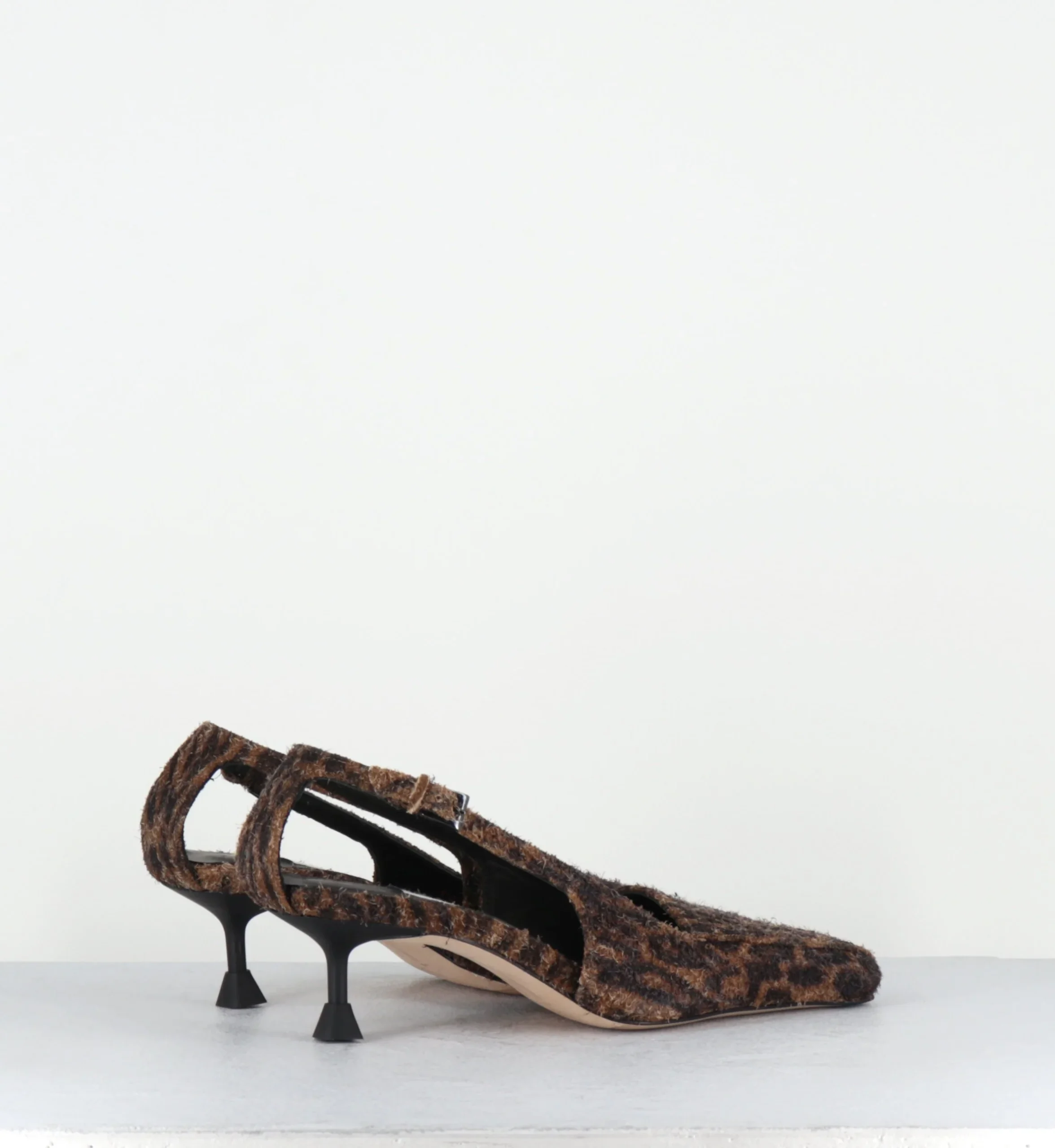 Escarpins slingback en cuir daim primé léopard texturé, ligne effilée à bout carré esprit 90s, bride réglable, montées sur un petit talon fin