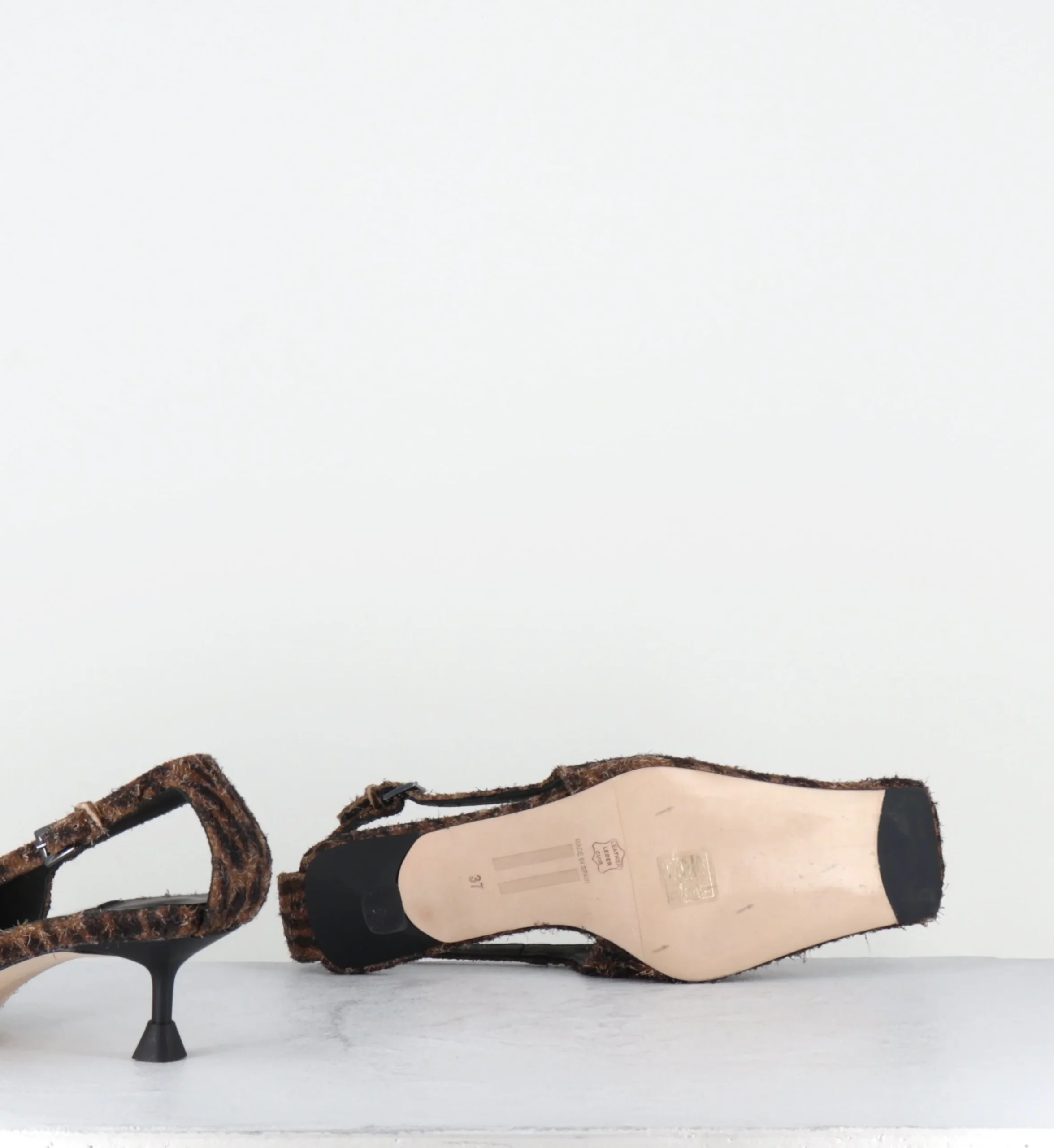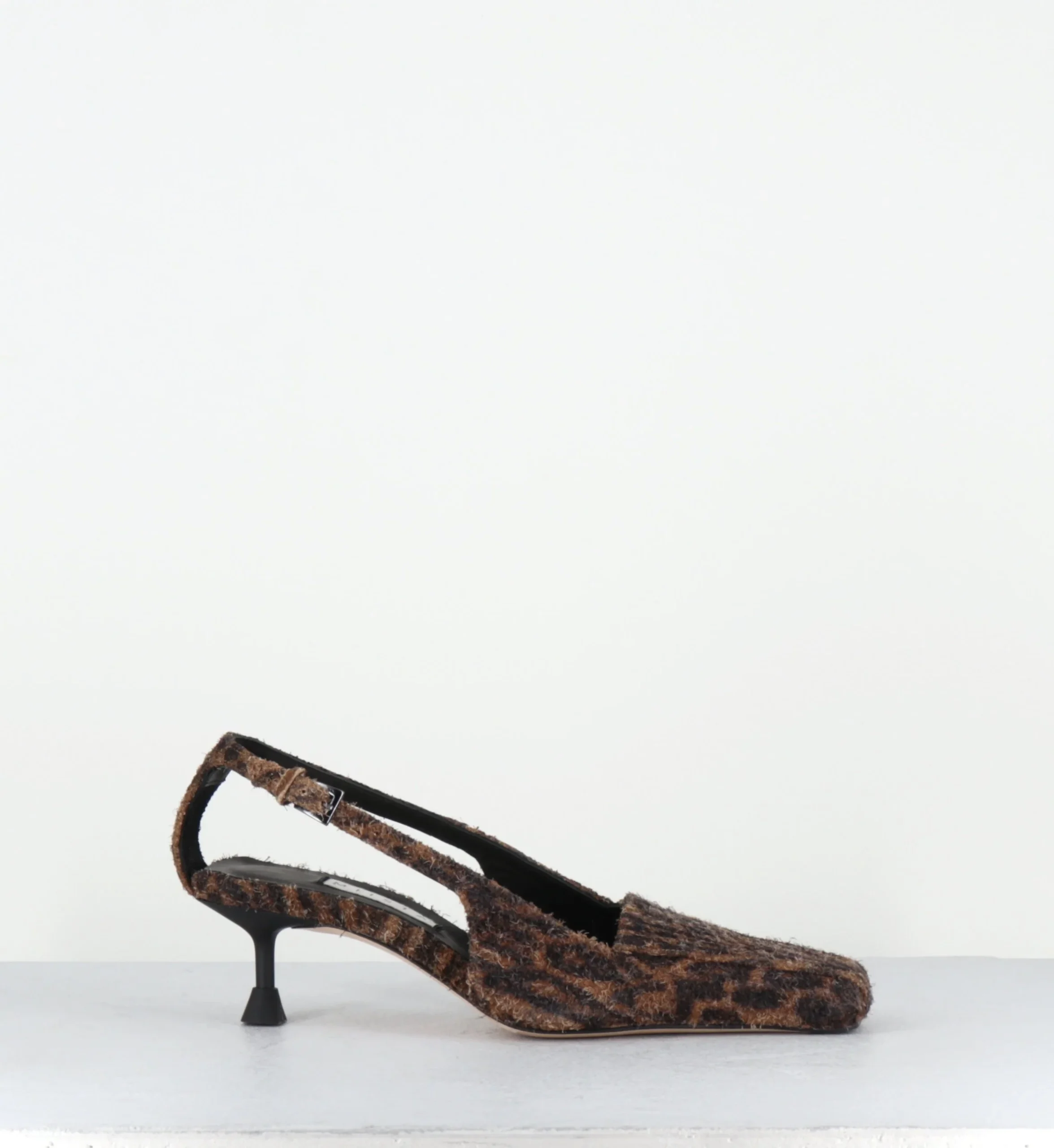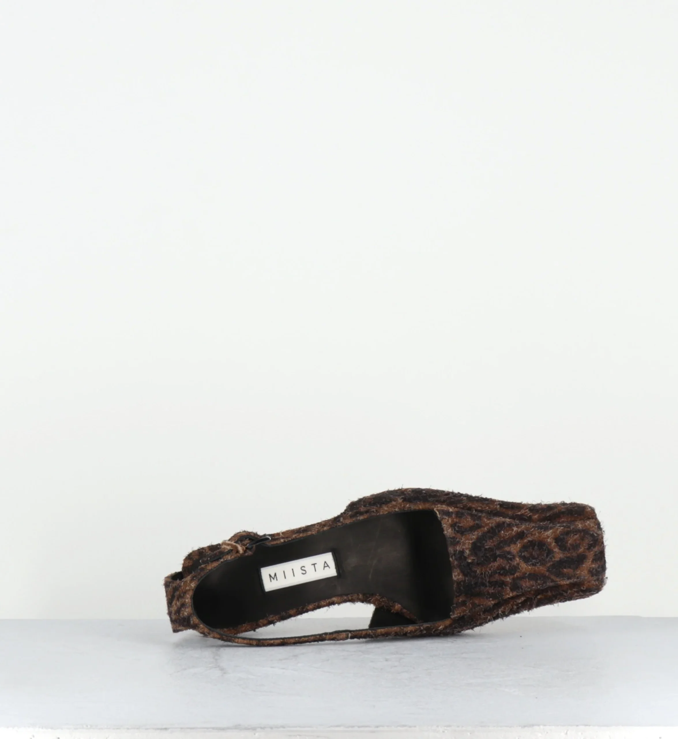 Escarpins slingback en cuir daim primé léopard texturé, ligne effilée à bout carré esprit 90s, bride réglable, montées sur un petit talon fin Fabrication Artisanale Espagnole – Ateliers Miista Chausse grand
