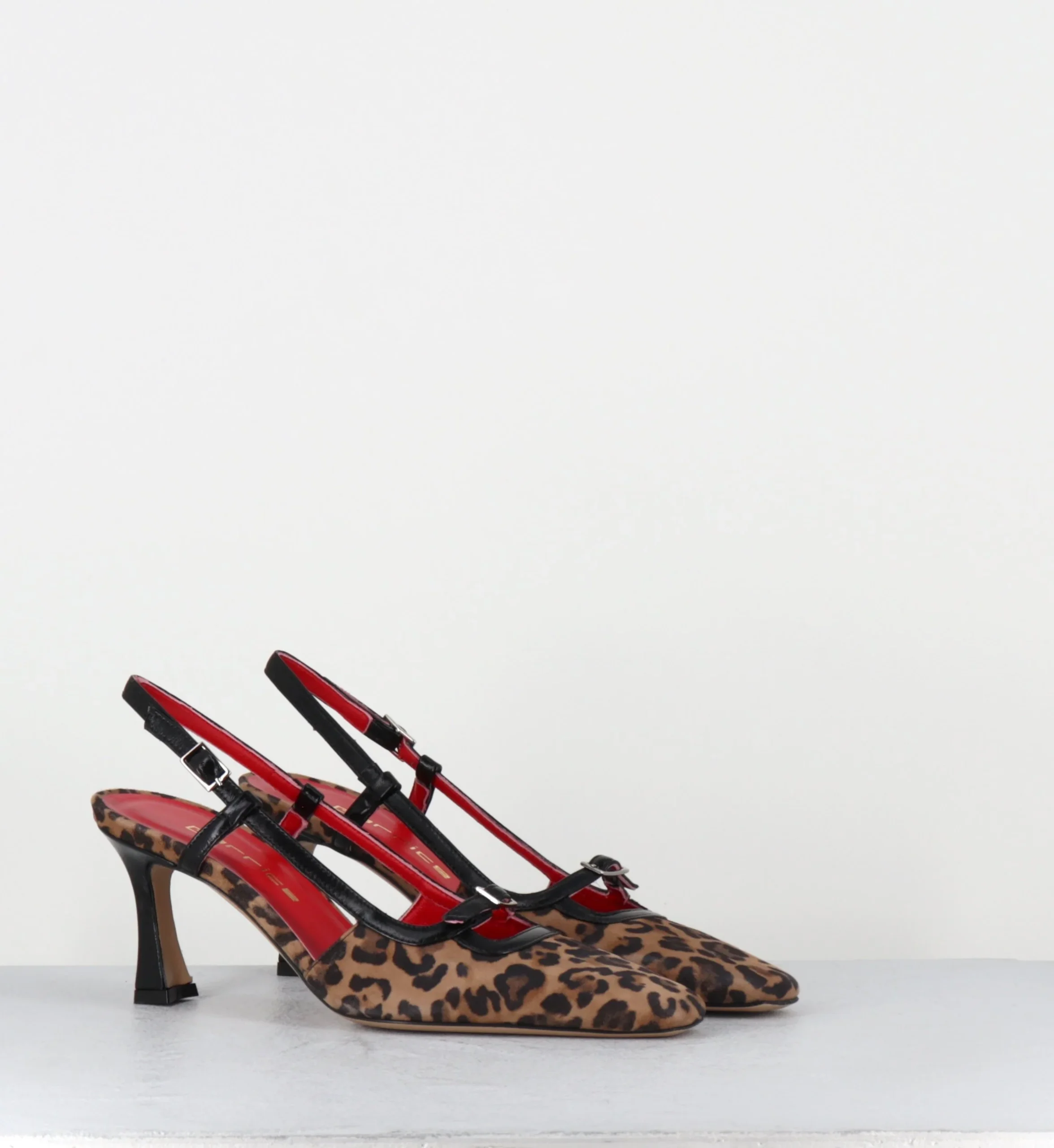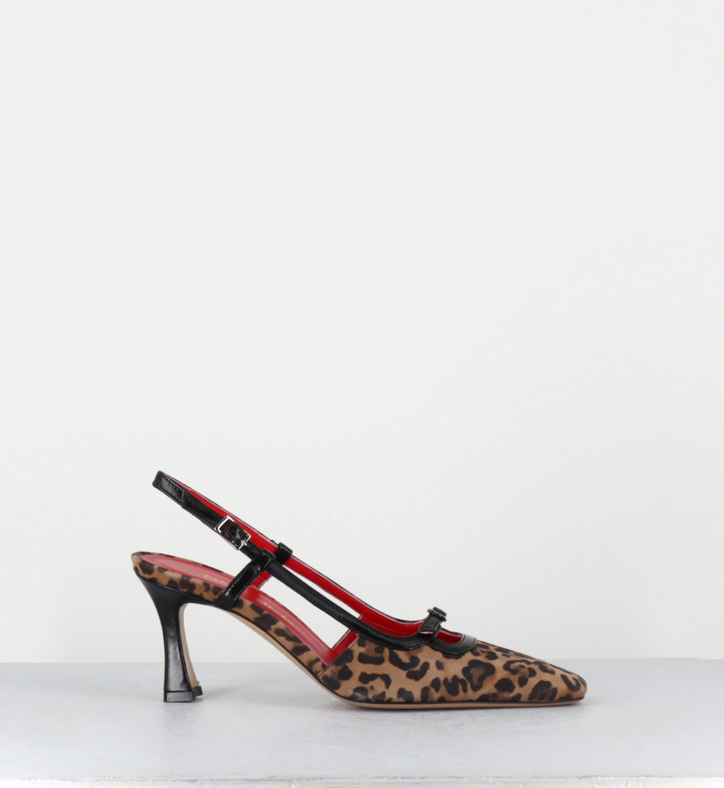 Escarpins slingback à talon en cuir suede imprimé léopard et liseré en cuir vernis noir, intérieur rouge, bout effilé à pointe carrée, boucles réglables Inspiré des formes du début des années 2000 – What my mom used to wear in the 2000s Fabrication Artisanale Italienne – Ateliers GarriceLab Chausse normalement