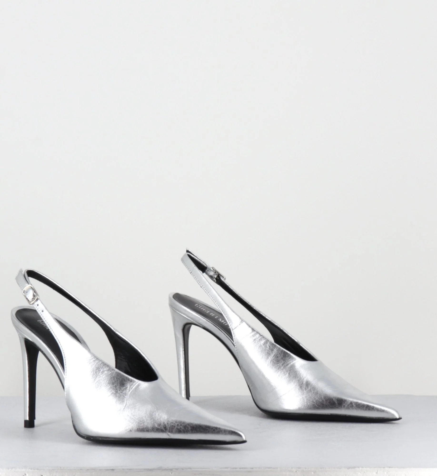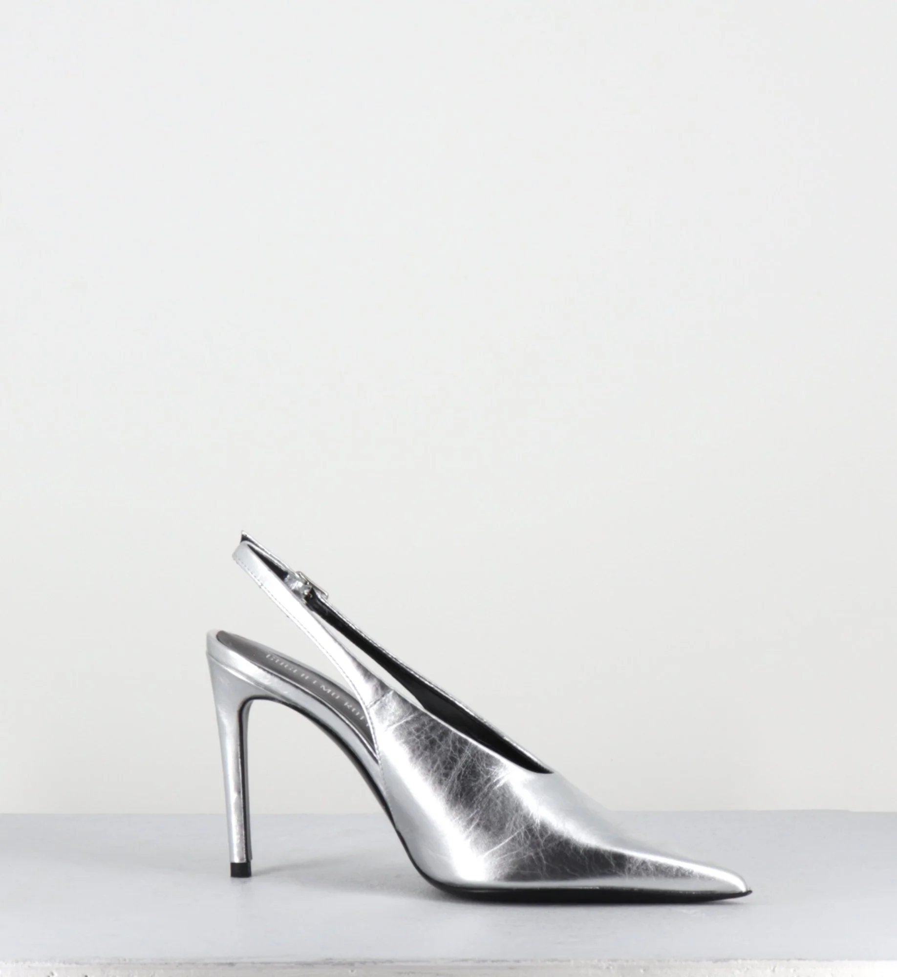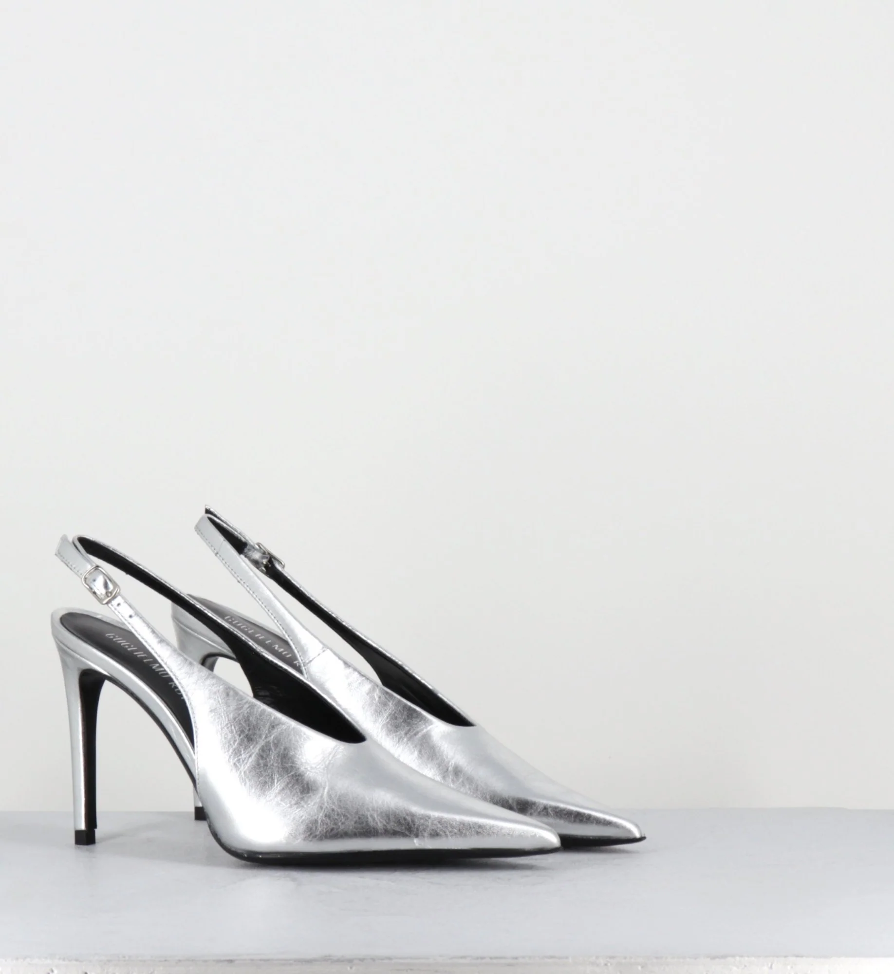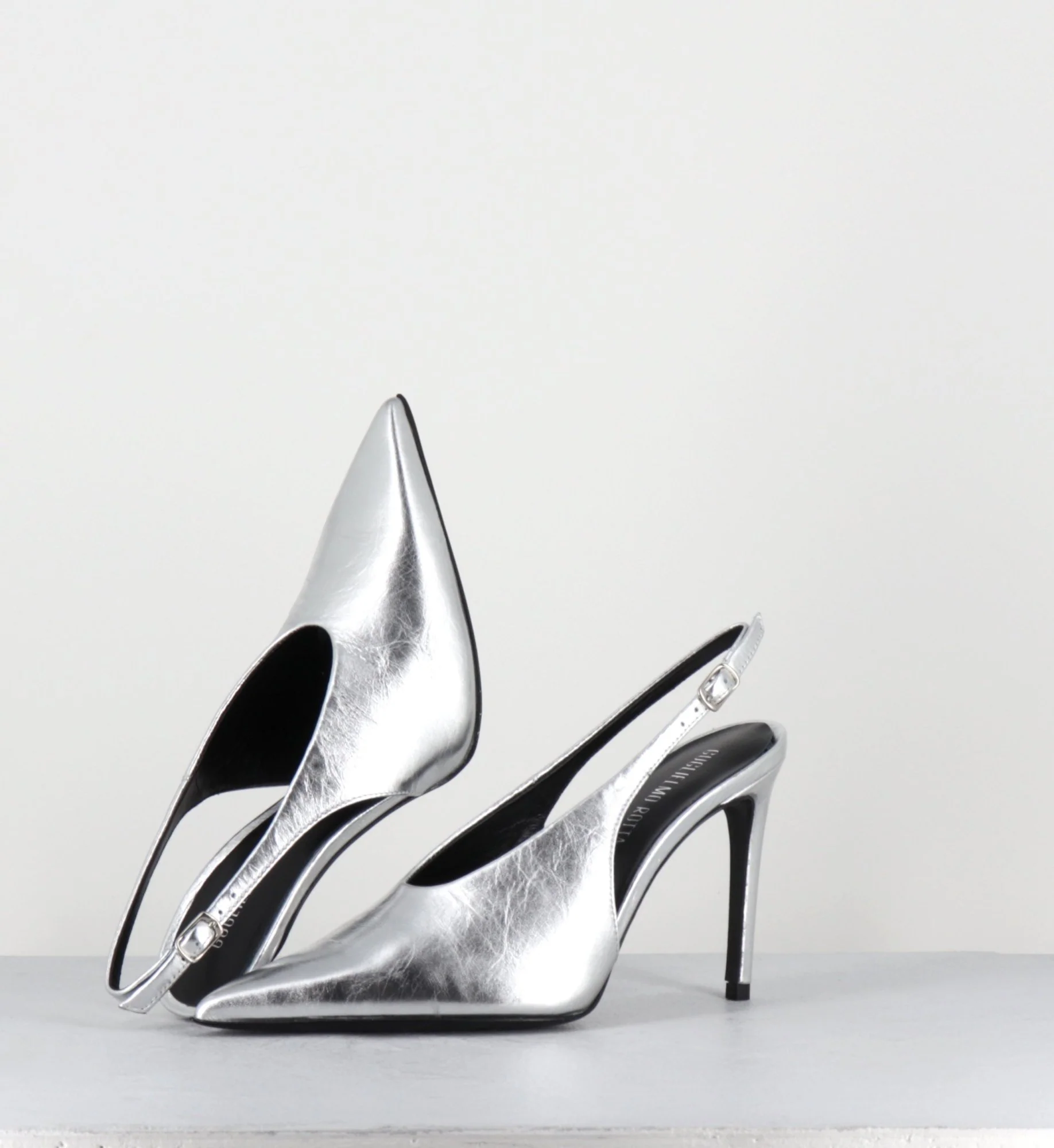 Escarpins slingback bride arrière réglable à talon haut en cuir métallié argent, ligne effilée à bout pointu, montées sur un talon fin