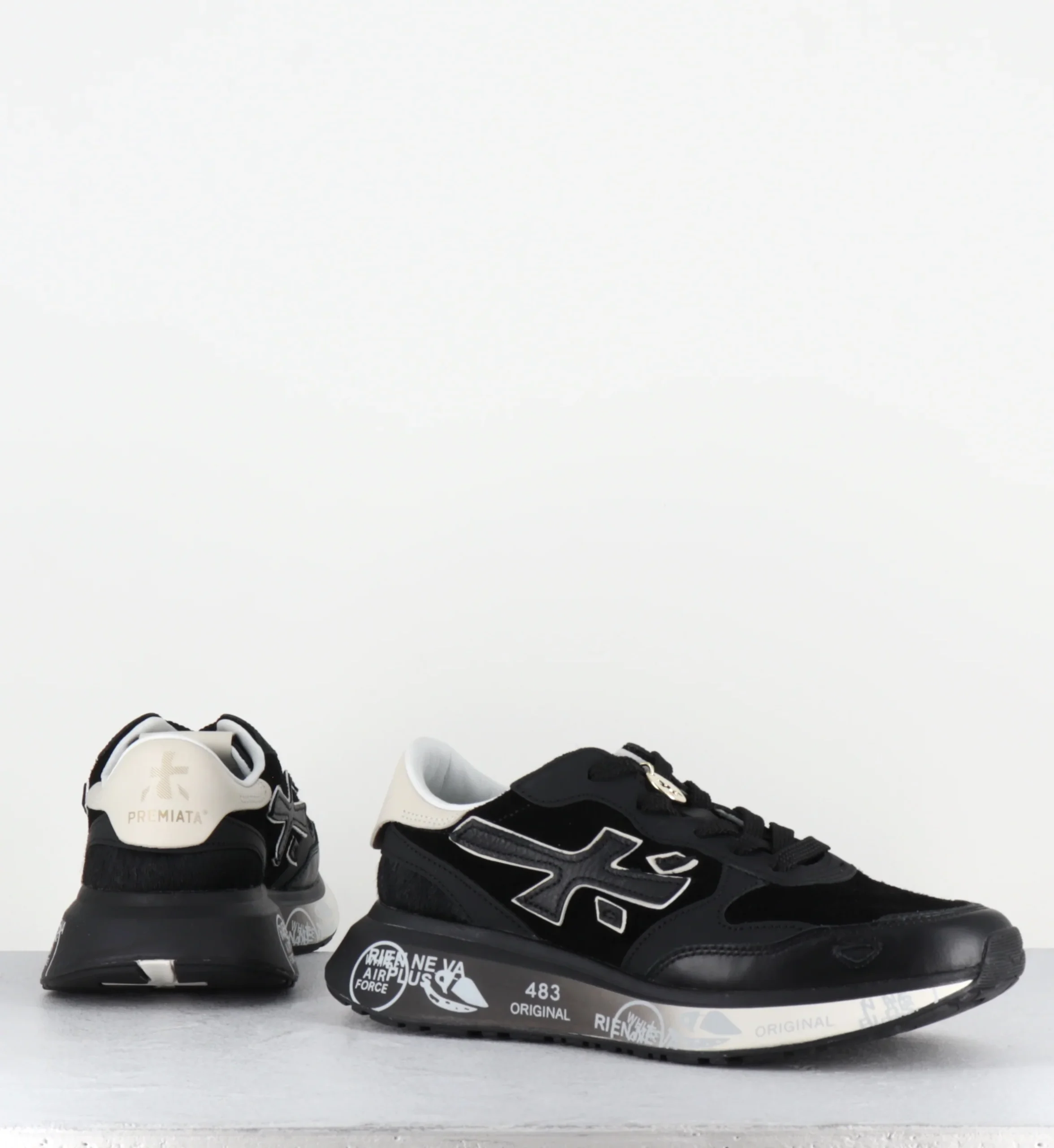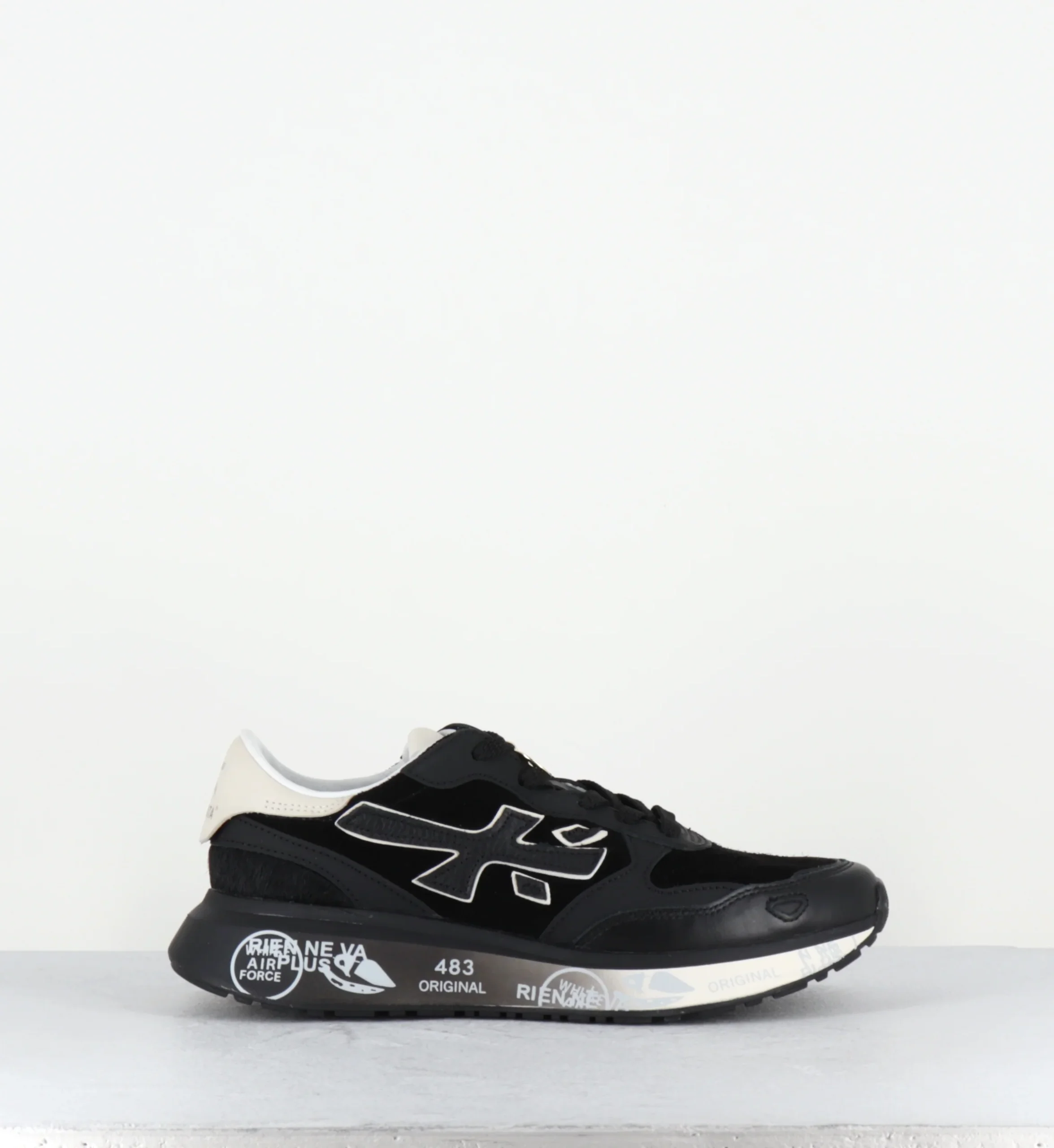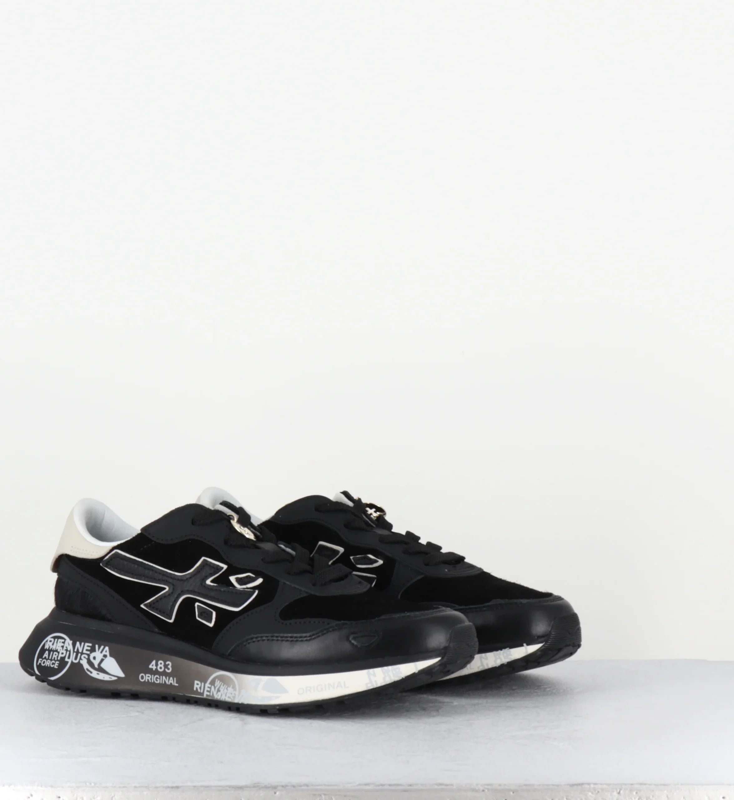 The sole, enhanced by Premiata’s iconic style details, enhances the urban and casual-chic identity.