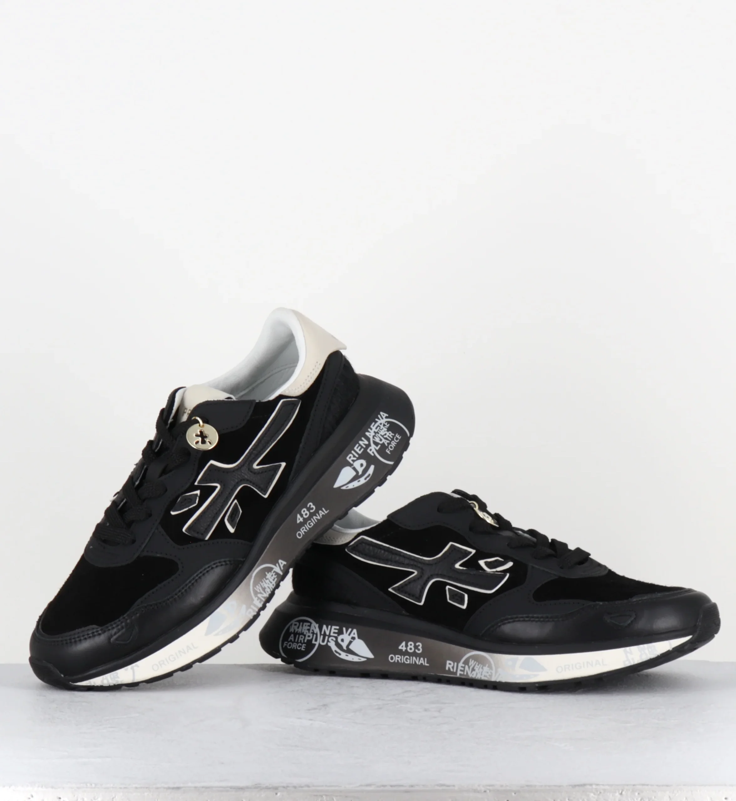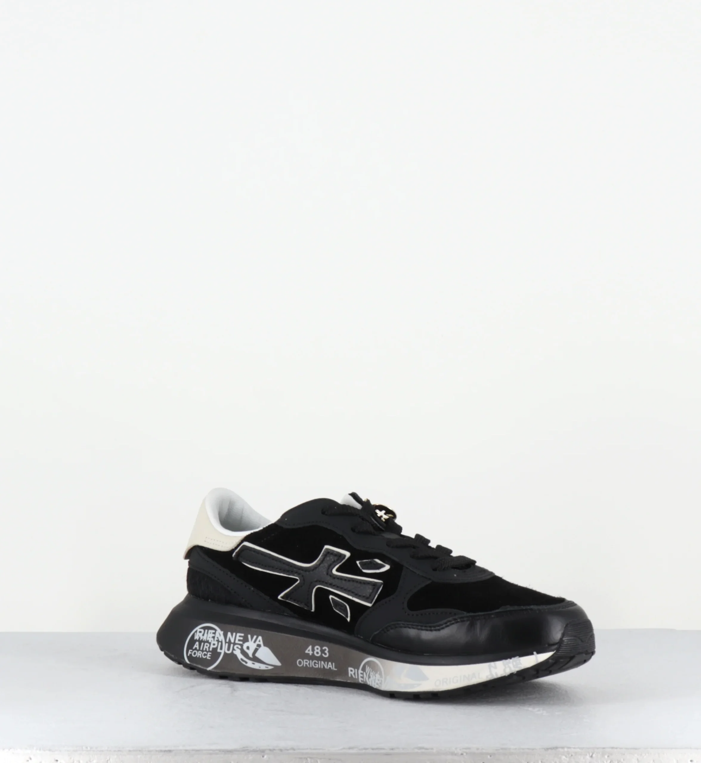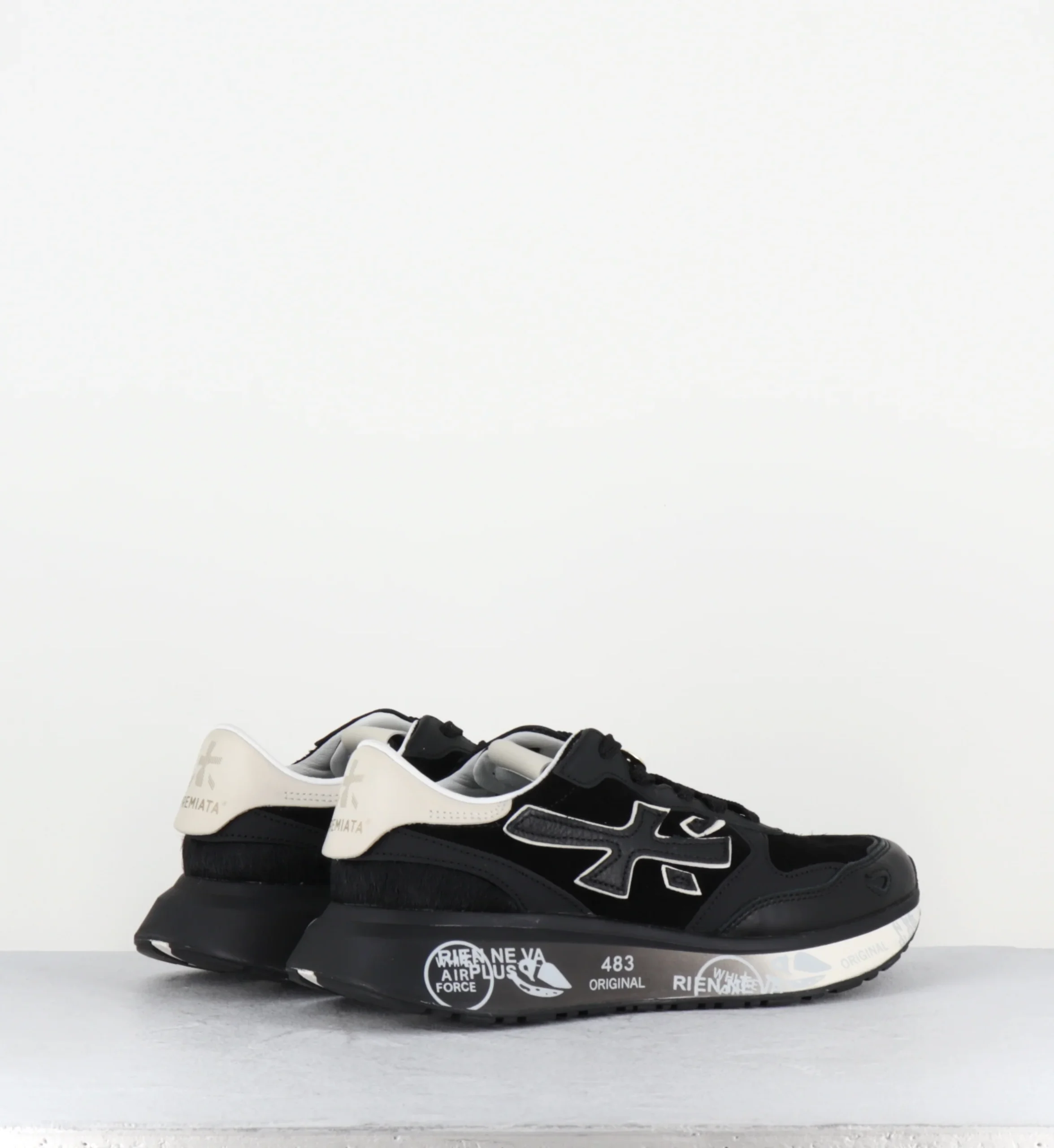 The sole, enhanced by Premiata’s iconic style details, enhances the urban and casual-chic identity.