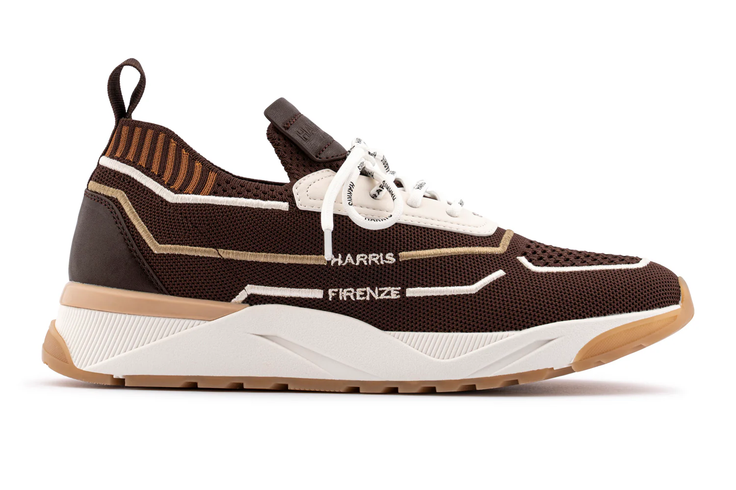 Avec une combinaison d’élégance et de confort, le modèle en tissu élastique brun foncé avec broderie colorée combine les détails de la fleur brun complète et de la lapidation en cuir pour une touche raffinée. La semelle en caoutchouc élevée et la ligne d’inspiration de course garantissent la pratique tandis que les détails tels que le logo brodé Harris et les lacets logod ajoutent l’exclusivité et distinguent l’artisanat.