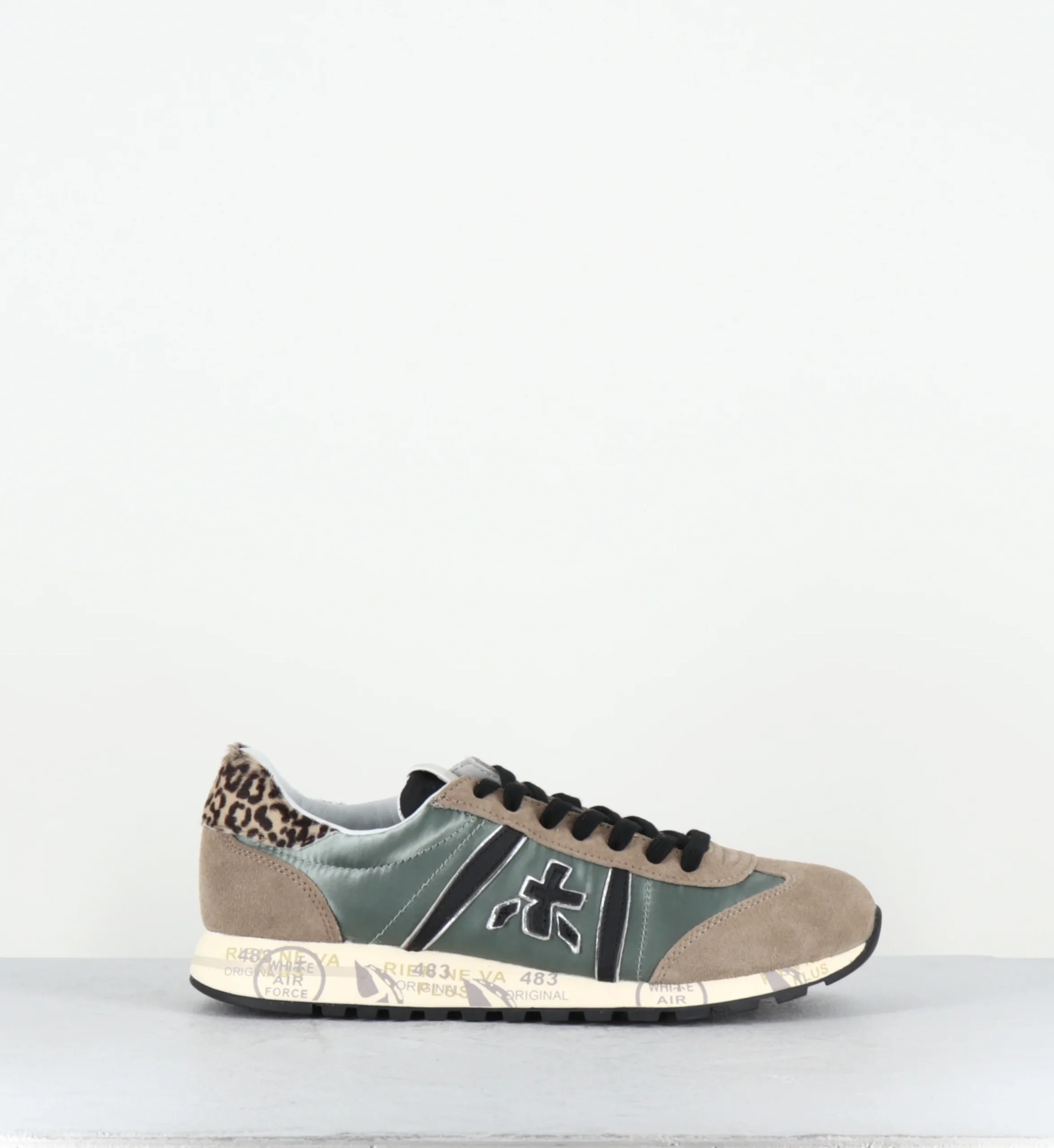 Baskets daim taupe et toile vert-de-gris avec détails de cuir mat noir et poulain leopard à l’arrière, montées sur une semelle légère, avec imprimé signature de la Maison Italienne Premiata. Cambrure étudiée ultra confortable Chausse normalement
