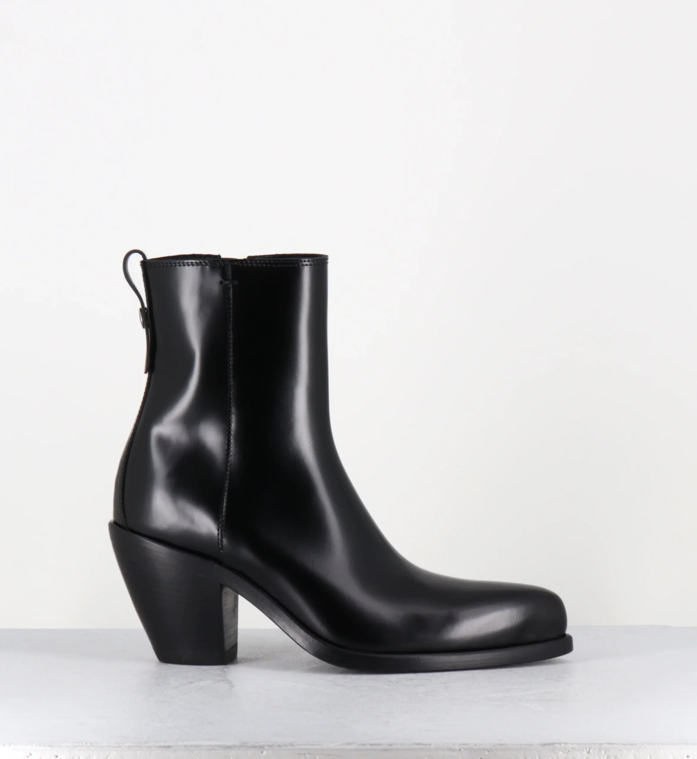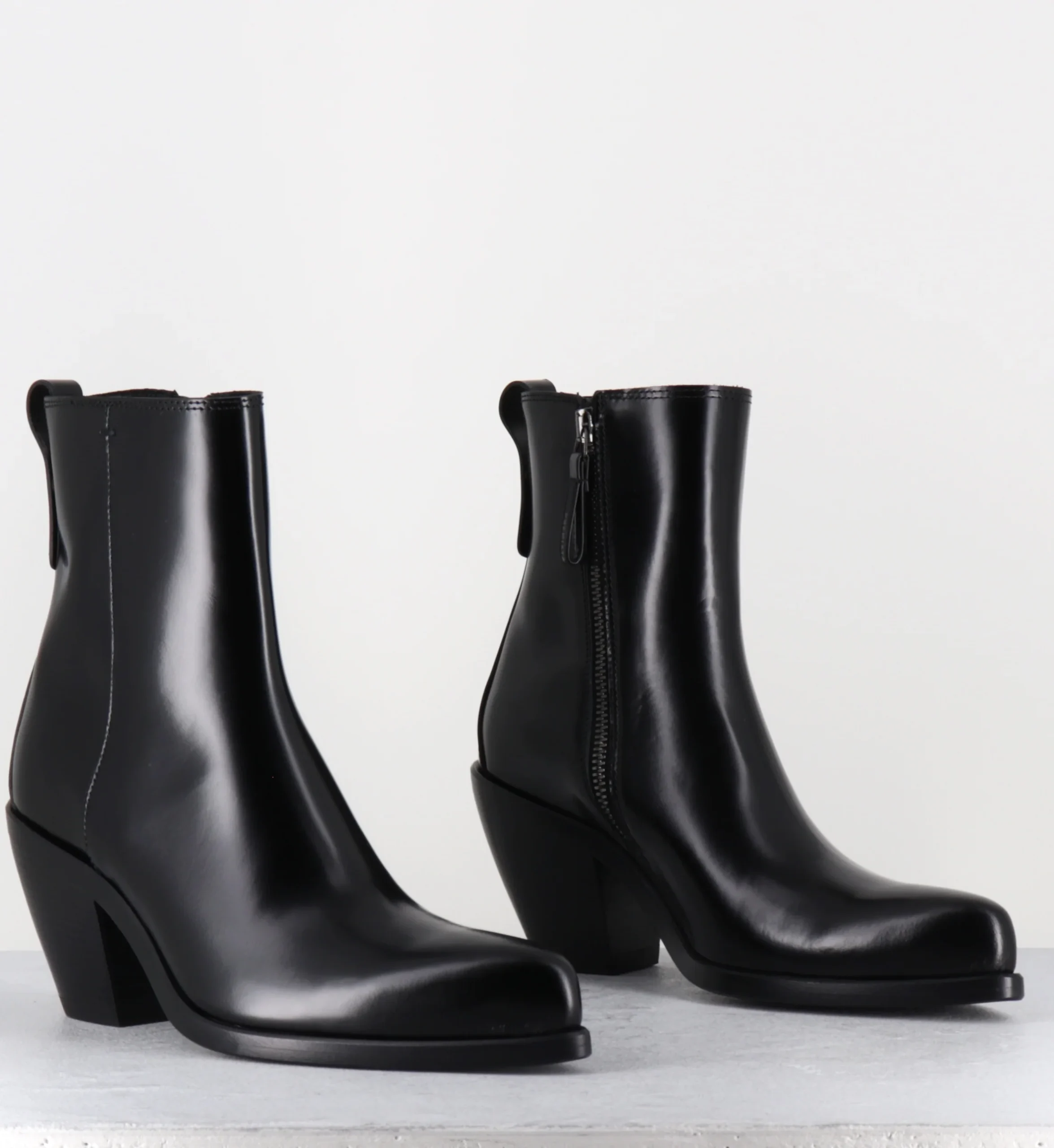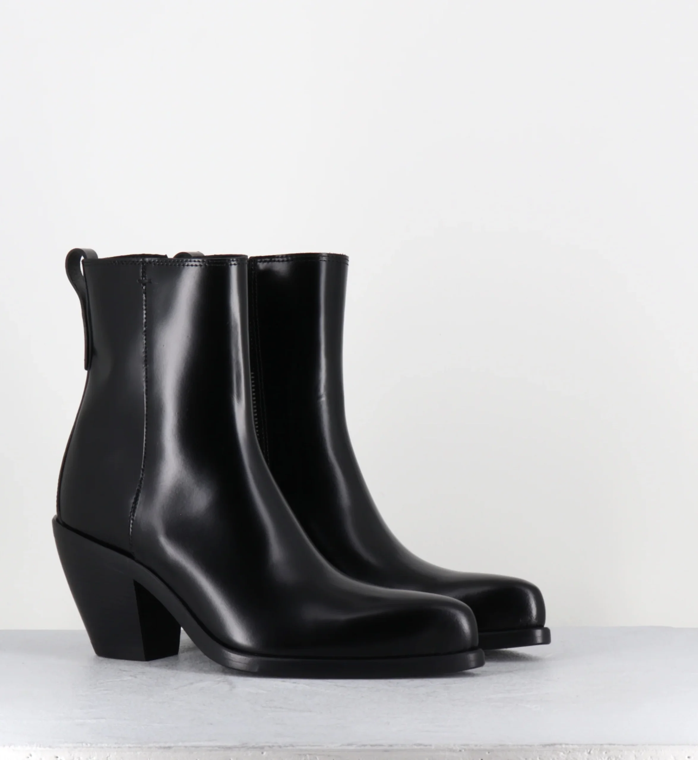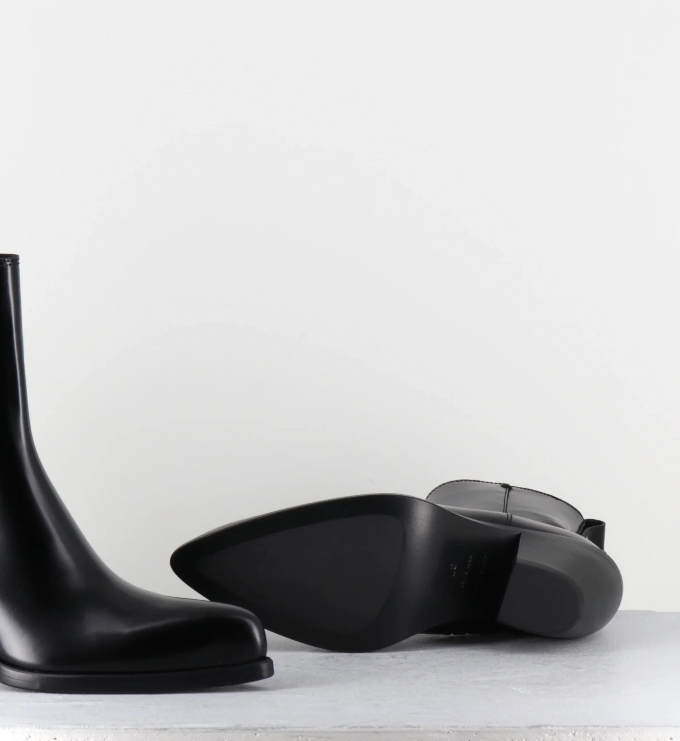 Boots santiags en cuir glacé noir, ligne pure à pointe bombée, montées sur un talon biseauté Fabrication Artisanale Italienne – Ateliers Premiata Chausse légèrement grand
