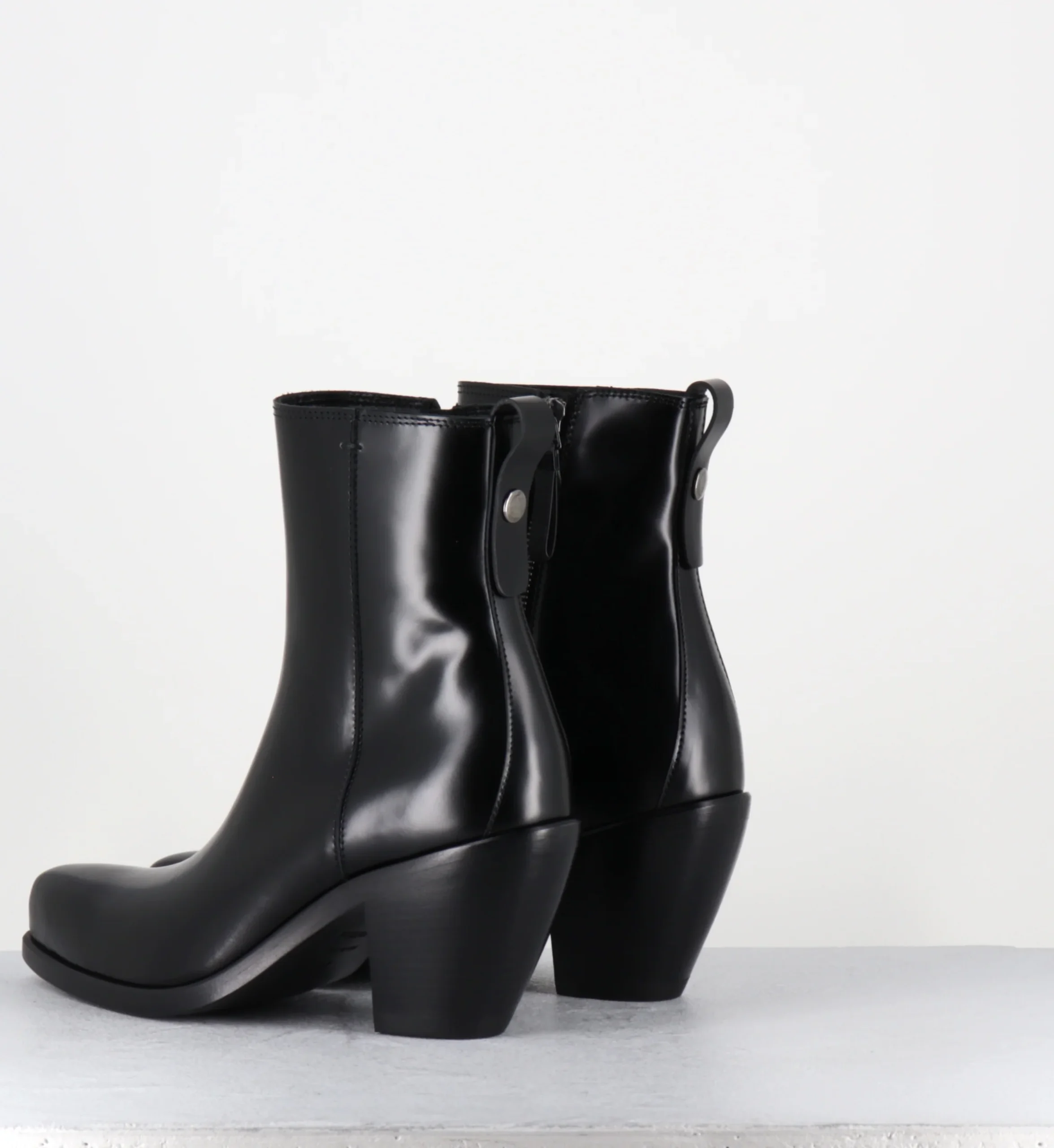 Boots santiags en cuir glacé noir, ligne pure à pointe bombée, montées sur un talon biseauté