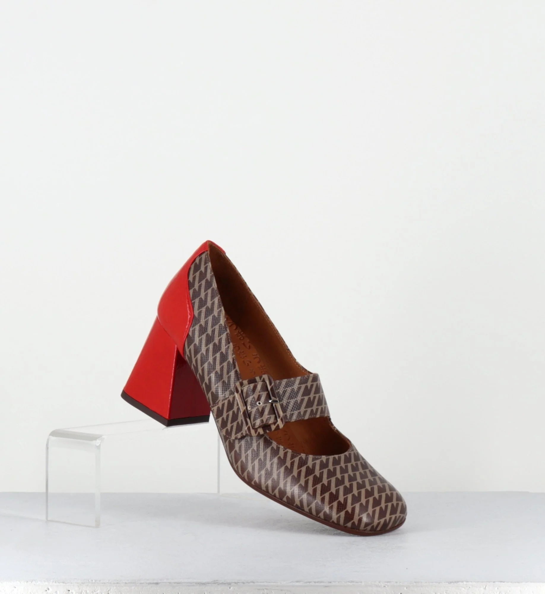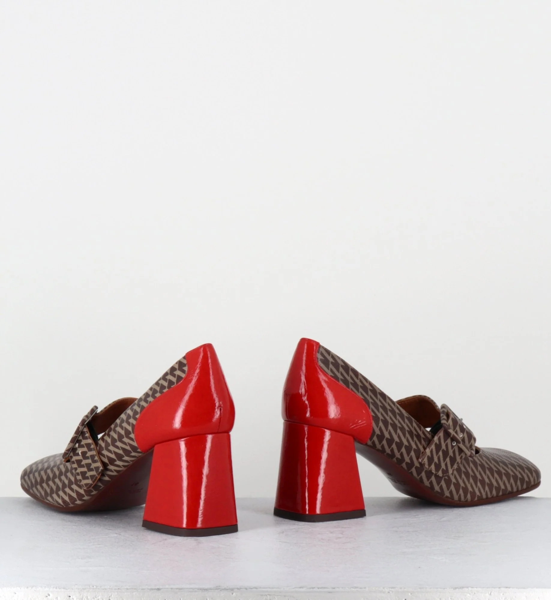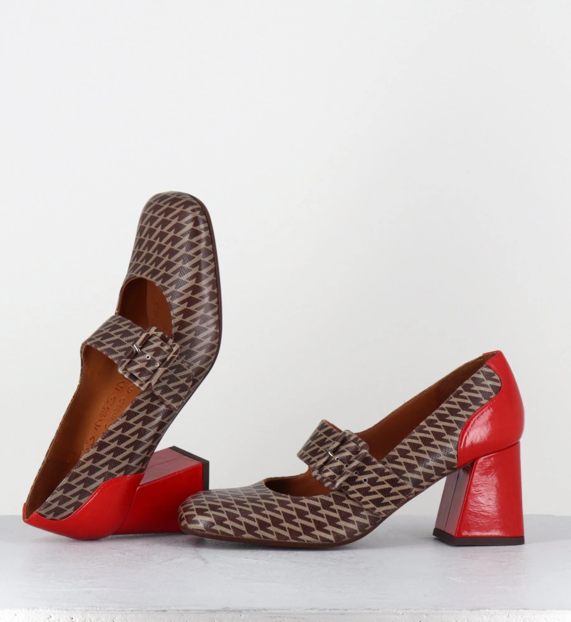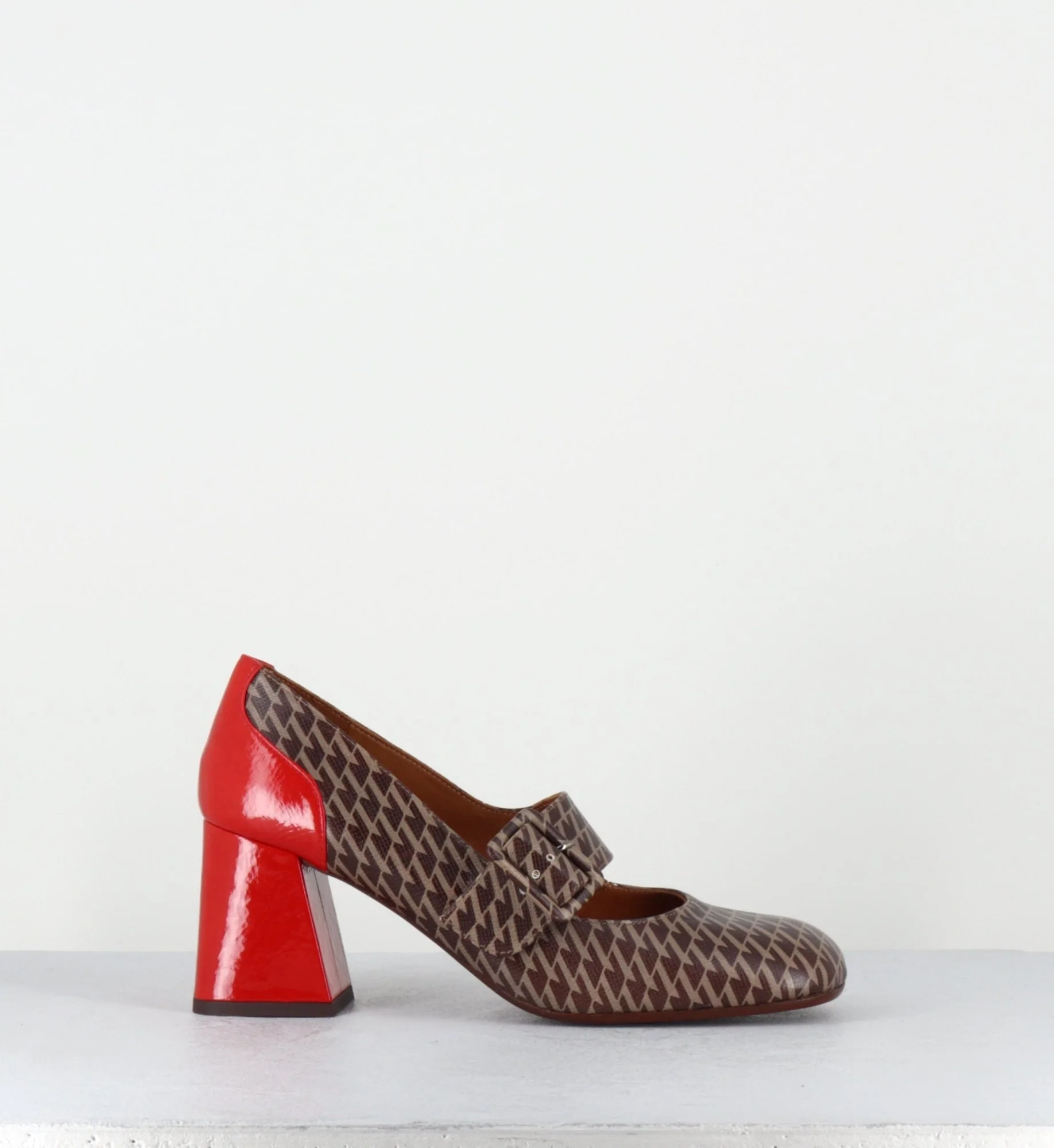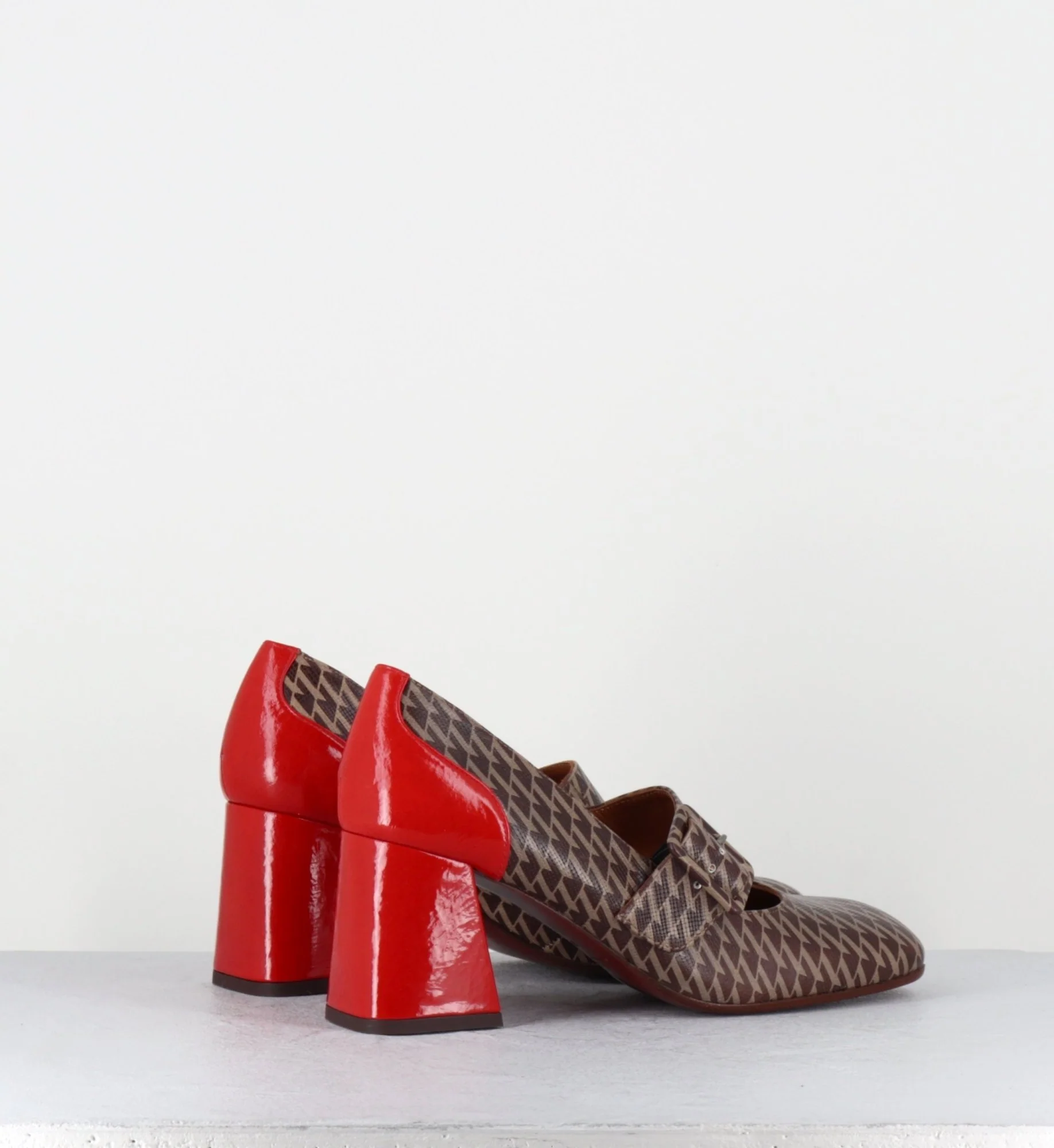 Chaussures Mary-Jane à bride réglable en cuir gaufré imprimé pied-de-poule marron, bout carré arrondi, montées sur un talon rétro légèrement évasé recouvert de cuir vernis rouge Fabrication Artisanale Espagnole – Ateliers Chie Mihara Chausse légèrement grand