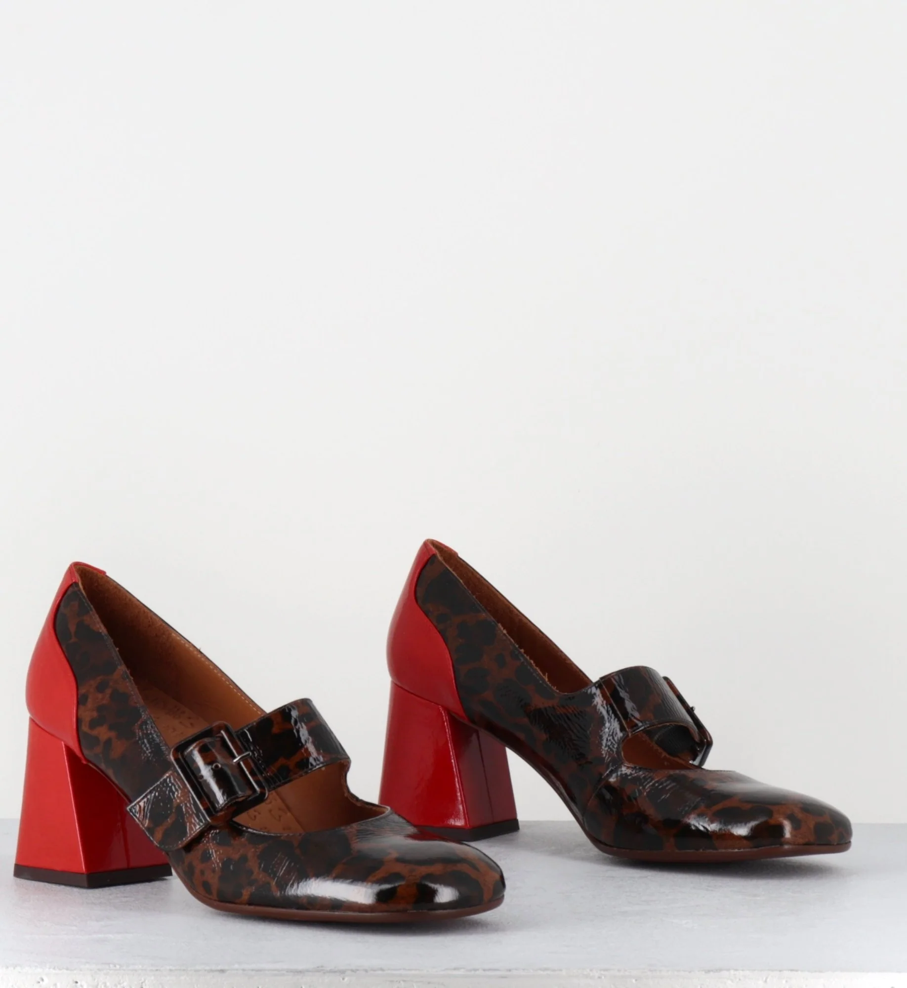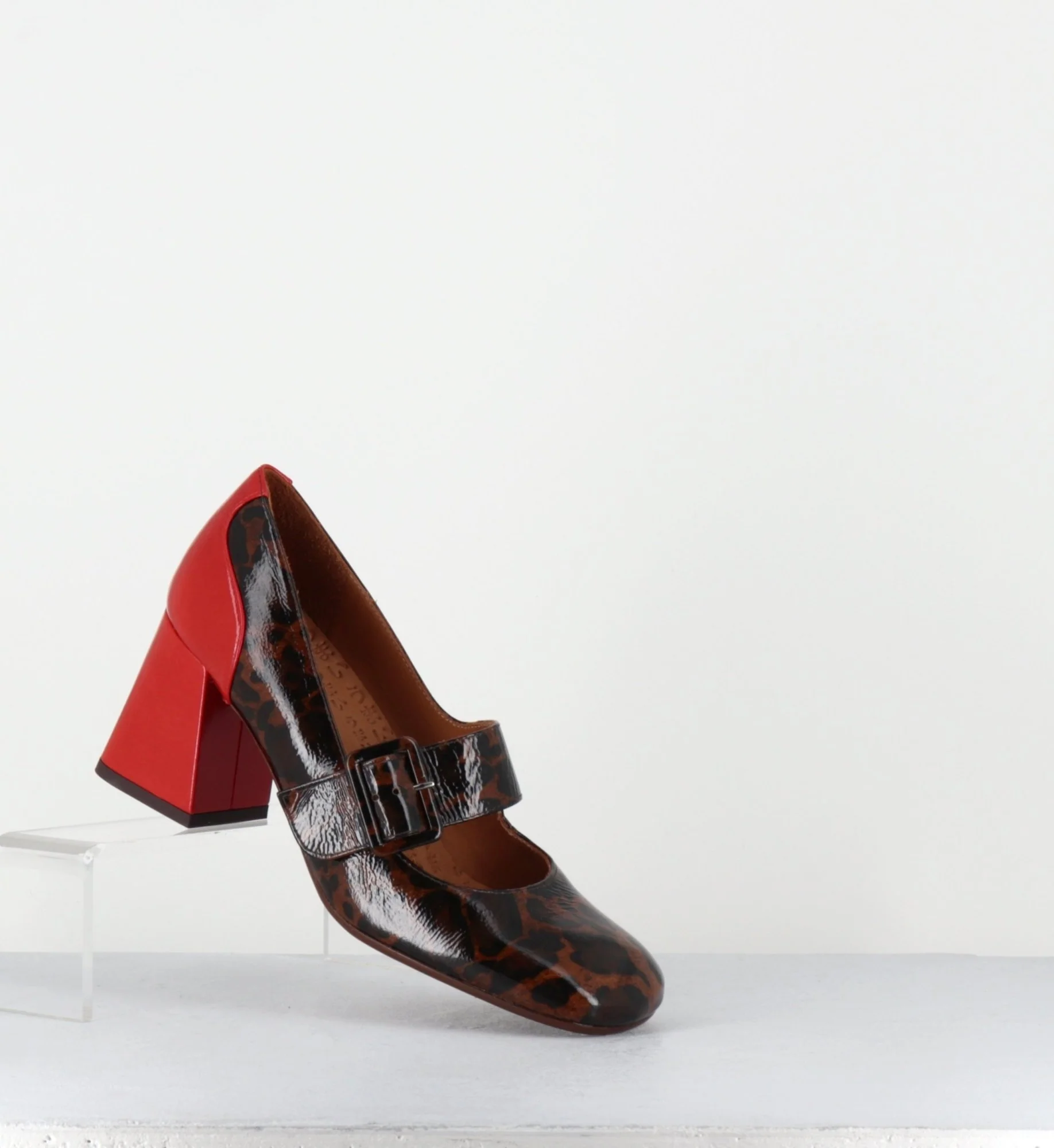 Chaussures Mary-Jane à bride réglable en cuir vernis souple imprimé léopard, bout carré arrondi, montées sur un talon rétro légèrement évasé recouvert de cuir vernis rouge Fabrication Artisanale Espagnole – Ateliers Chie Mihara Chausse légèrement grand