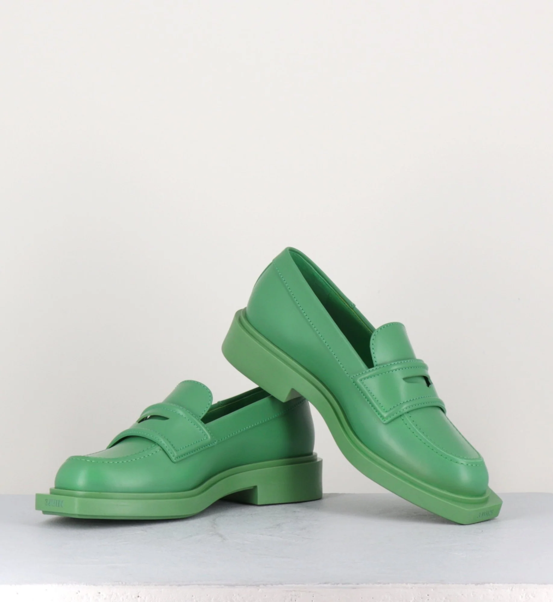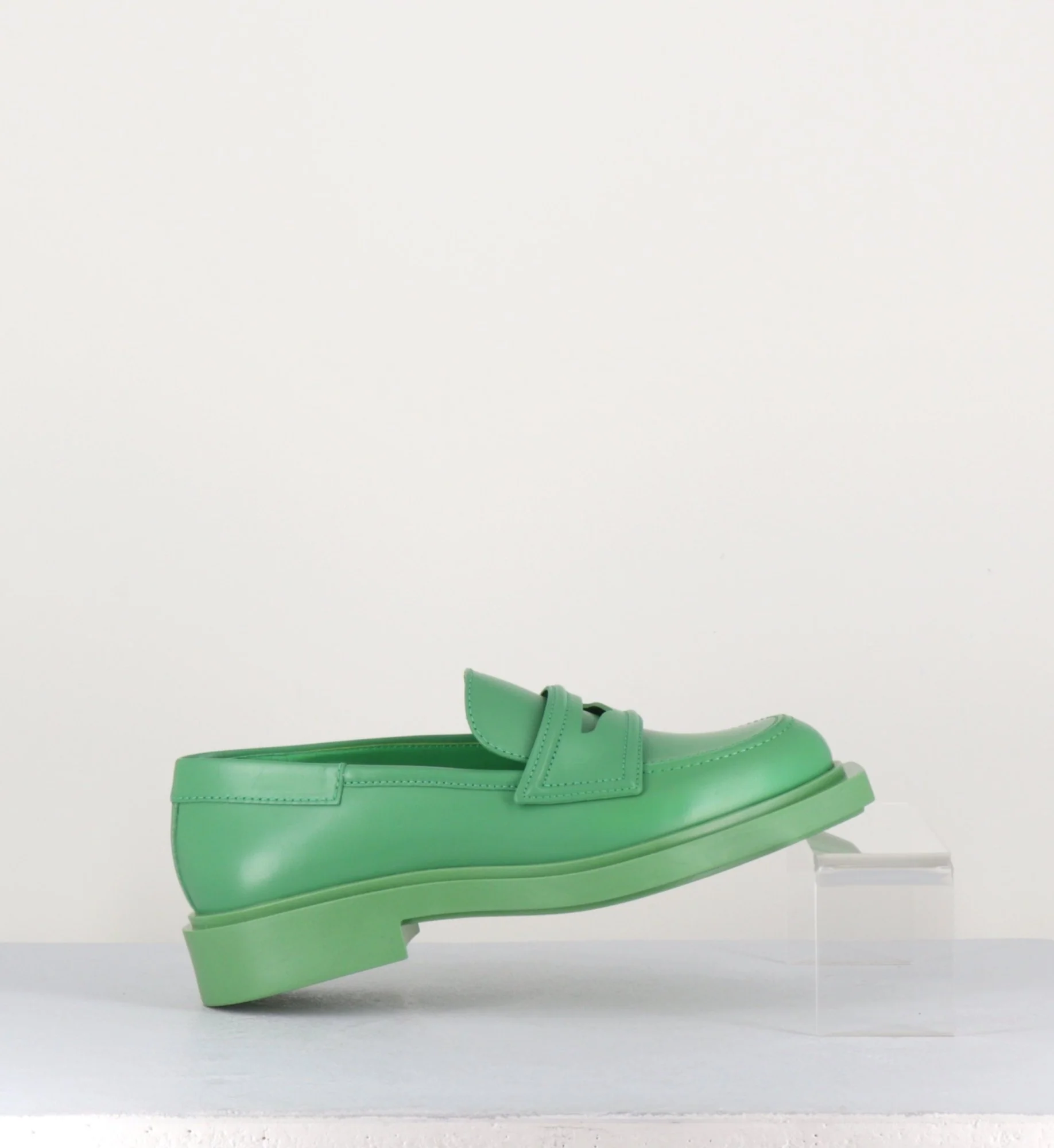 Mocassin en cuir lisse vert, semi-ouvert, bout en amande, montées une semelle à débord en gomme au bout effilé à pointe carrée. Look rétro Fabrication Artisanale Italienne – Ateliers 3Juin Chausse légèrement grand.