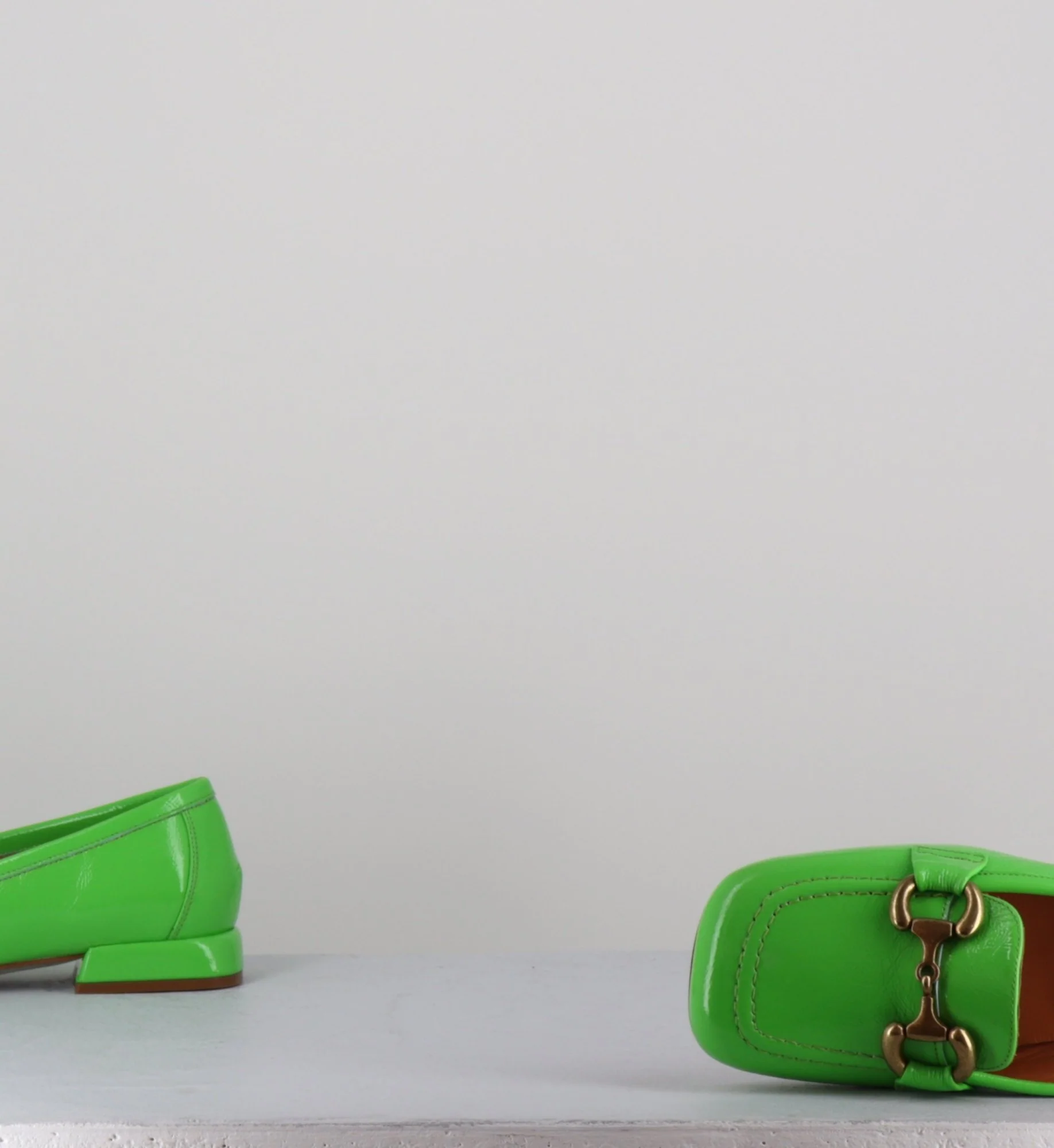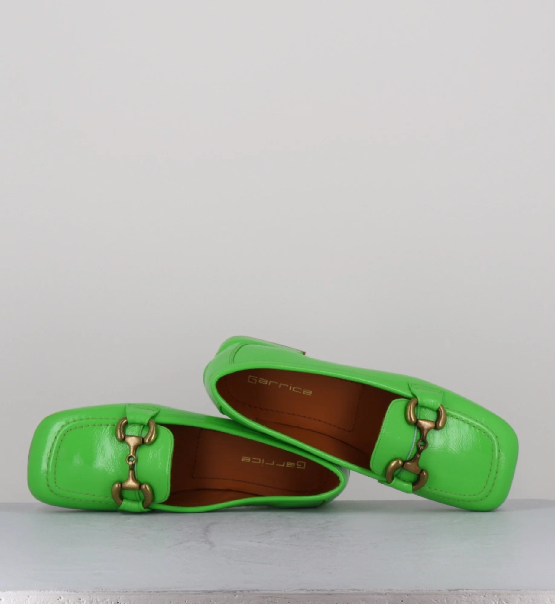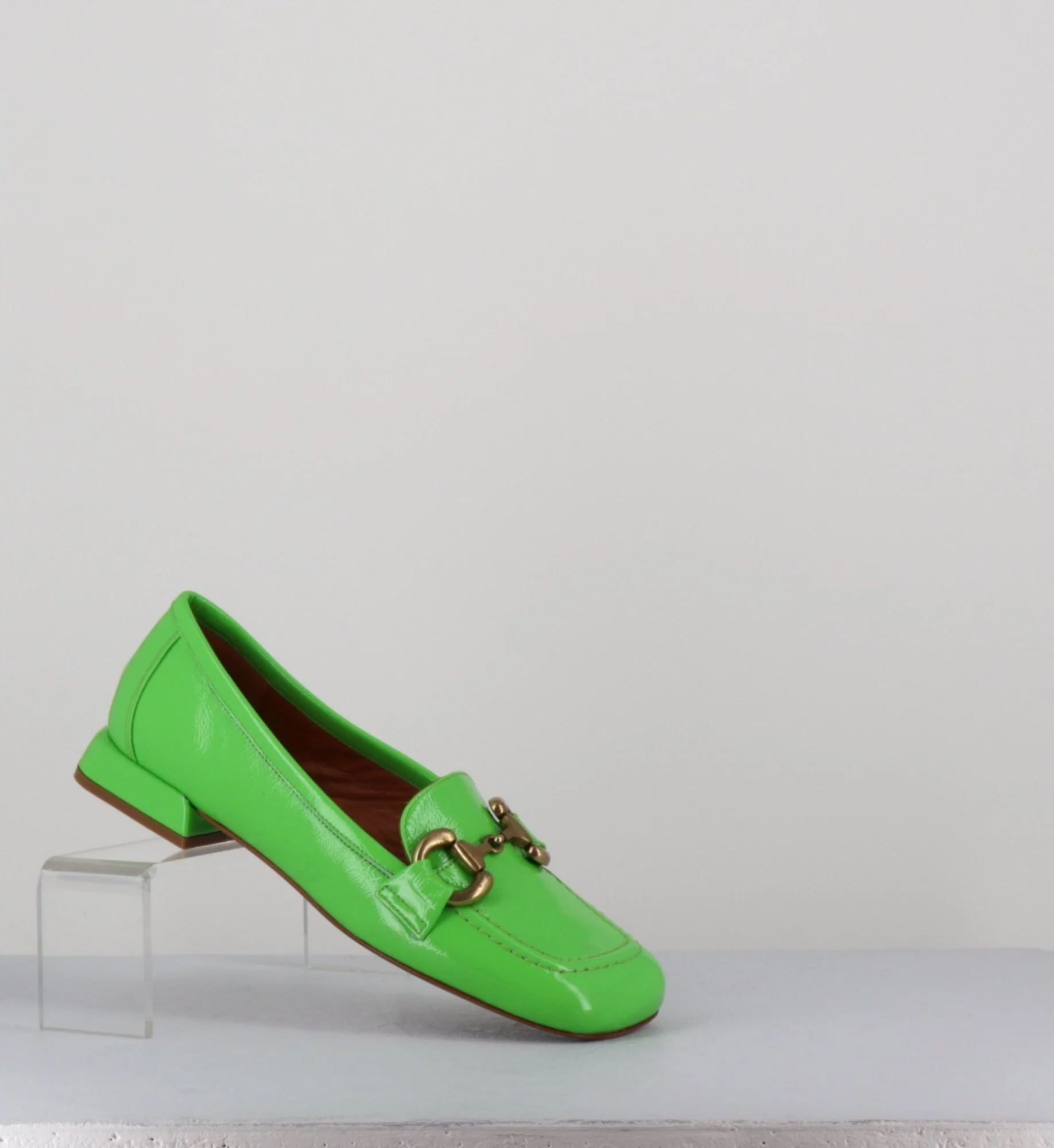 Mocassins « ballerines » en cuir vernis souple naplak vert pomme, bout carré large rétro & mors bronze, montées sur un petit talon structuré esprit 60s Fabrication Artisanale Italienne – Atelier GarriceLab Chausse légèrement grand