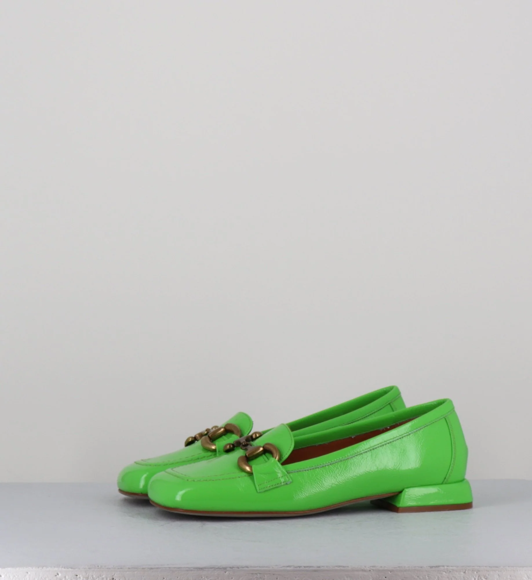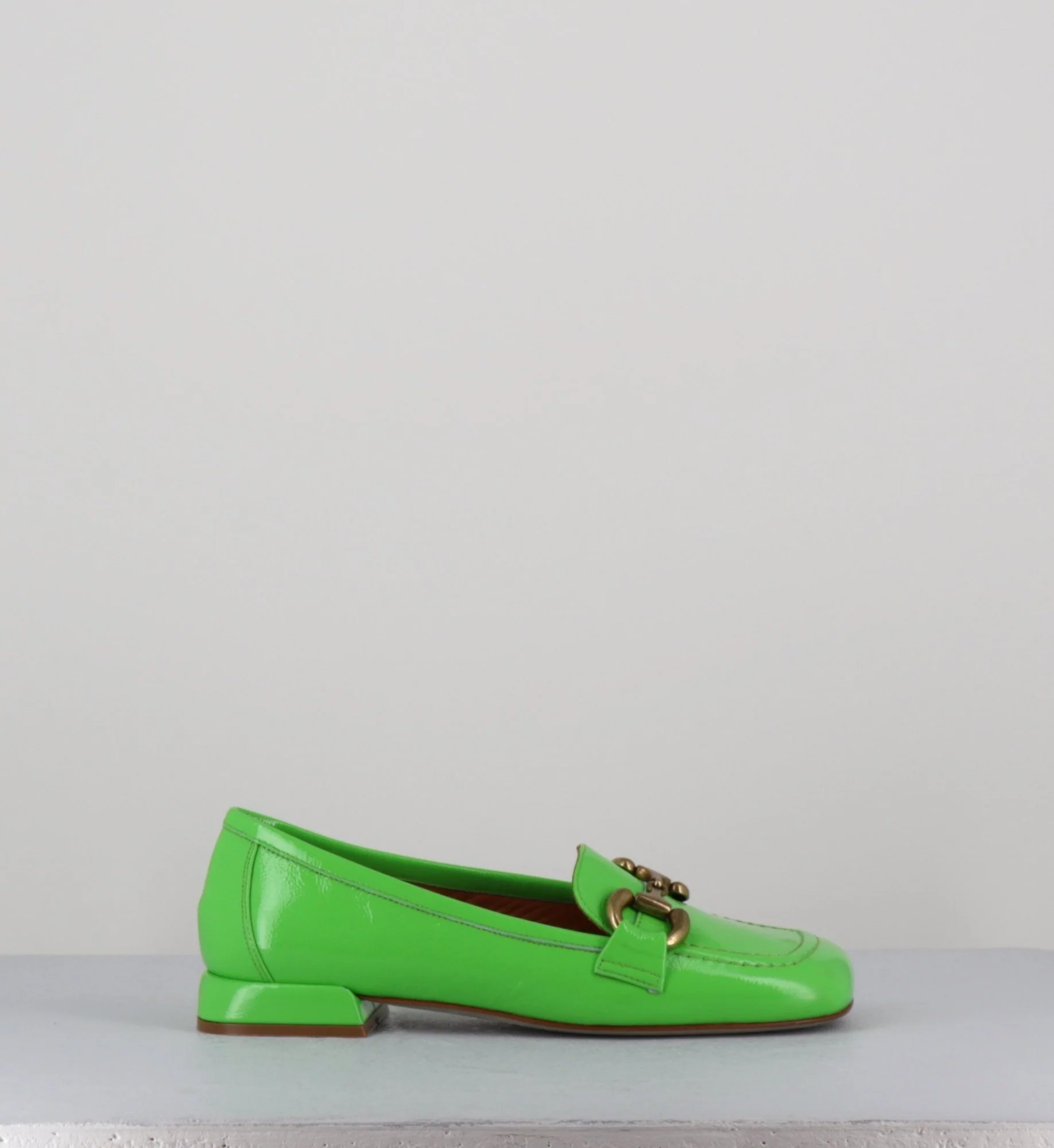 Mocassins « ballerines » en cuir vernis souple naplak vert pomme, bout carré large rétro & mors bronze, montées sur un petit talon structuré esprit 60s
