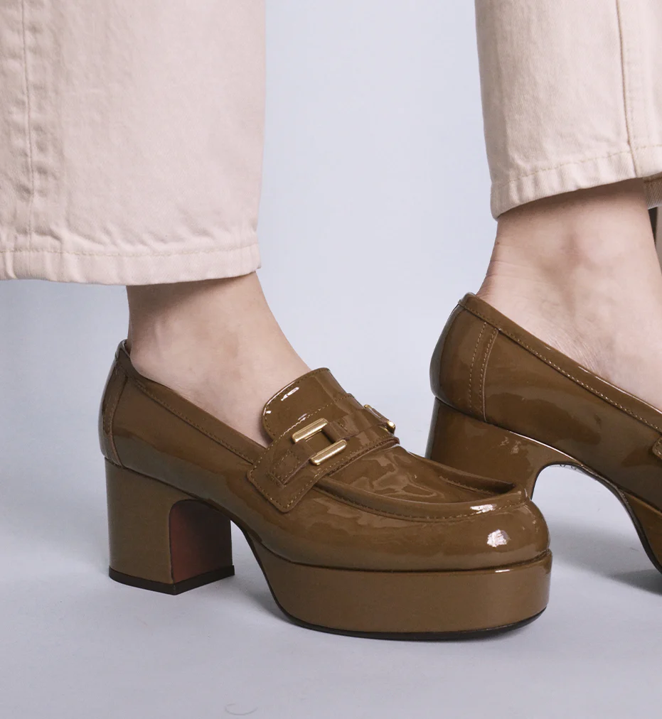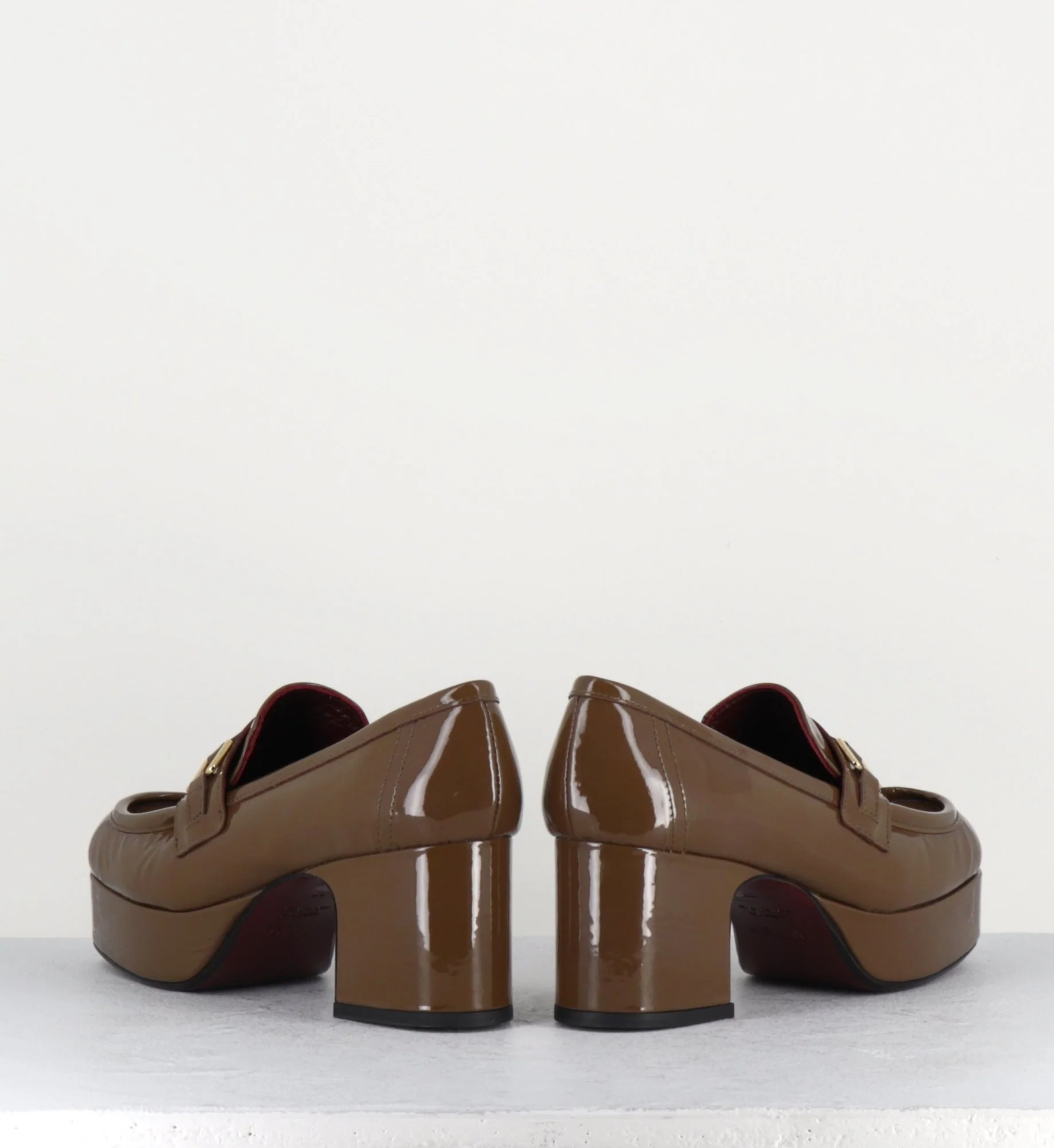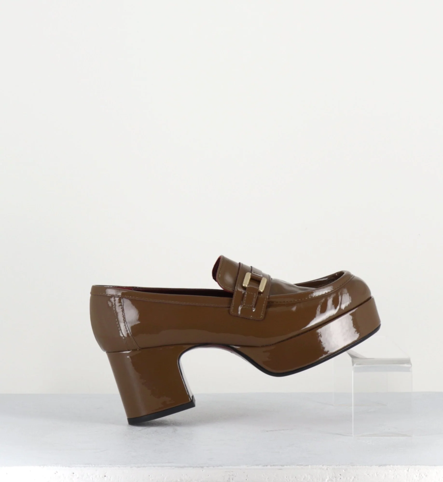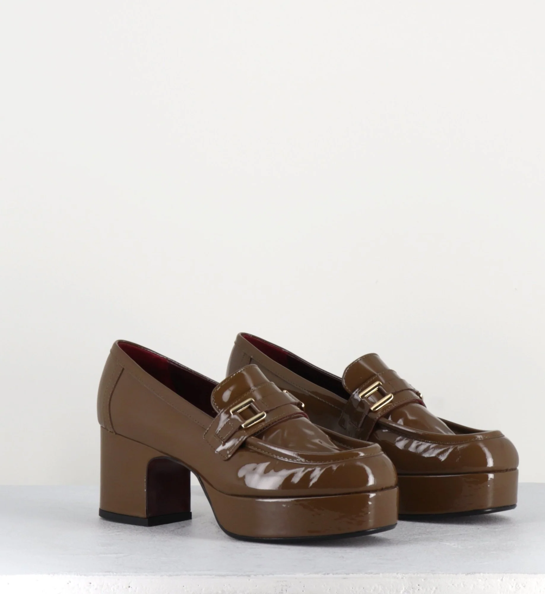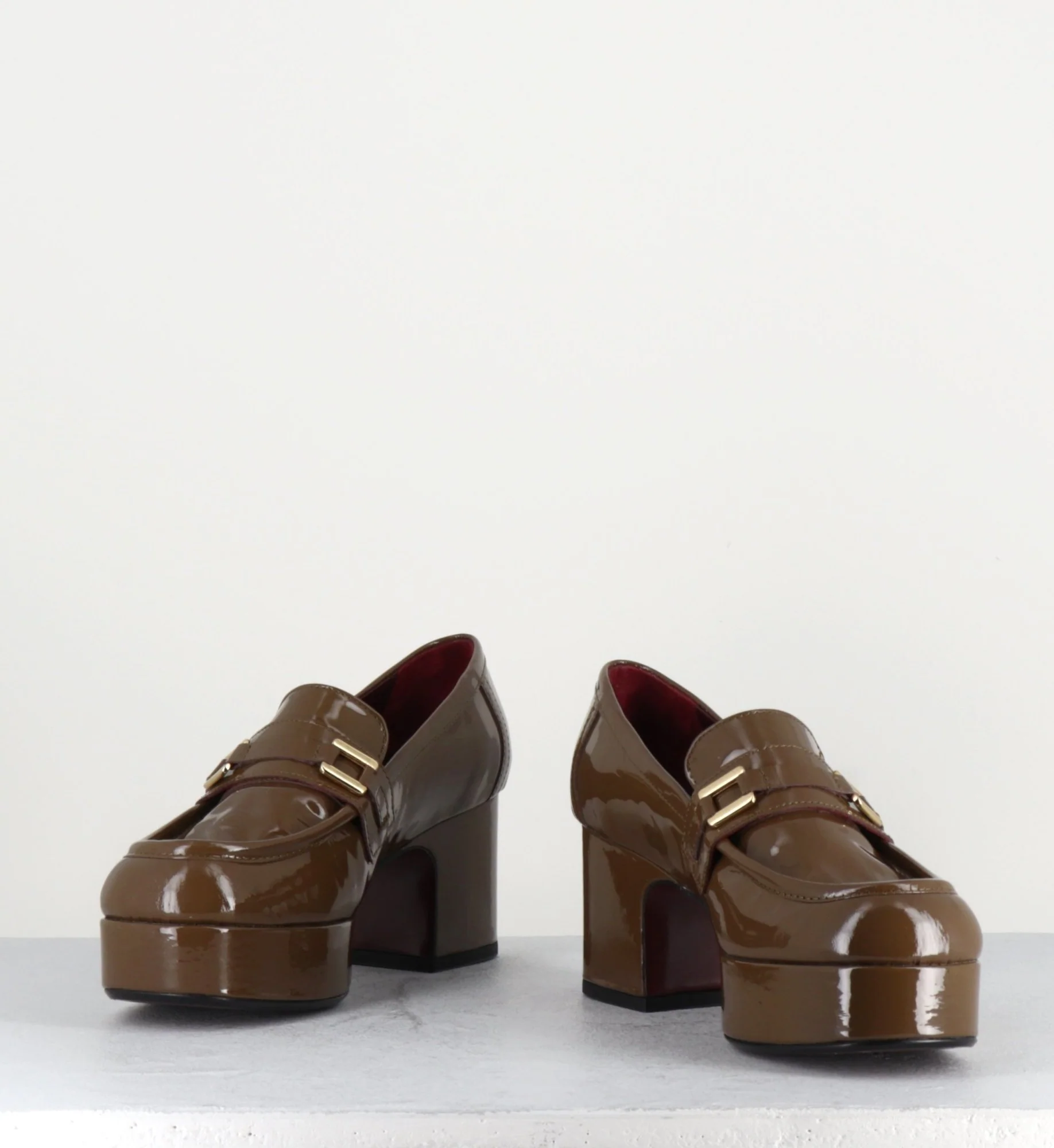 Mocassins à plateforme full cuir vernis olive & petit bijoux doré, montées sur un petit talon DISCO MOOD