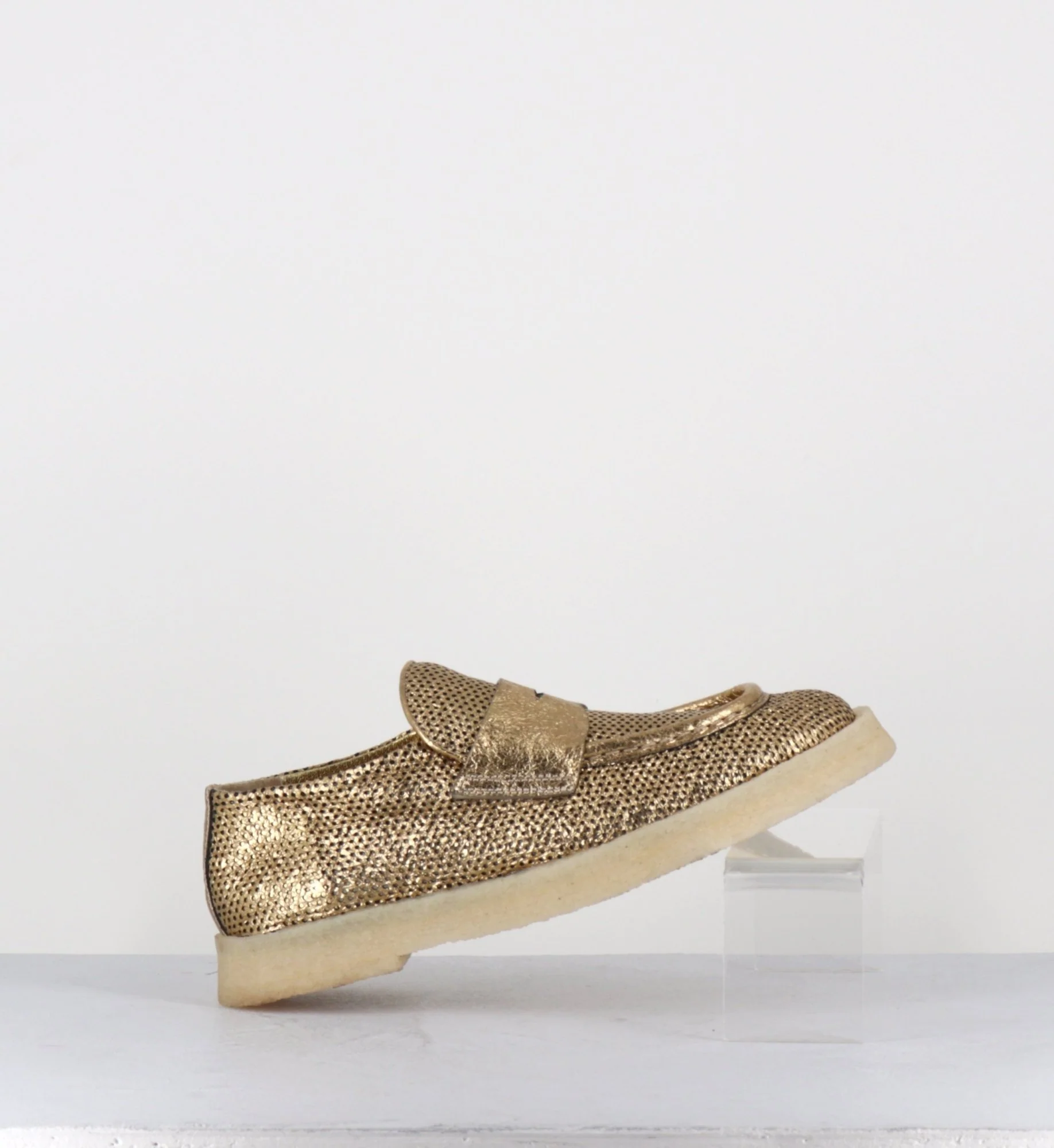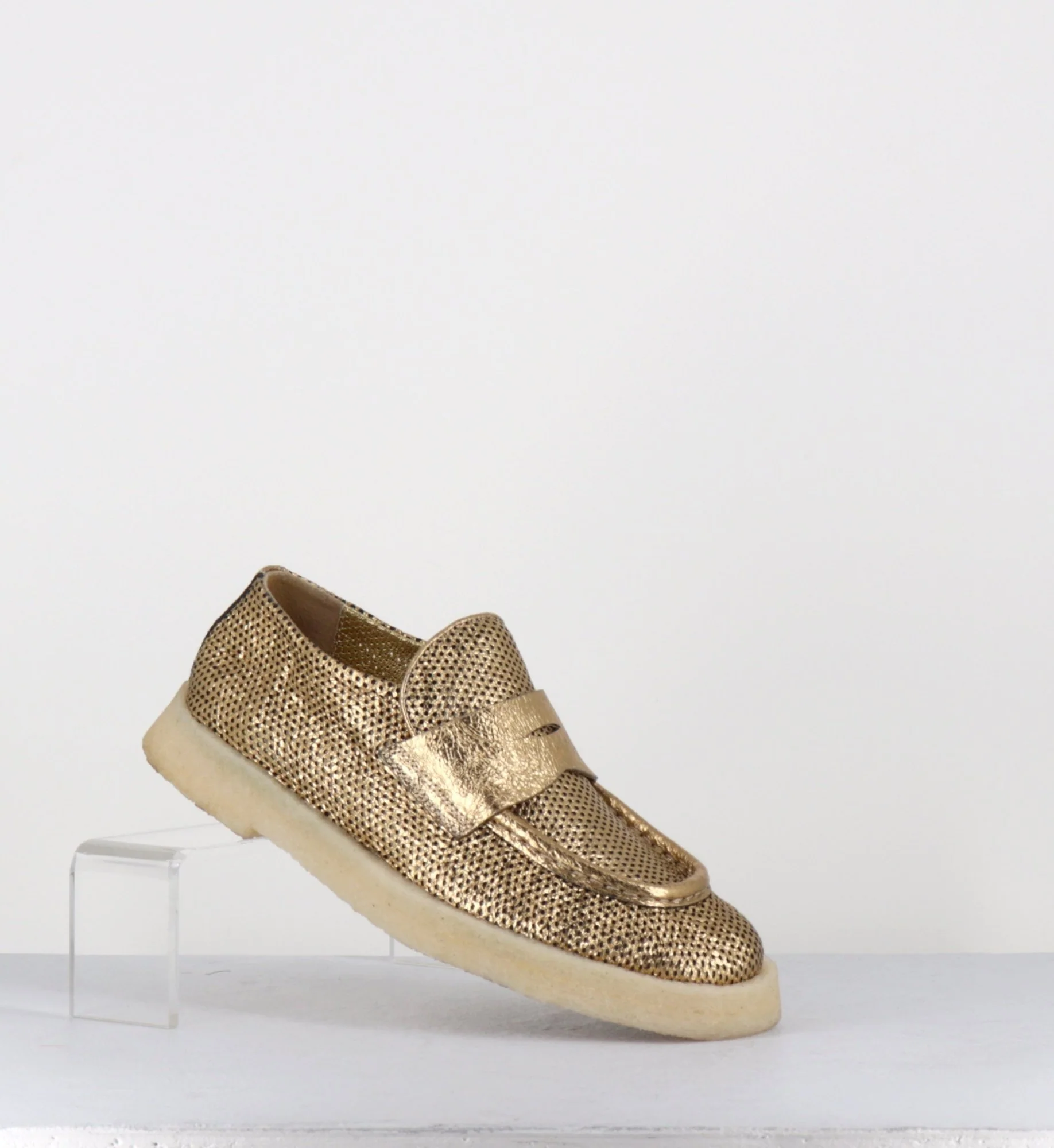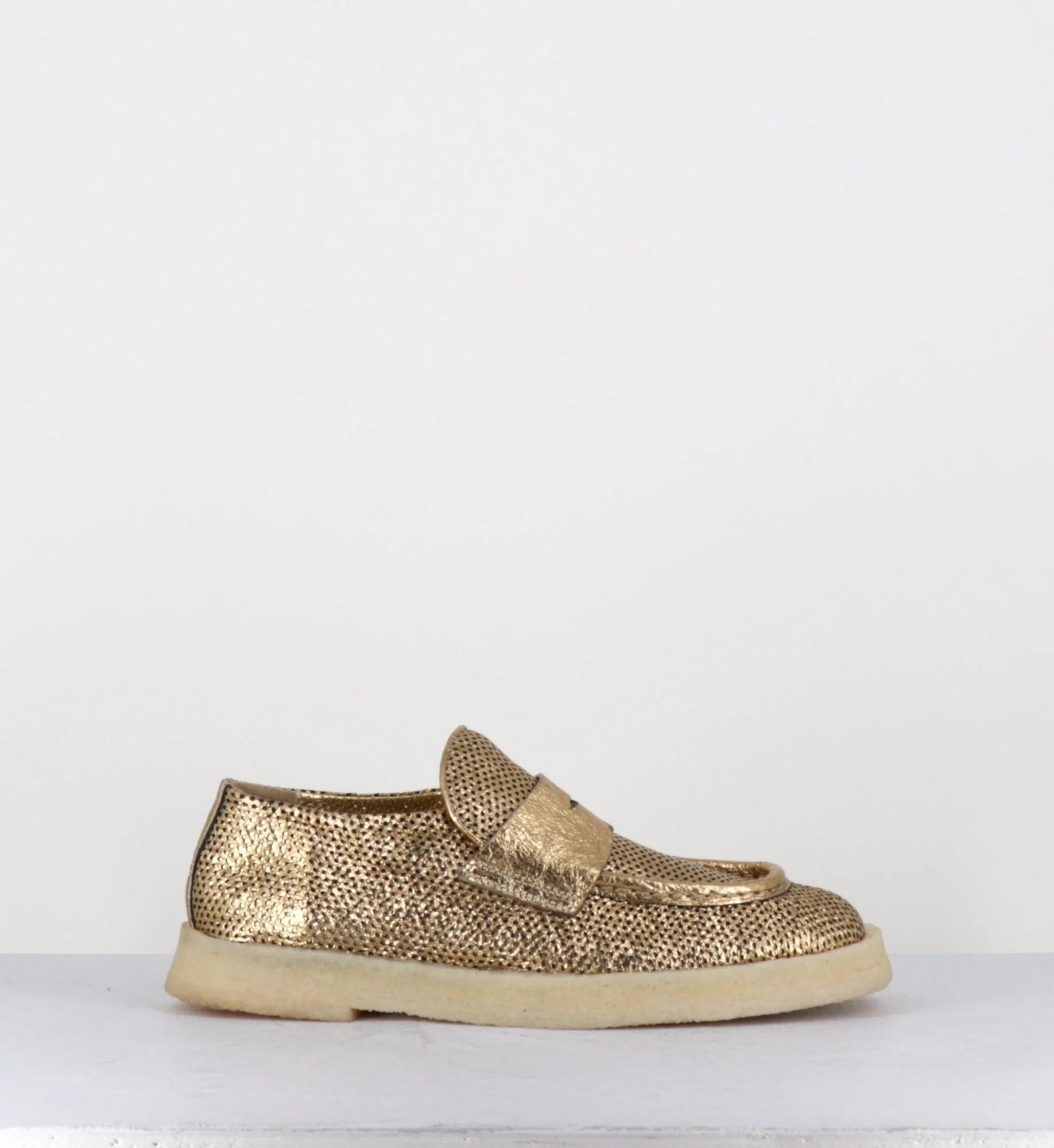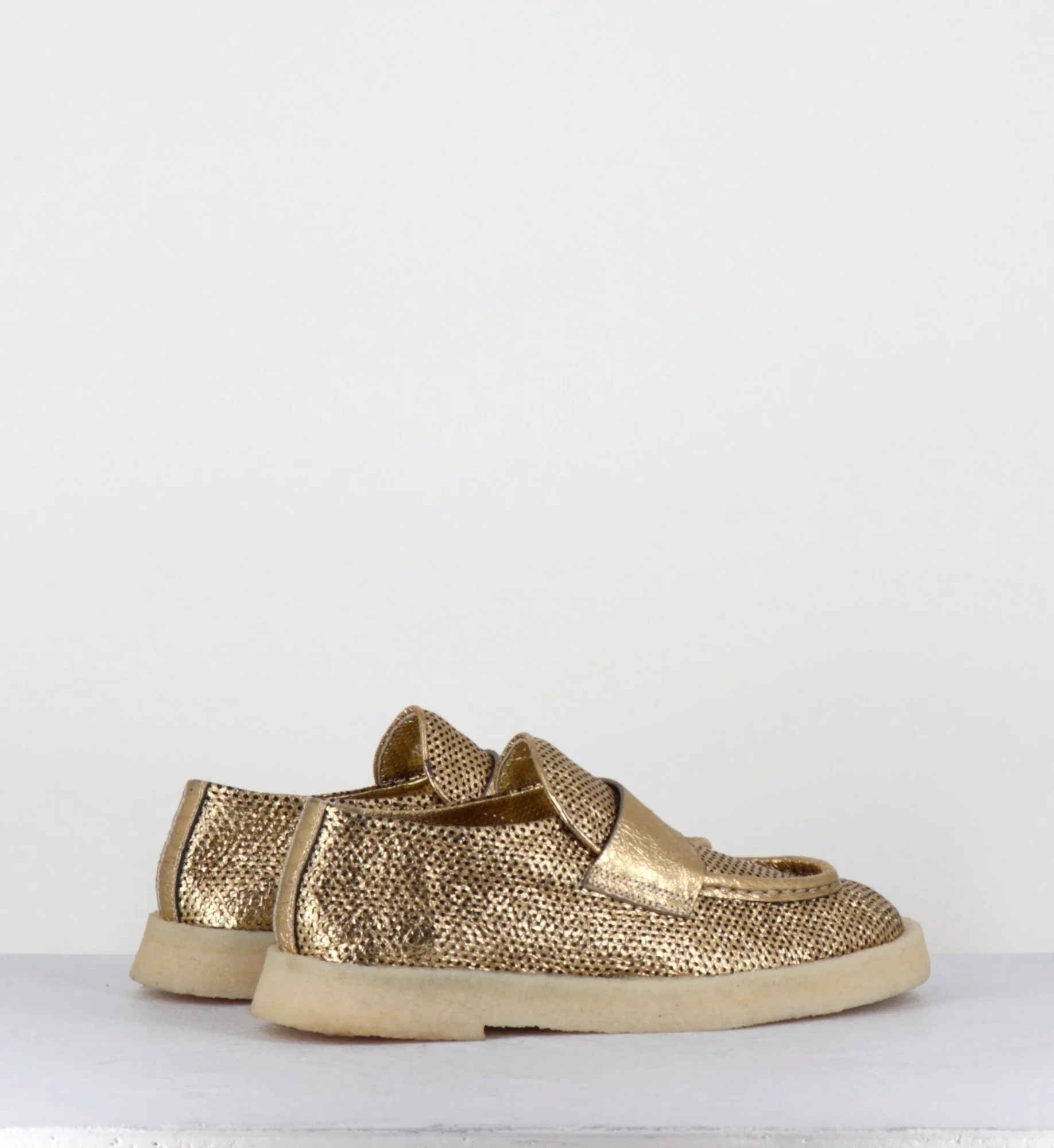 Mocassins en cuir métallisé doré perforé et crêpe naturel, construction sacchetto extrêmement souple cousu intérieur extérieur, forme large à semelle légèrement débordante Fabrication Artisanale Italienne – Ateliers Rocco P Chausse légèrement grand