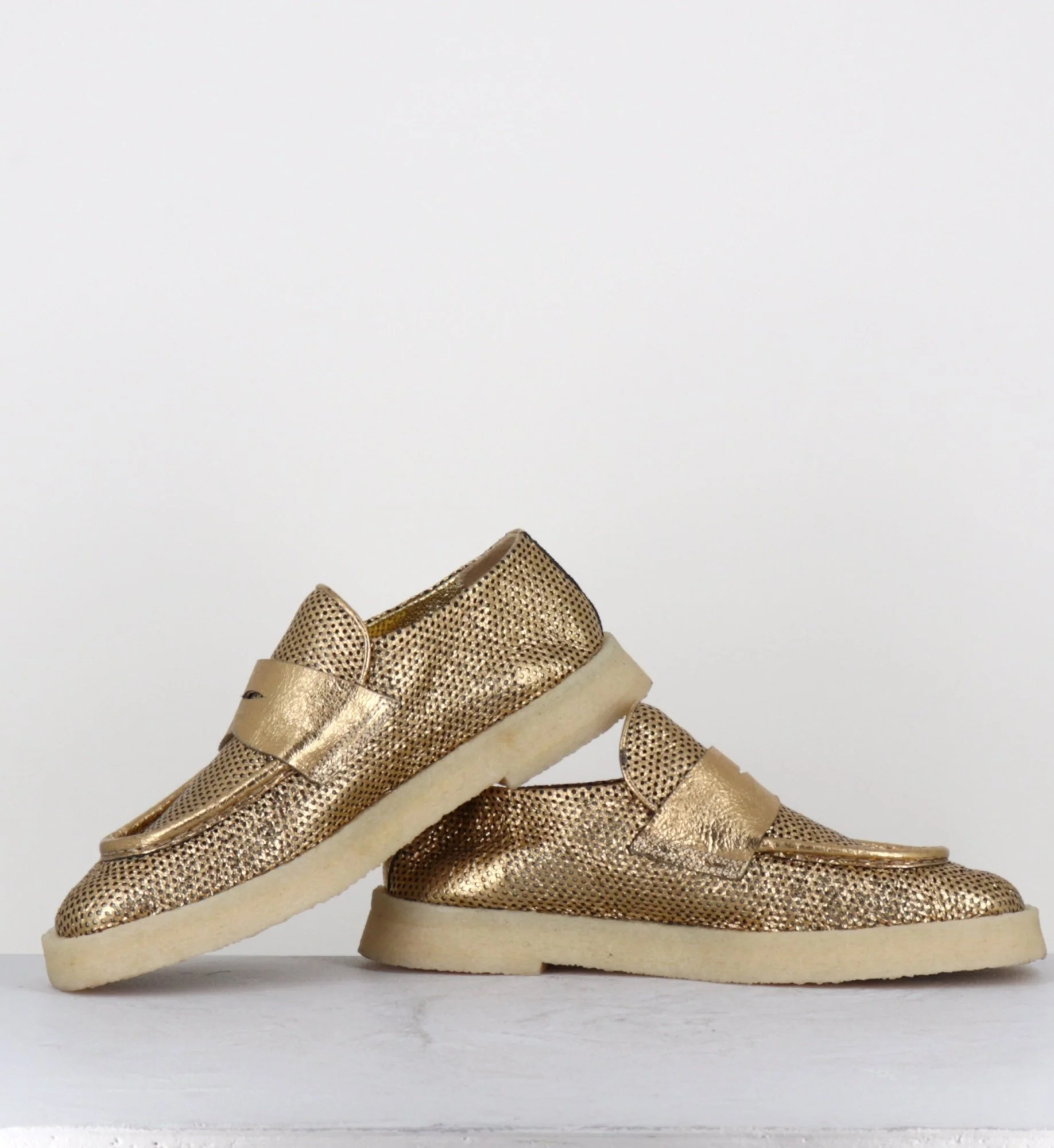 Mocassins en cuir métallisé doré perforé et crêpe naturel, construction sacchetto extrêmement souple cousu intérieur extérieur, forme large à semelle légèrement débordante
