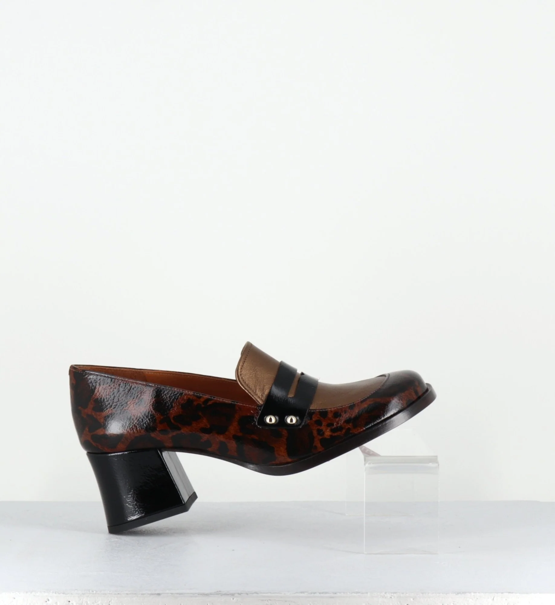 Chaussures mocassins en cuir imprimé leopard avec l’avant empeigne métallisée bronze, bout carré arrondi, montées sur un petit talon rétro légèrement évasé recouvert de cuir noir