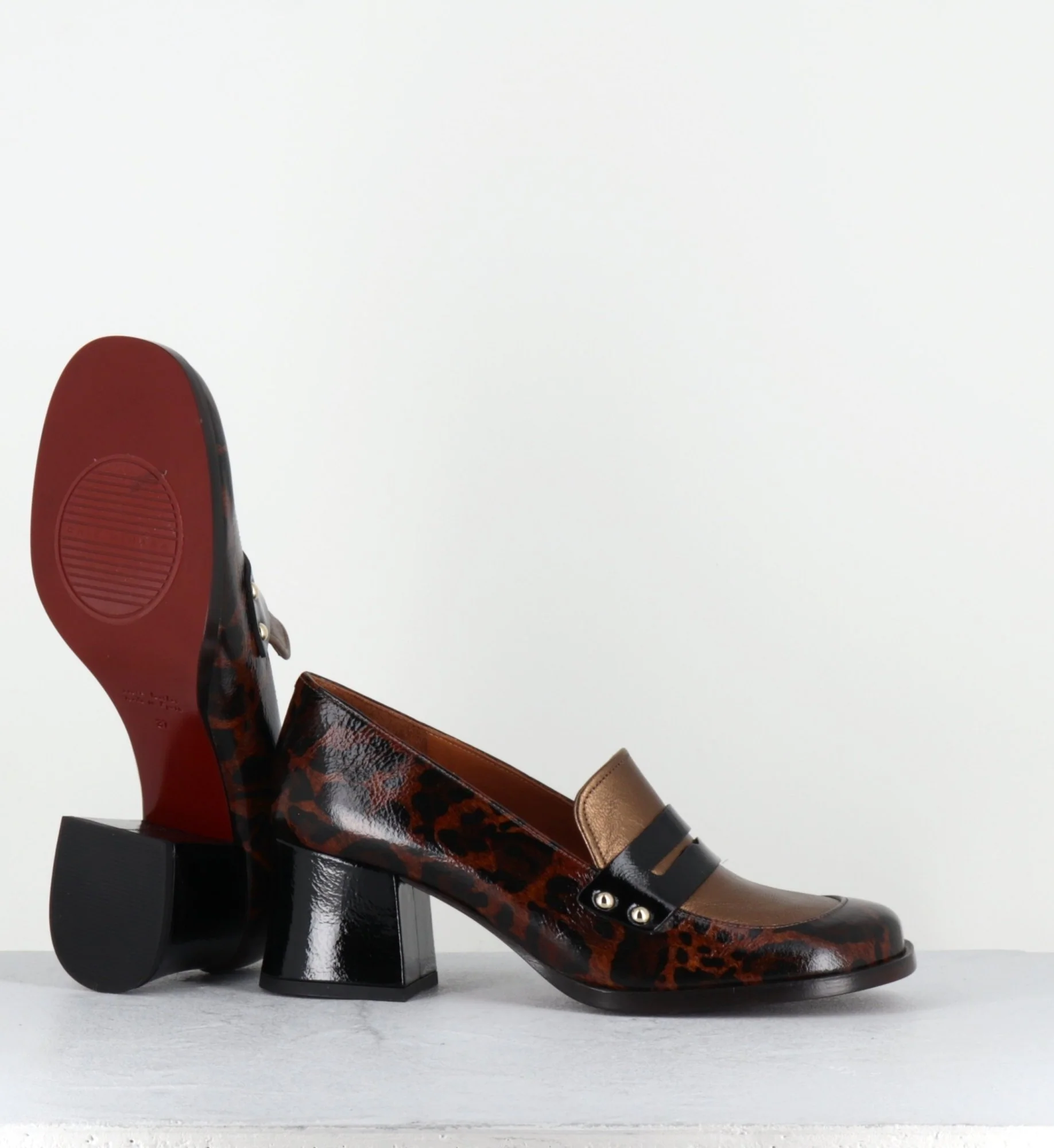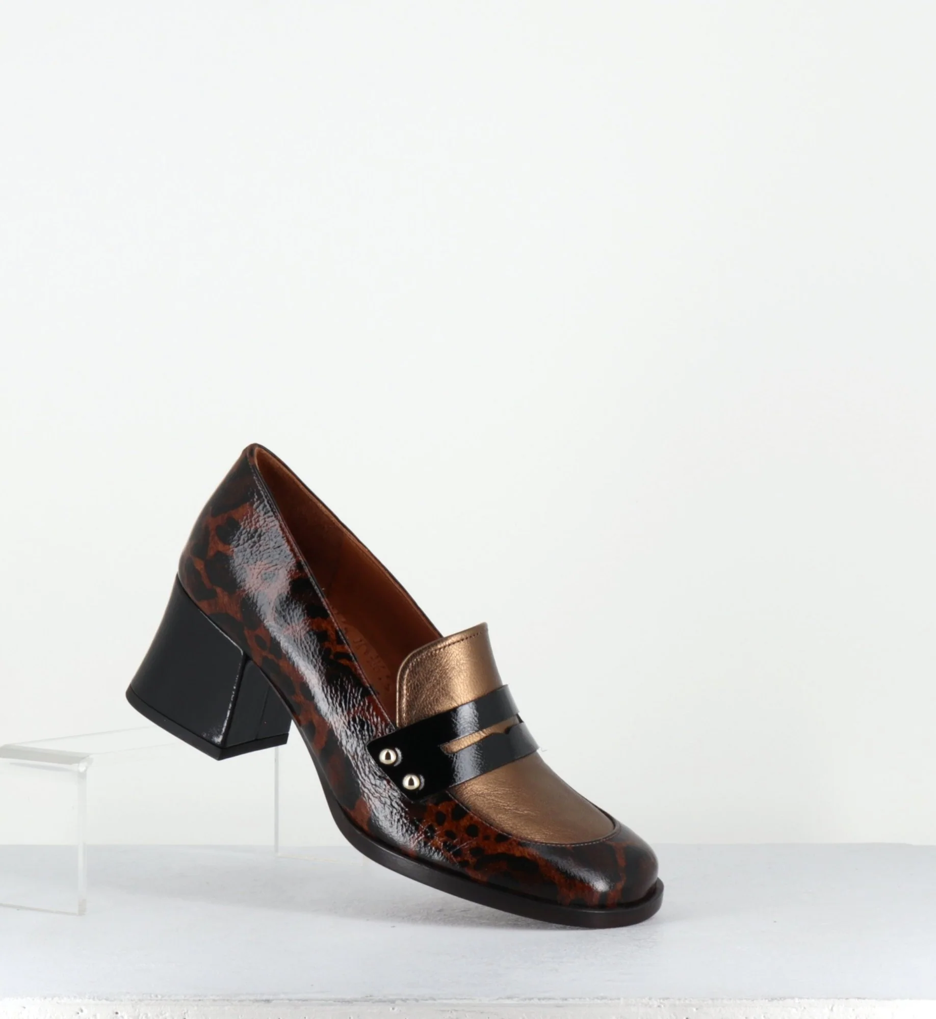Chaussures mocassins en cuir imprimé leopard avec l’avant empeigne métallisée bronze, bout carré arrondi, montées sur un petit talon rétro légèrement évasé recouvert de cuir noir Fabrication Artisanale Espagnole – Ateliers Chie Mihara Chausse un peu grand