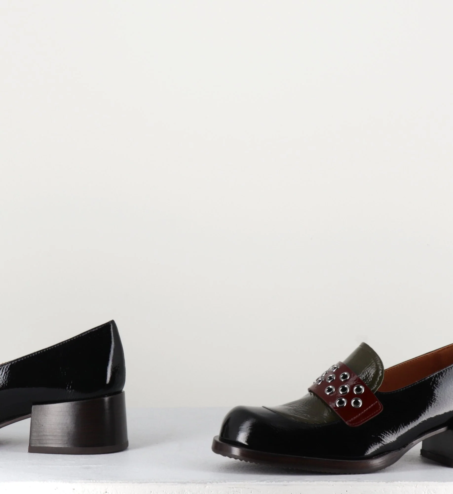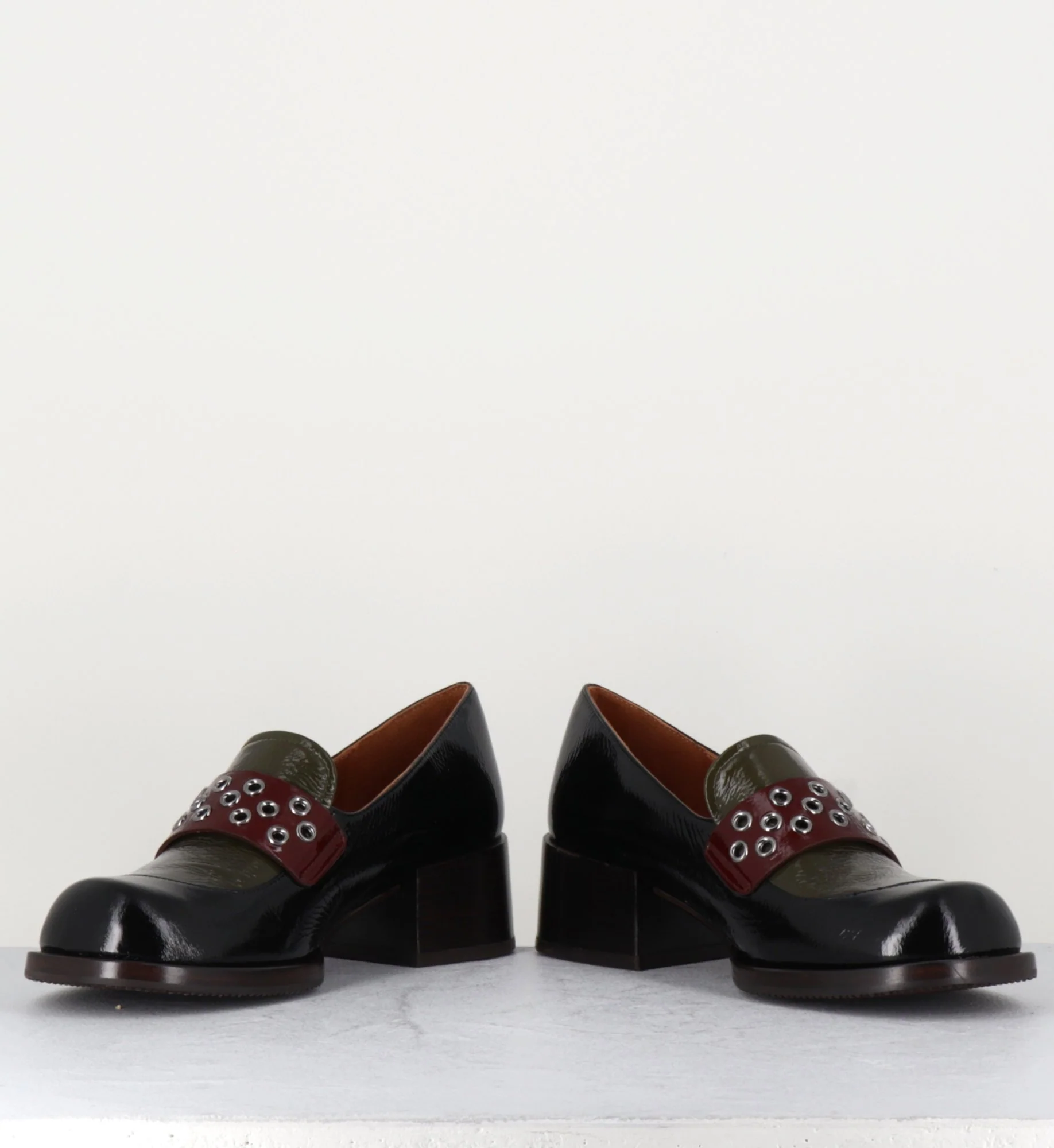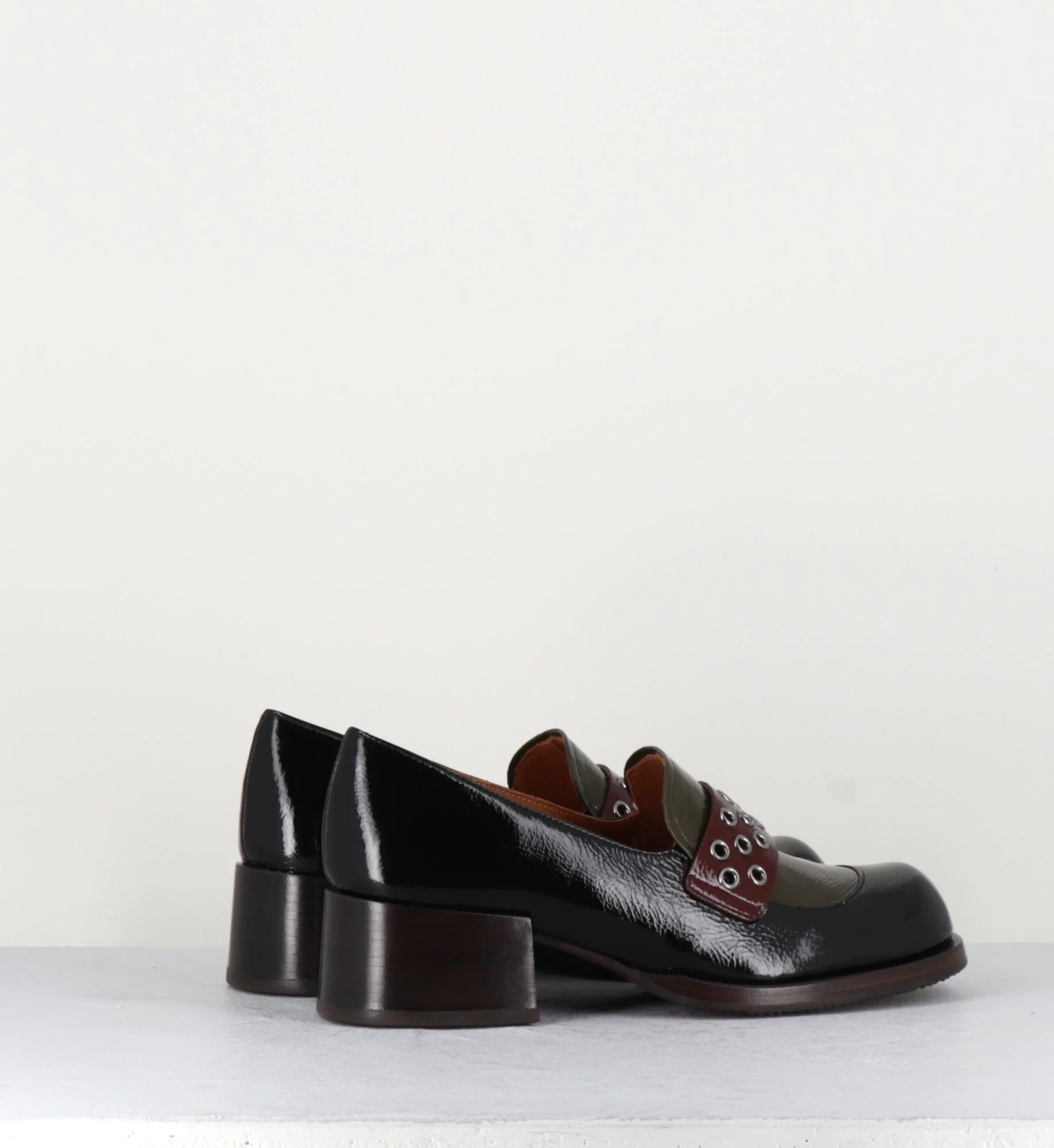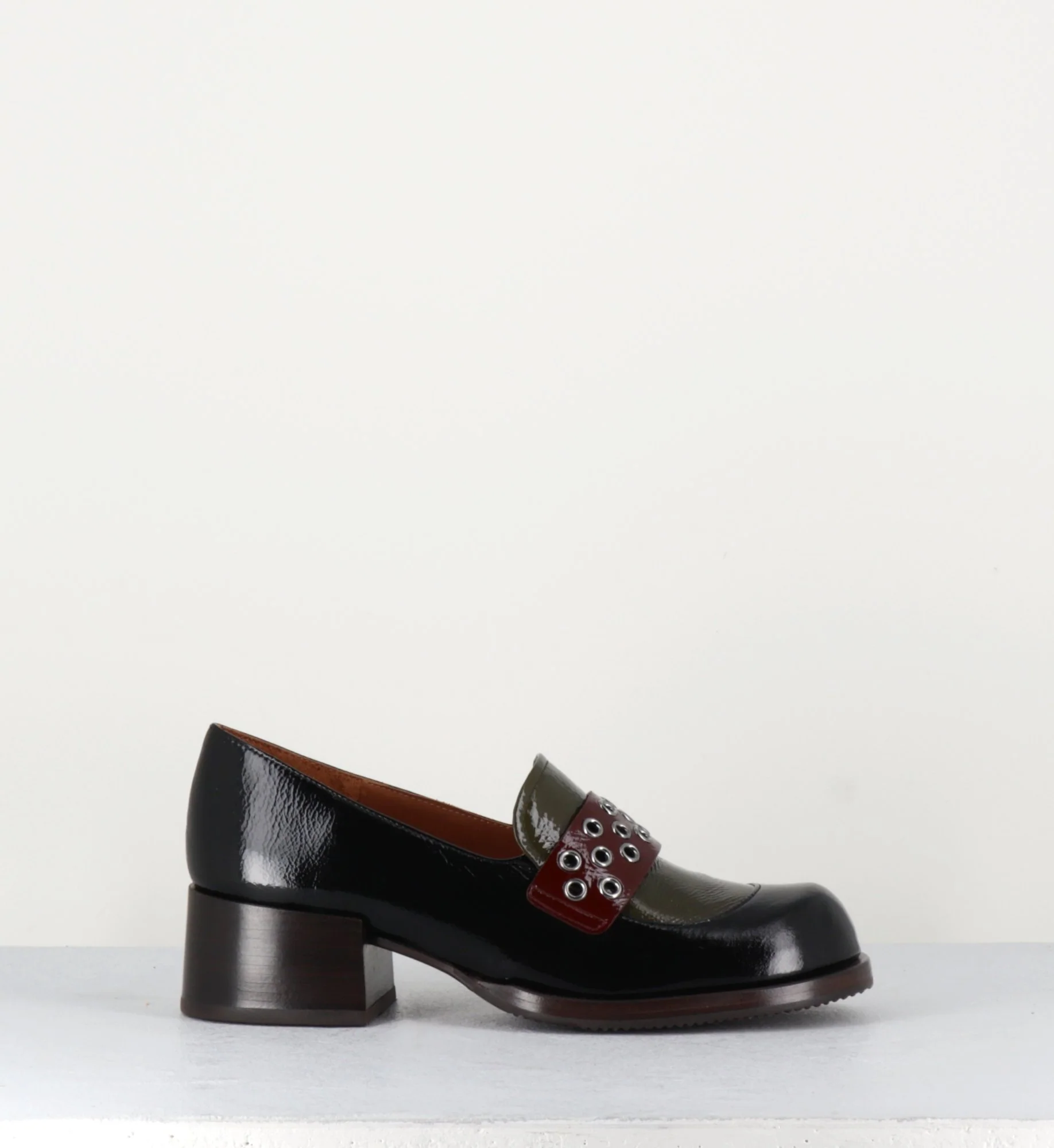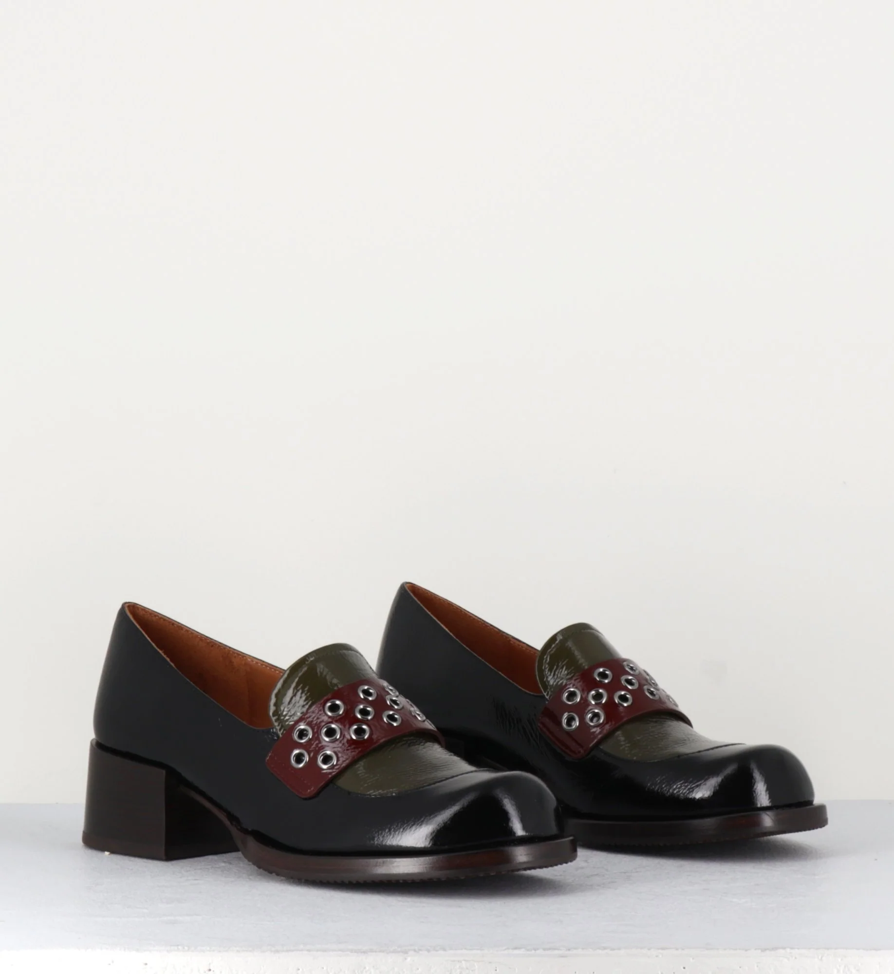 Mocassins en cuir effet vernis noir, empeigne vert olive & marron foncé, orné de petits oeillets en métal argent, montées sur une talon large rétro.