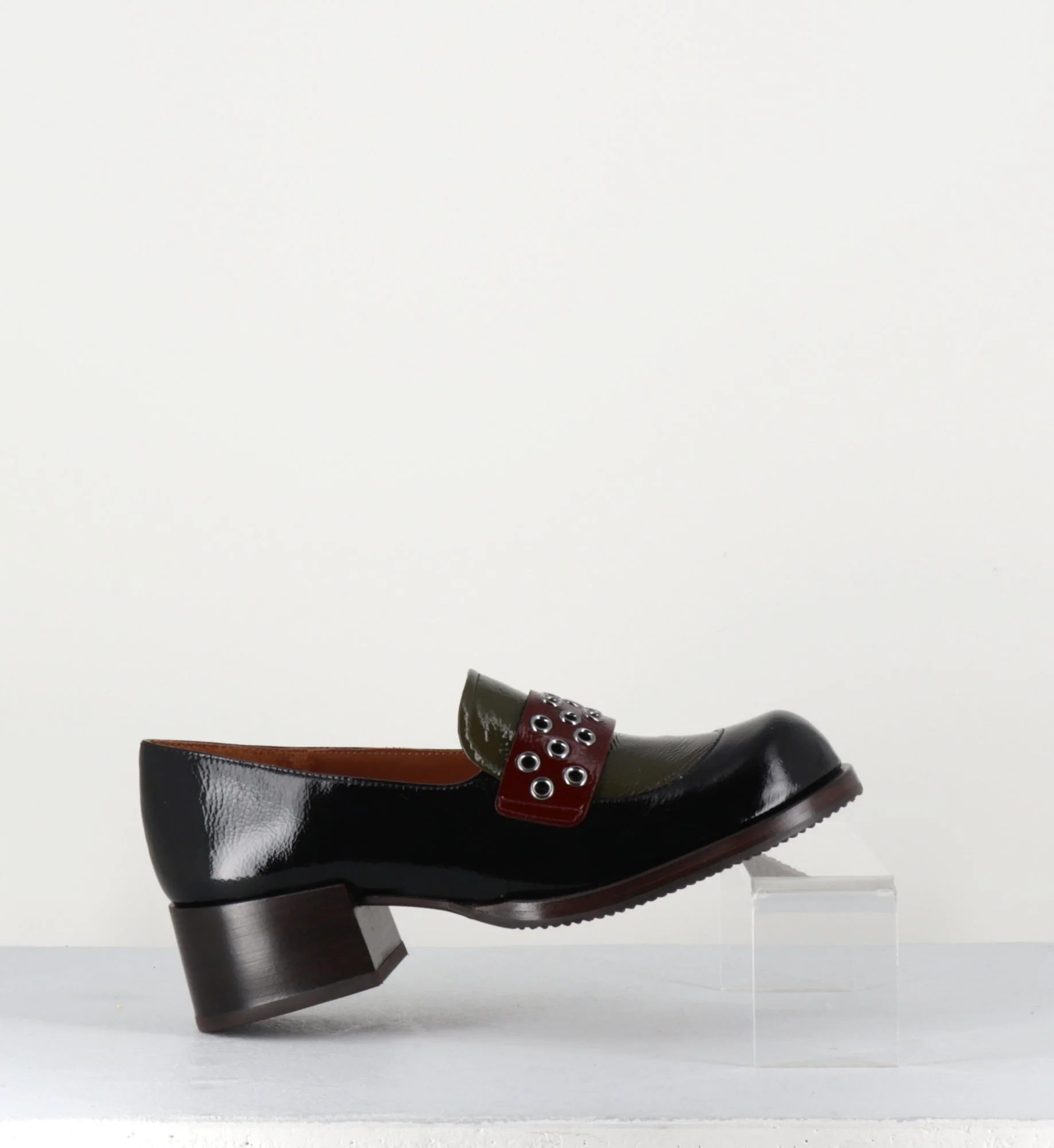Mocassins en cuir effet vernis noir, empeigne vert olive & marron foncé, orné de petits oeillets en métal argent, montées sur une talon large rétro. Fabrication Artisanale Espagnole – Ateliers Chie Mihara Chausse légèrement grand