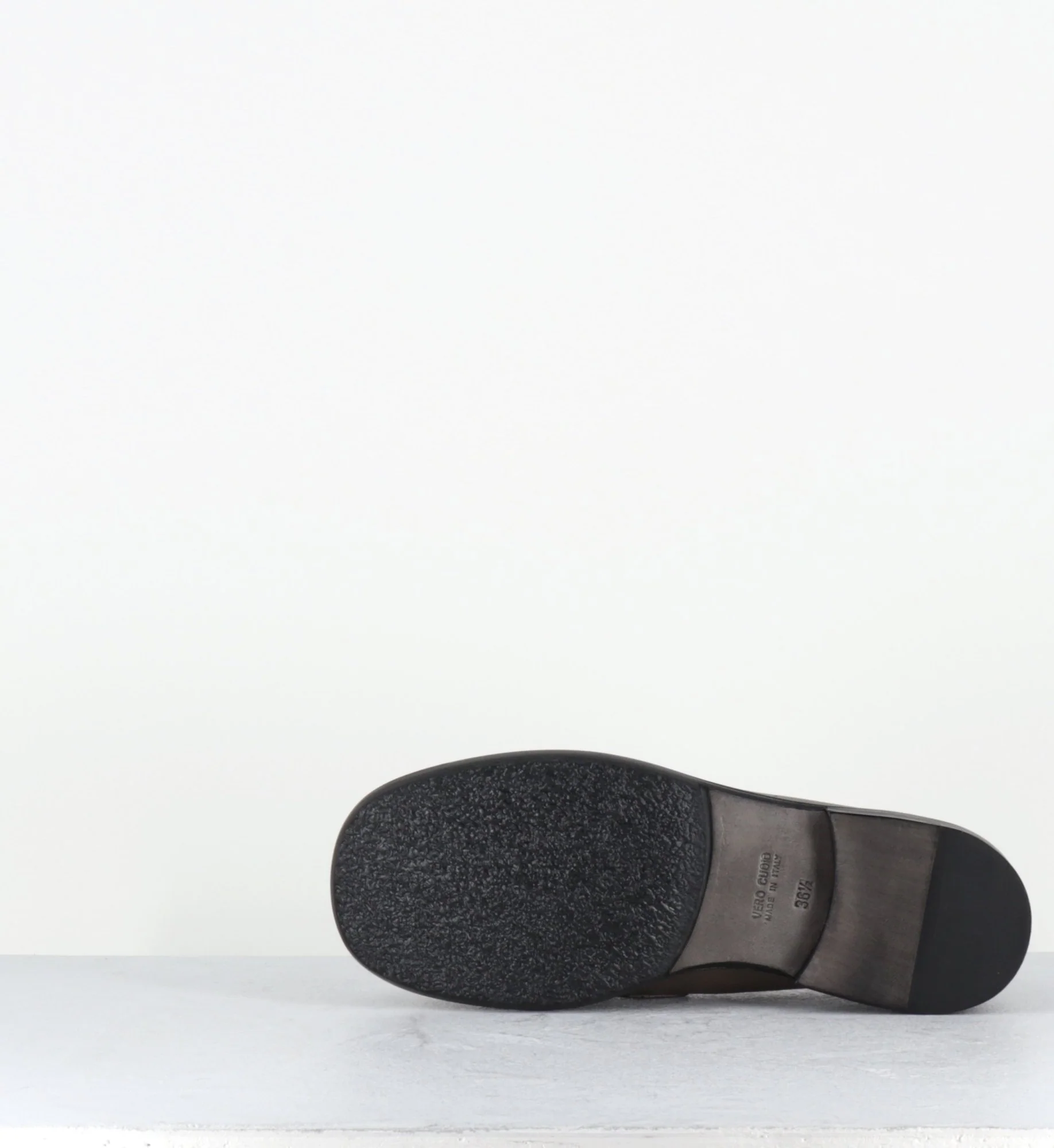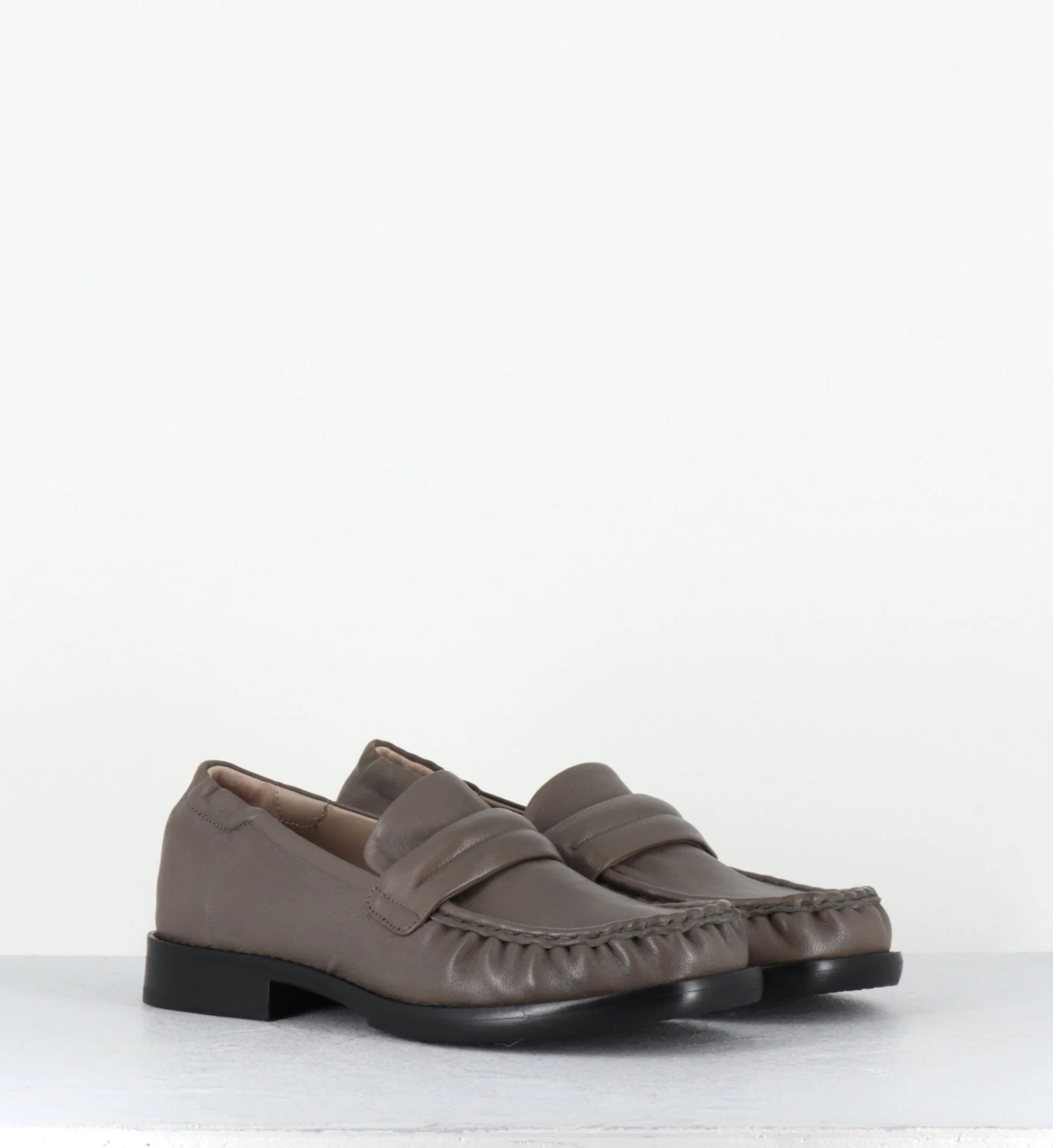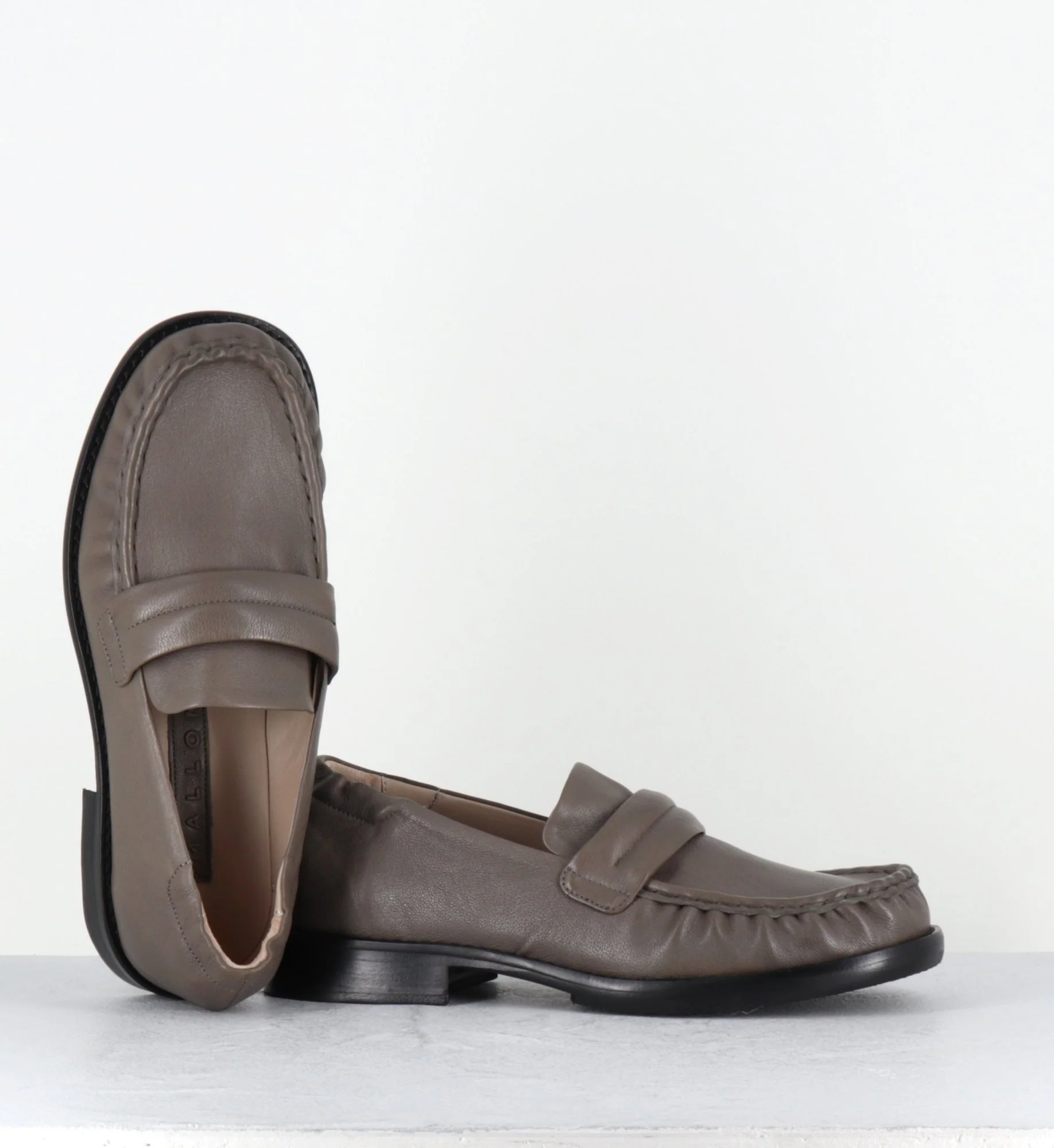Mocassins en cuir gris taupe souple , forme large bout carré arrondi, surpiqûres esprit vintage, montées sur une double semelle en cuir et un petit talon confortable Fabrication Artisanale Italienne – Ateliers Malloni Chausse grand – Préférez une pointure en dessous