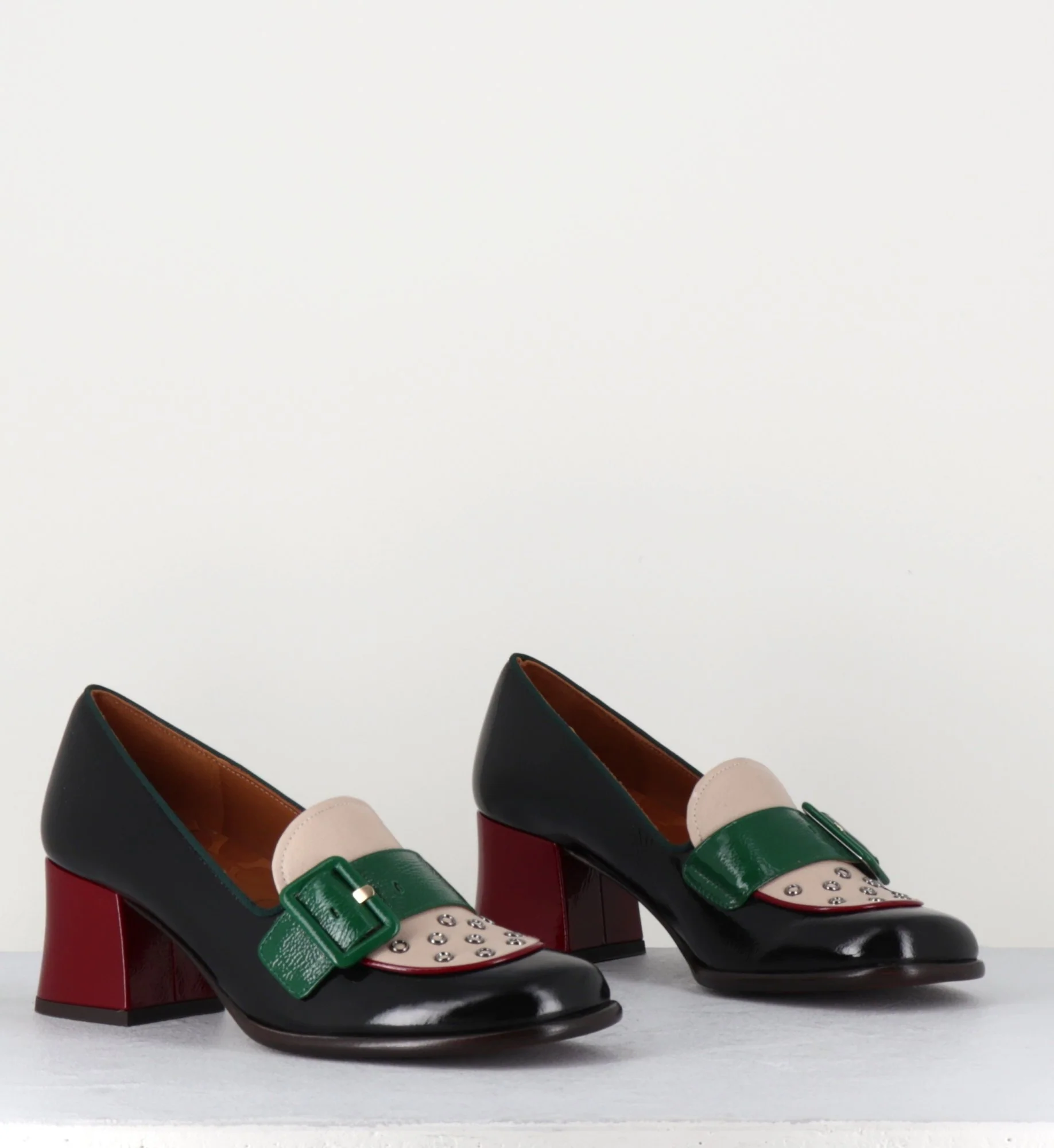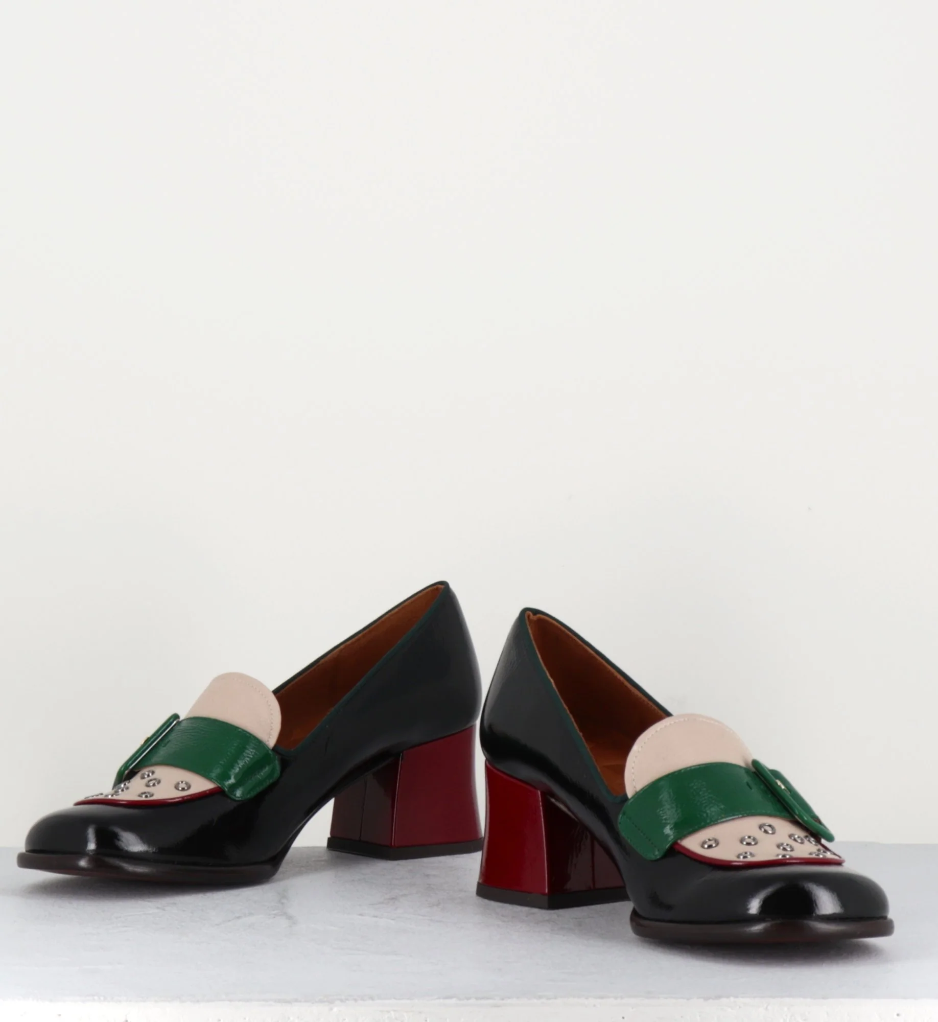 Mocassins bout carré arrondi en cuir souple effet vernis noir, empeigne en cuir beige ornée de petits oeillets et d’une bride à boucle en cuir effet vernis vert montées sur un petit talon rétro recouvert rouge.
