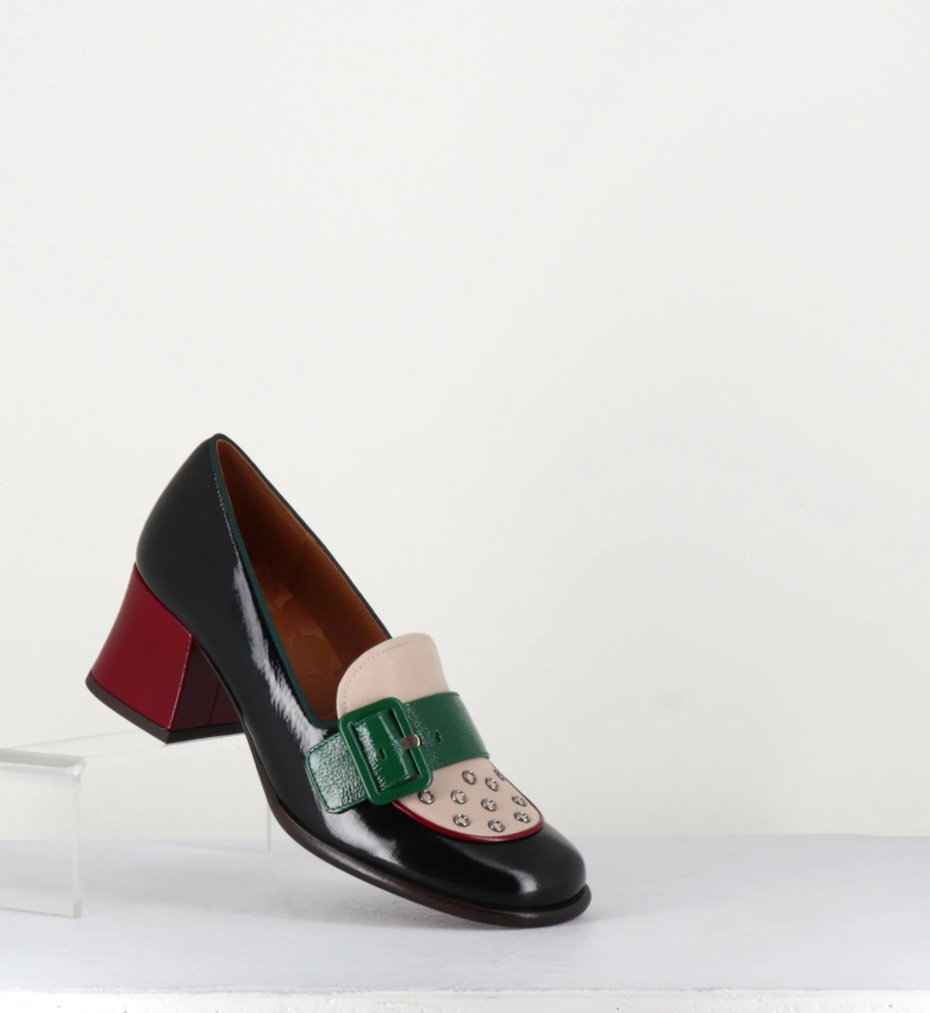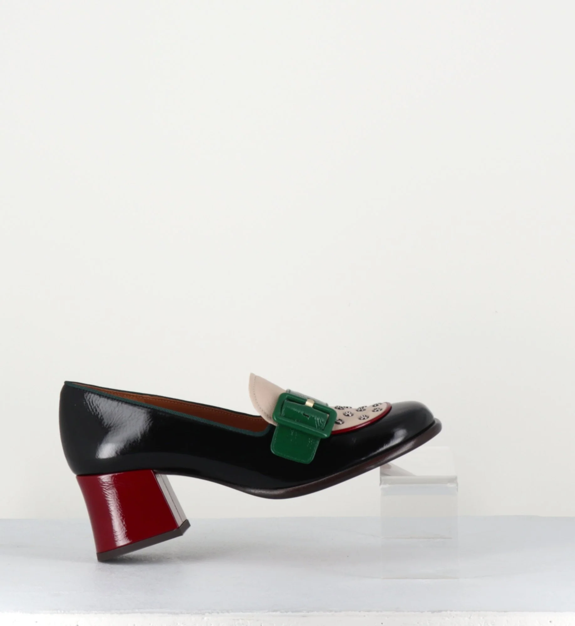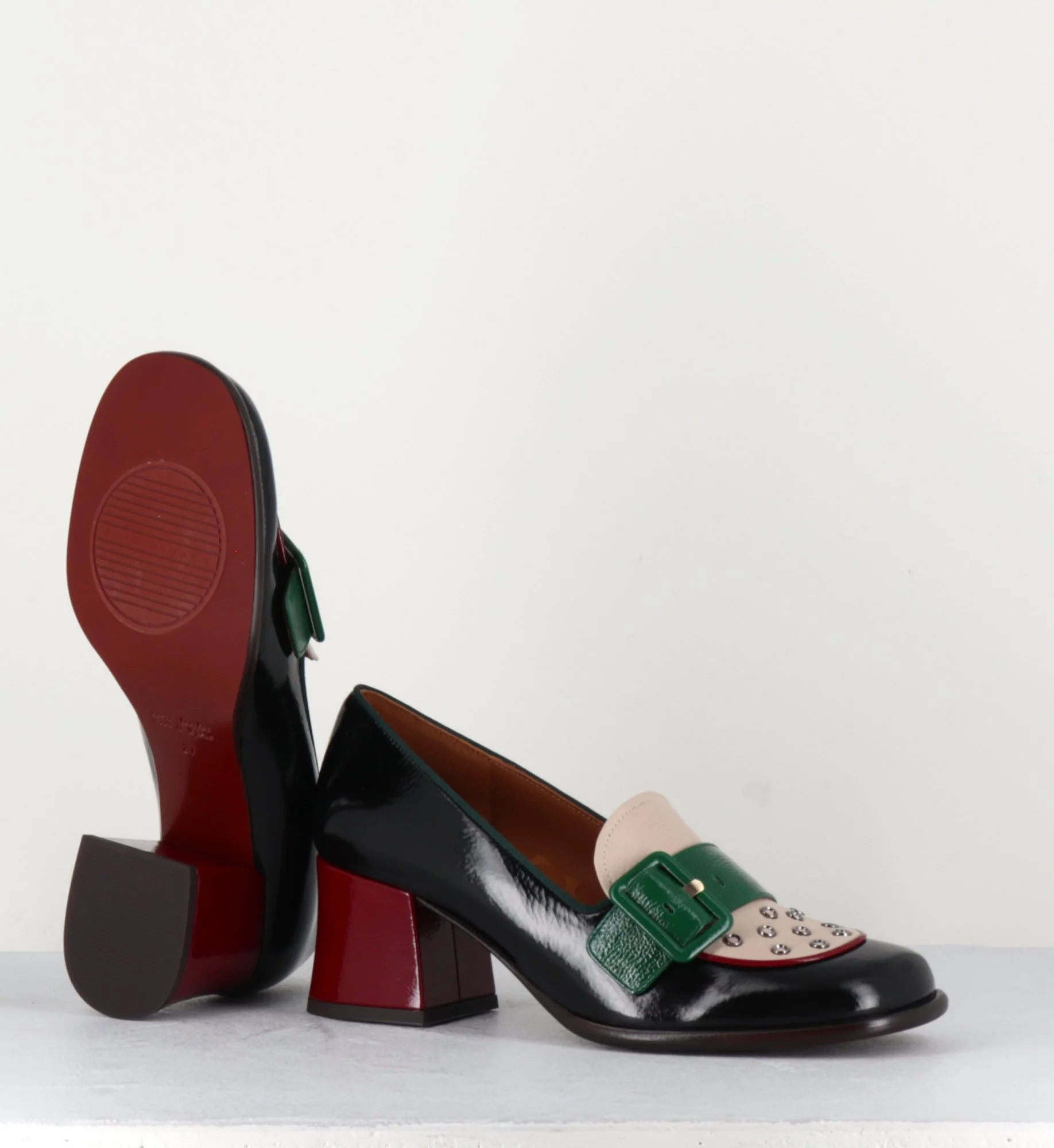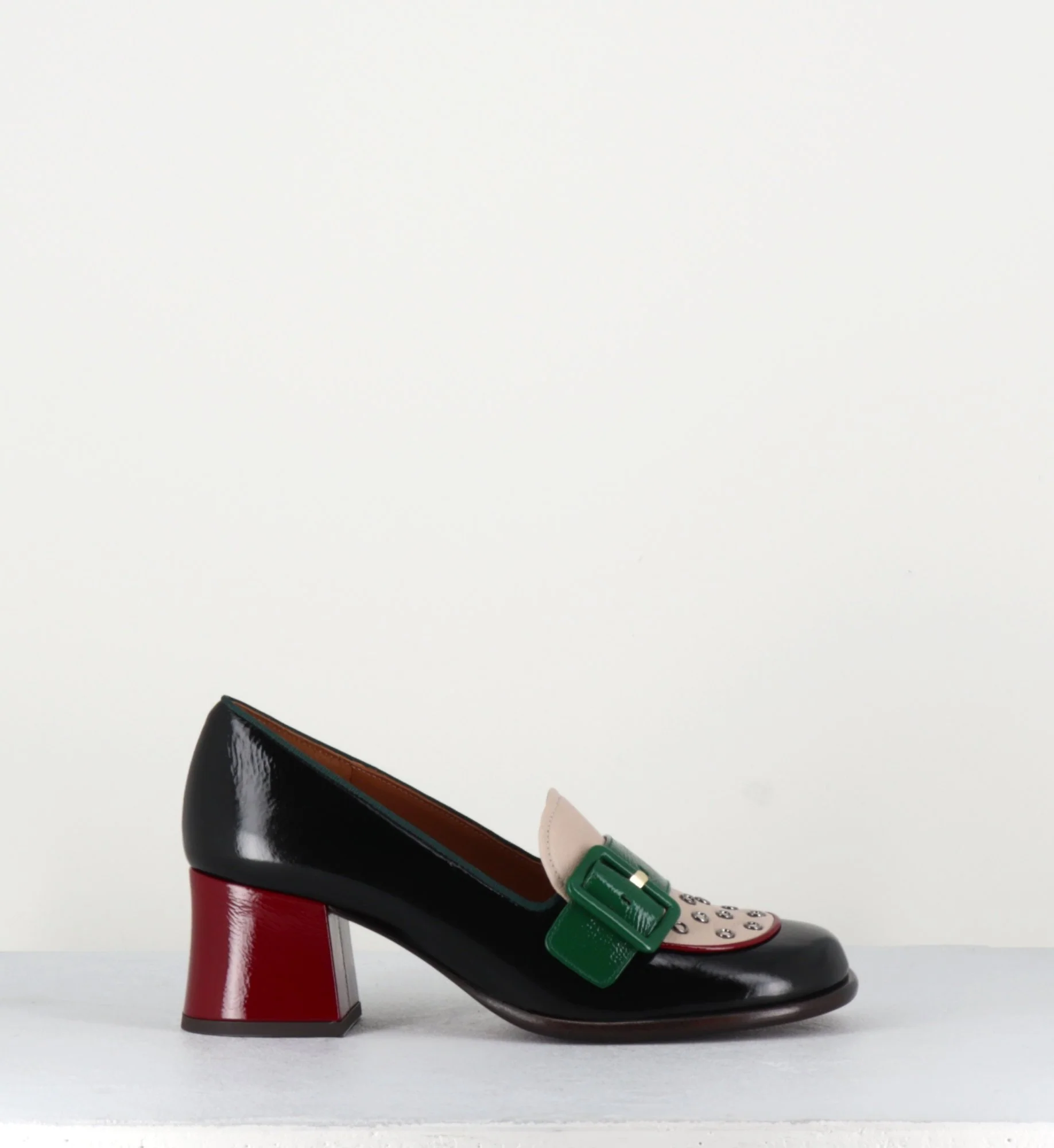 Mocassins bout carré arrondi en cuir souple effet vernis noir, empeigne en cuir beige ornée de petits oeillets et d’une bride à boucle en cuir effet vernis vert montées sur un petit talon rétro recouvert rouge. Fabrication Artisanale Espagnol – Ateliers Chie Mihara Chausse grand