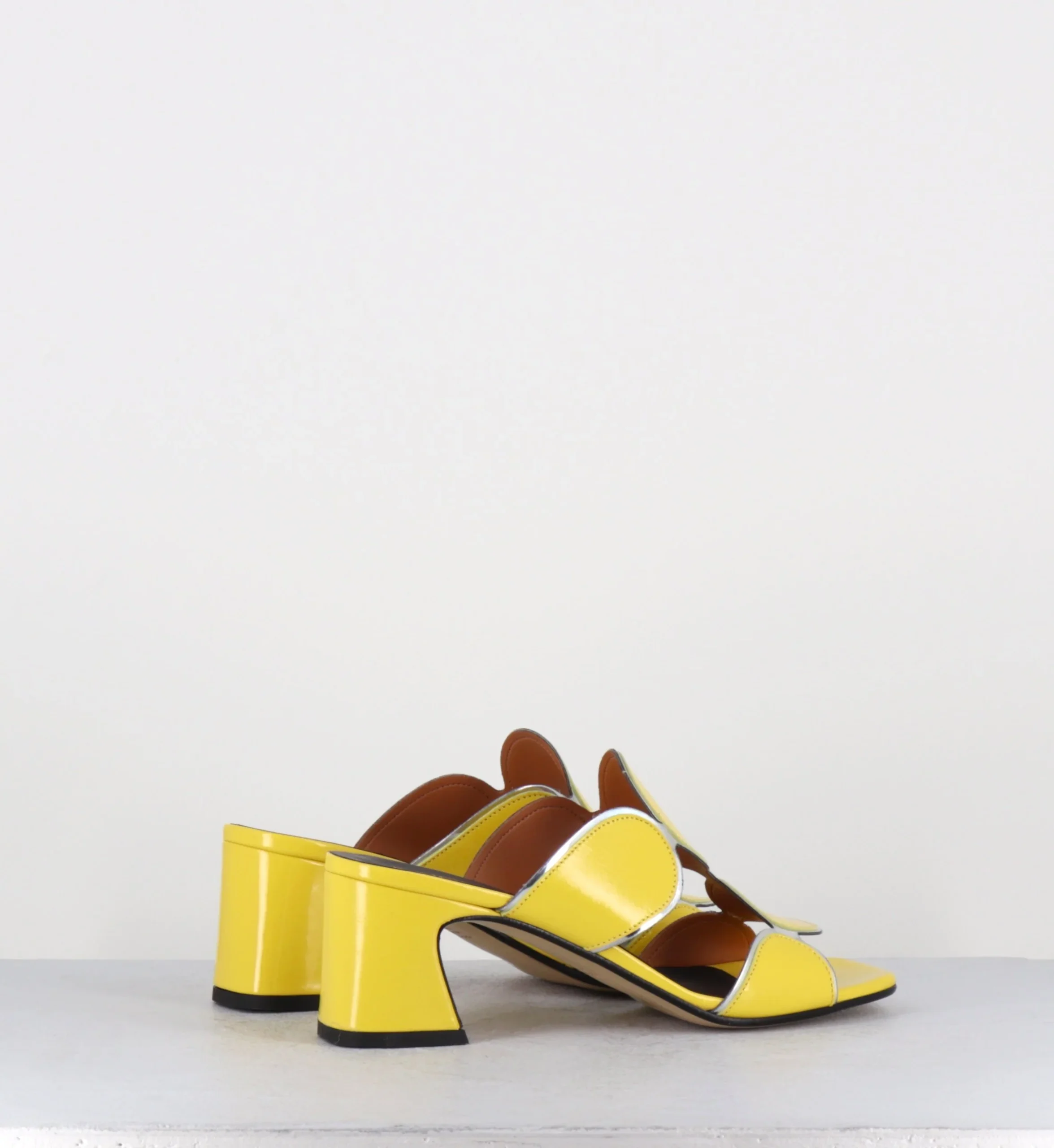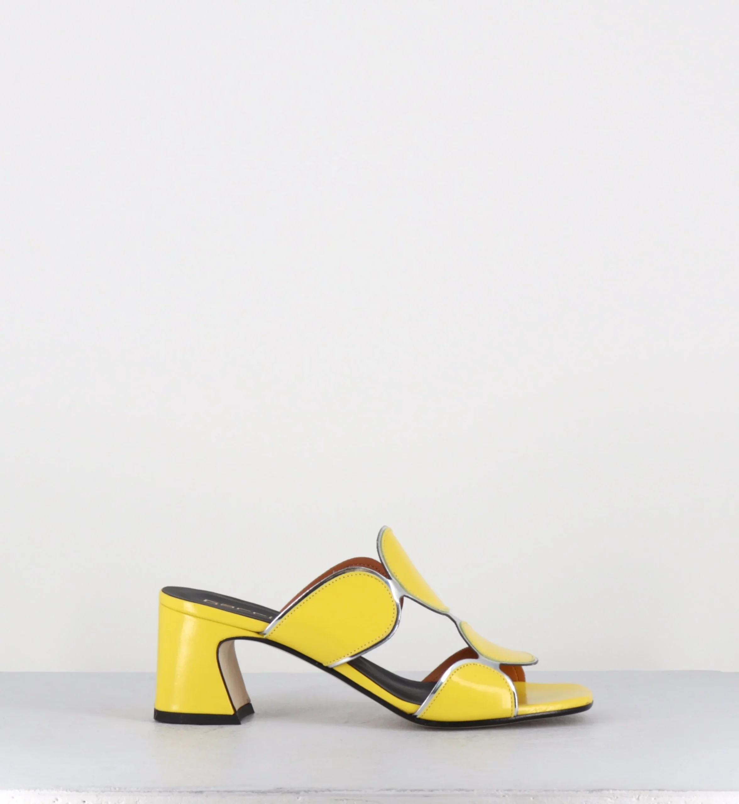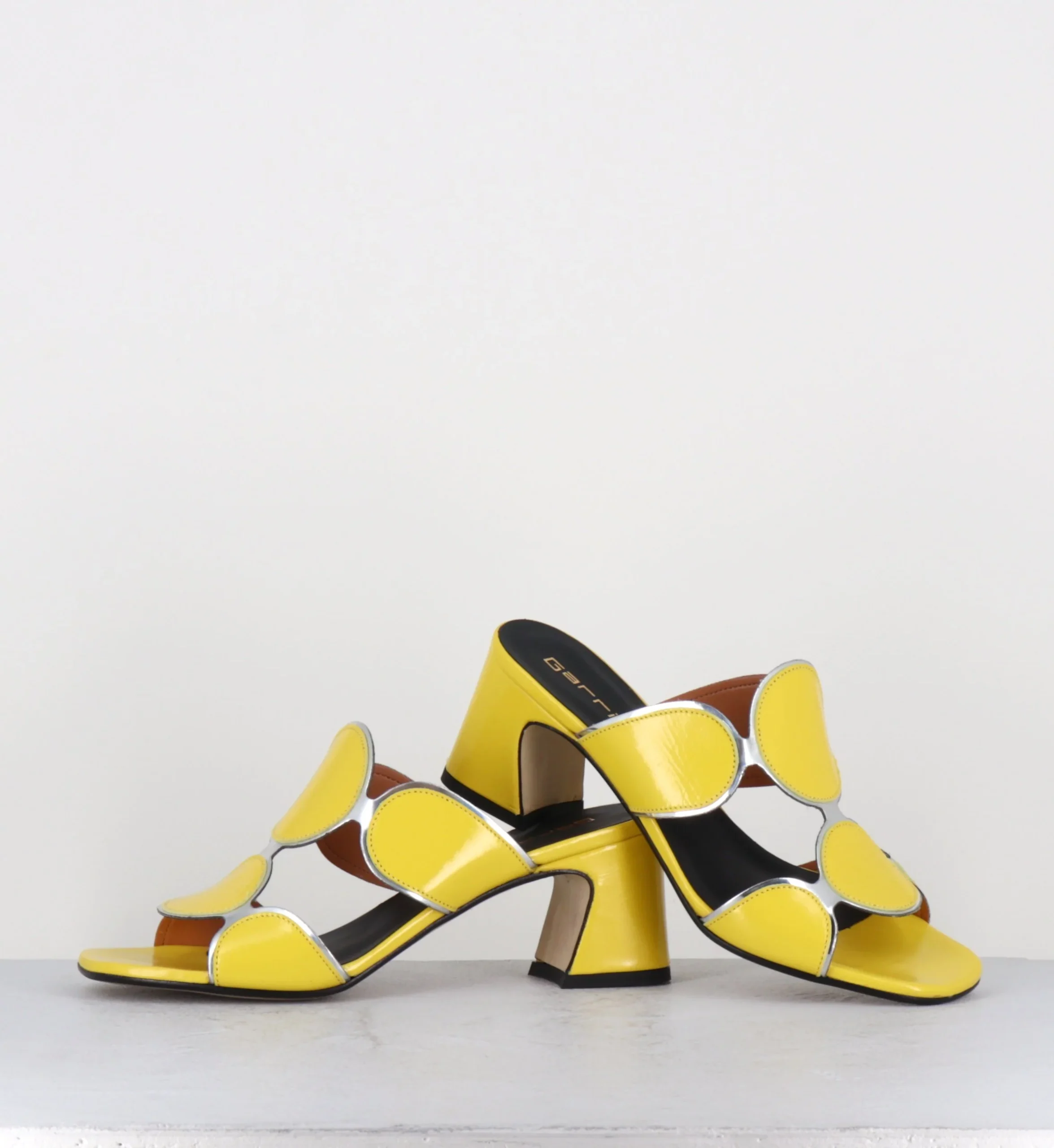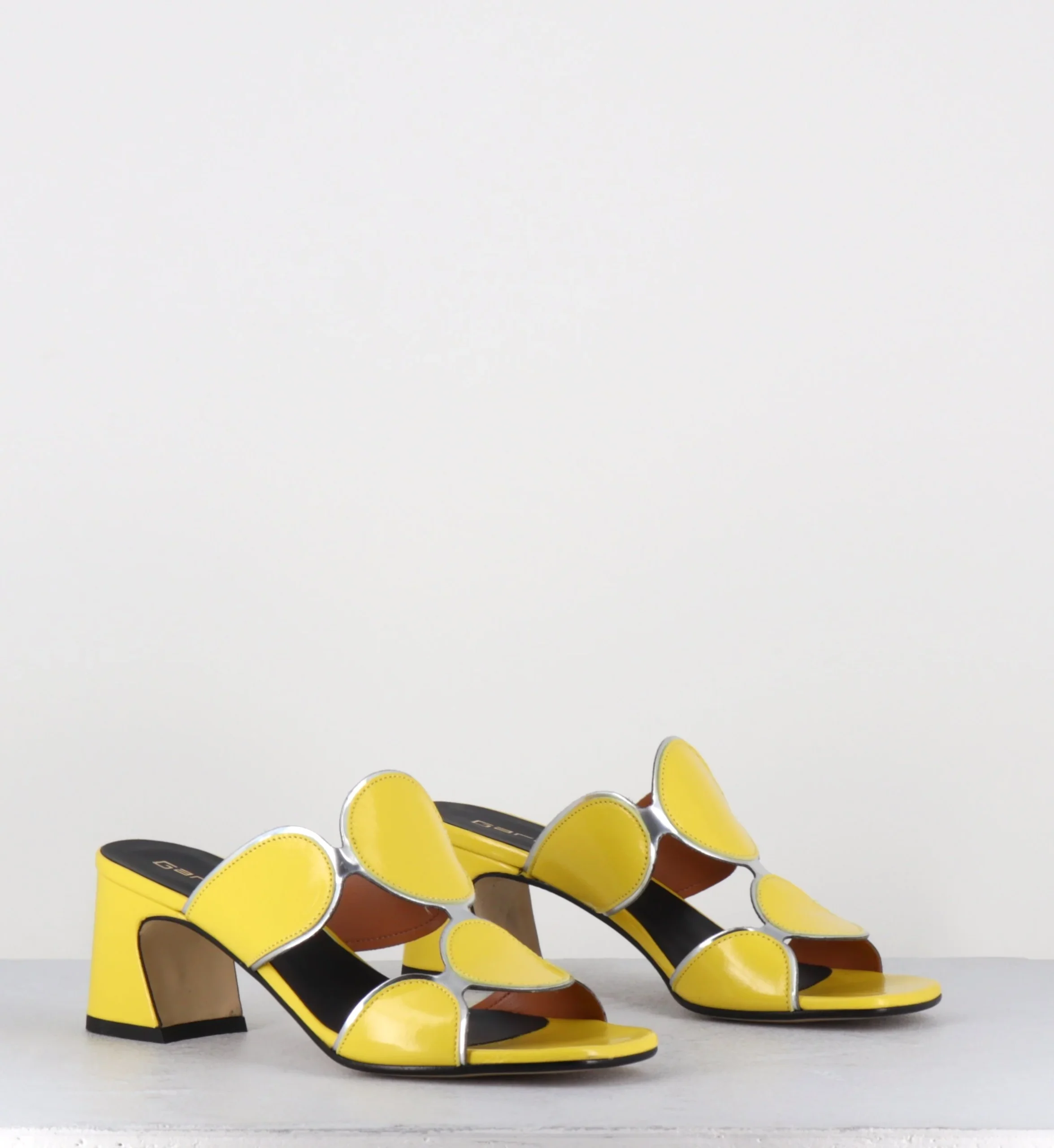 Sandales – mules en cuir jaune légèrement brillant, design géométrique esprit 60s fait de ronds entourés d’un liseré argent & montées sur un talon stylisé confortable Fabrication Artisanale Italienne – Ateliers GarriceLab Chausse normalement