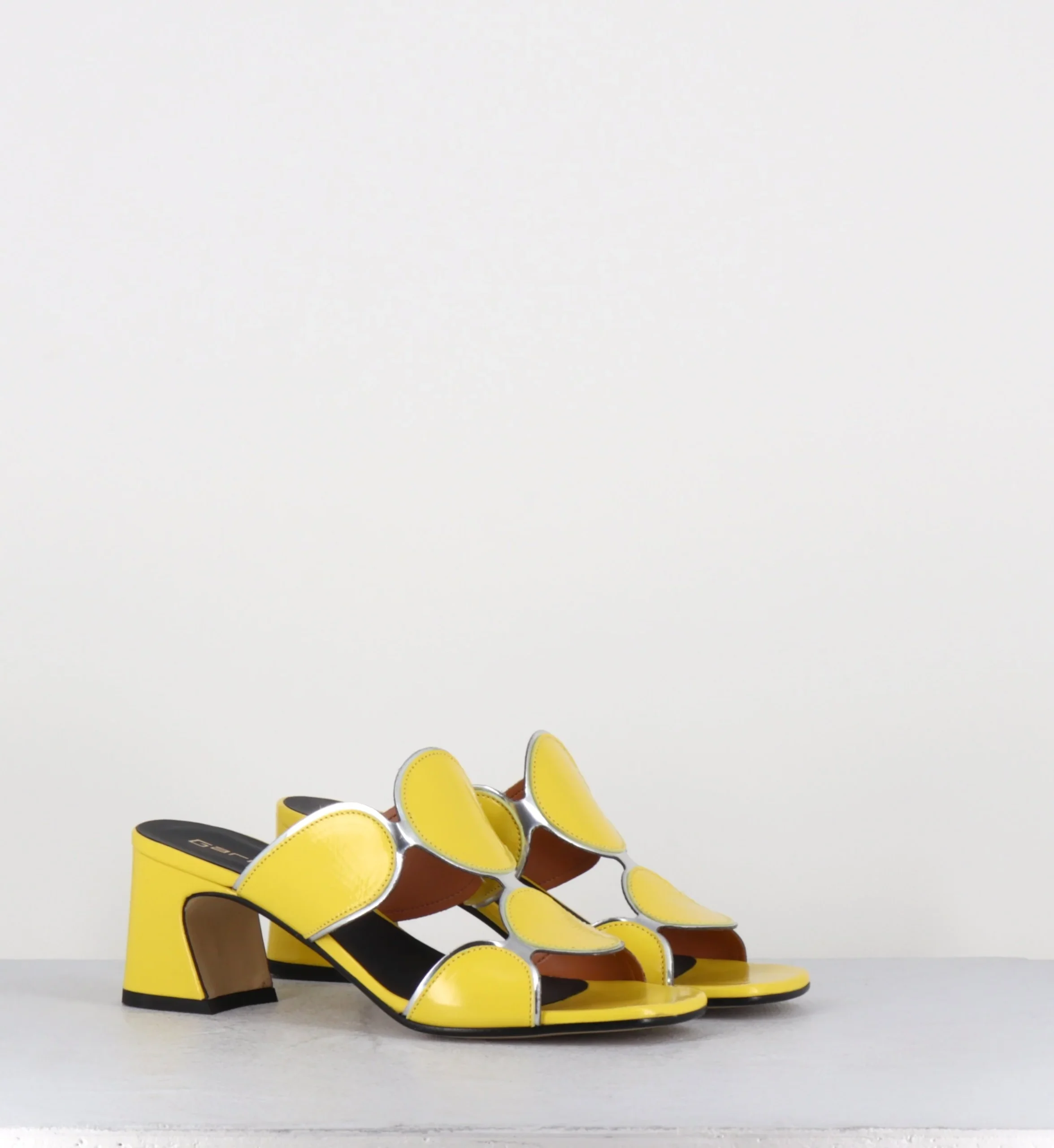 Sandales – mules en cuir jaune légèrement brillant, design géométrique esprit 60s fait de ronds entourés d’un liseré argent & montées sur un talon stylisé confortable