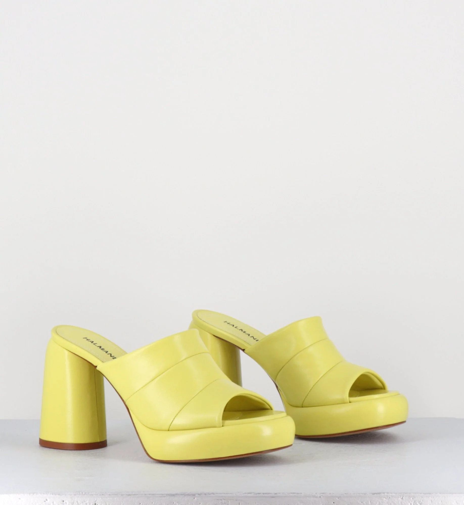 Mules – sandales en cuir jaune, bout arrondi, montées sur une plateforme bombée et un talon cylindrique, signature de la Maison. Fabrication Artisanale Italienne – Ateliers Halmanera Chausse légèrement grand