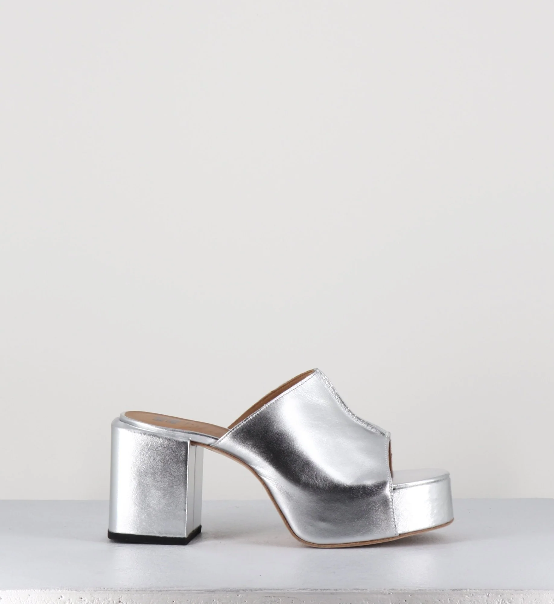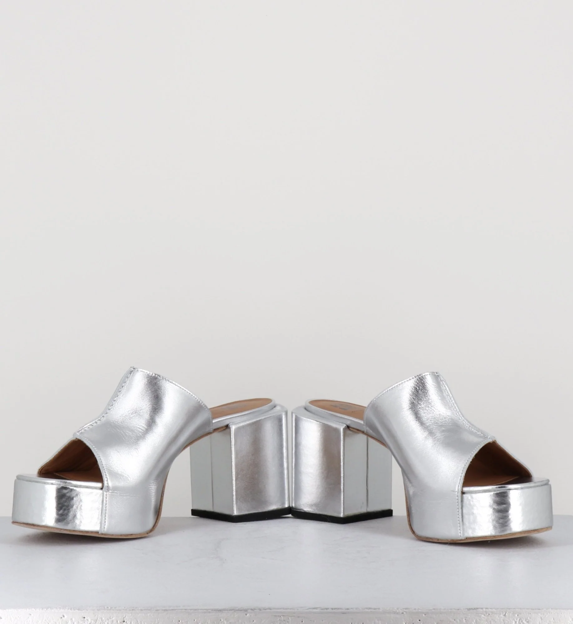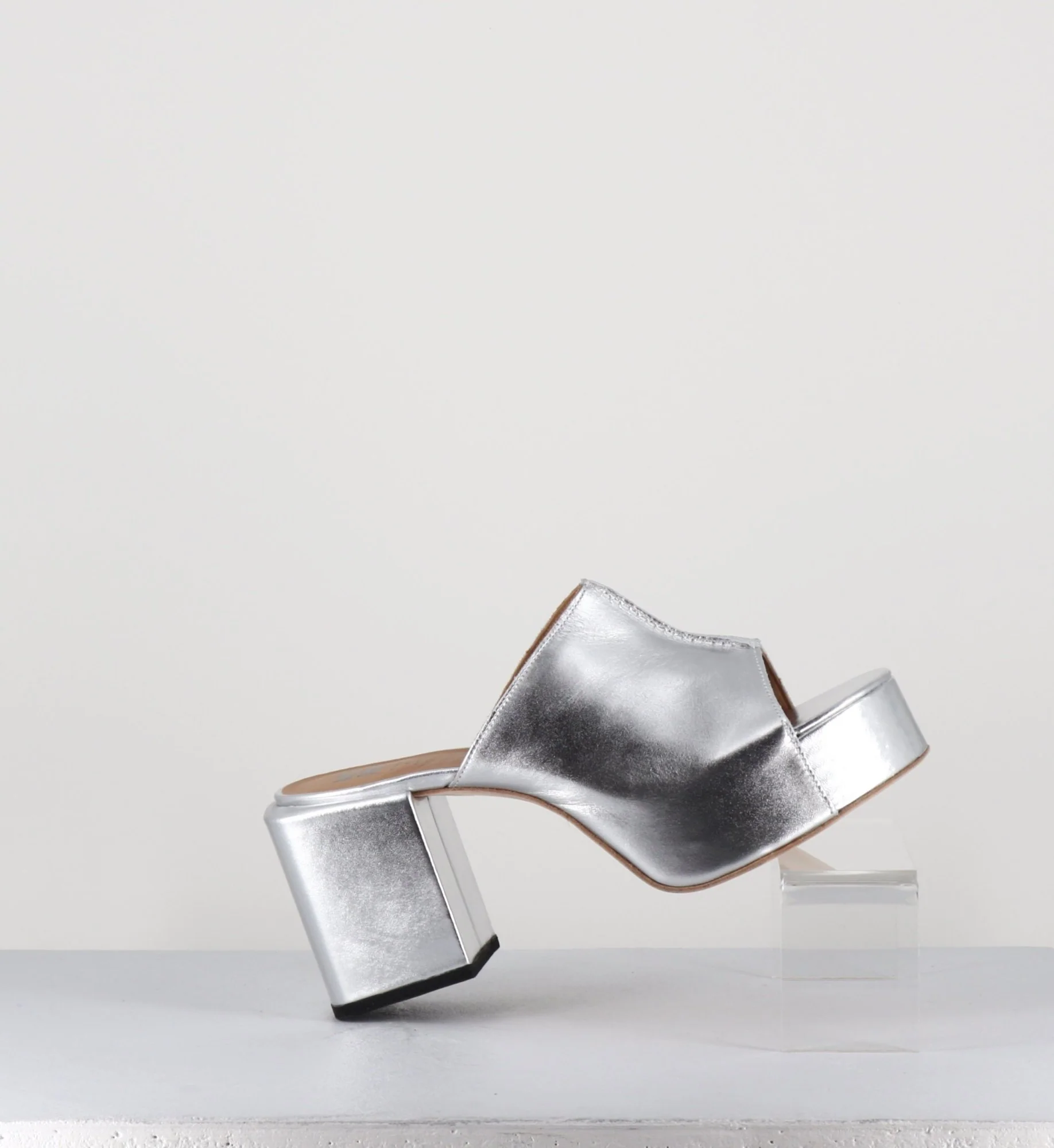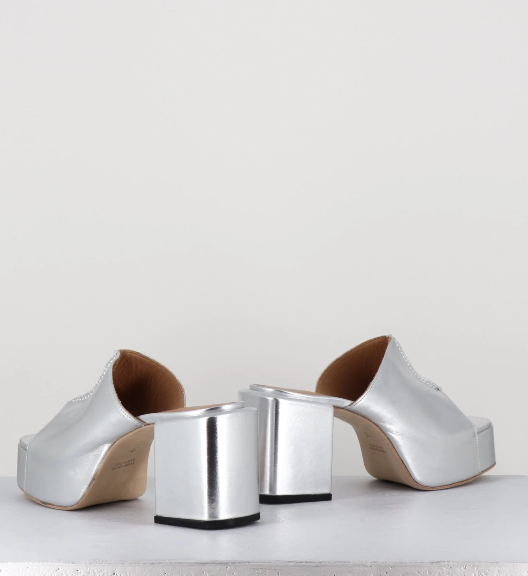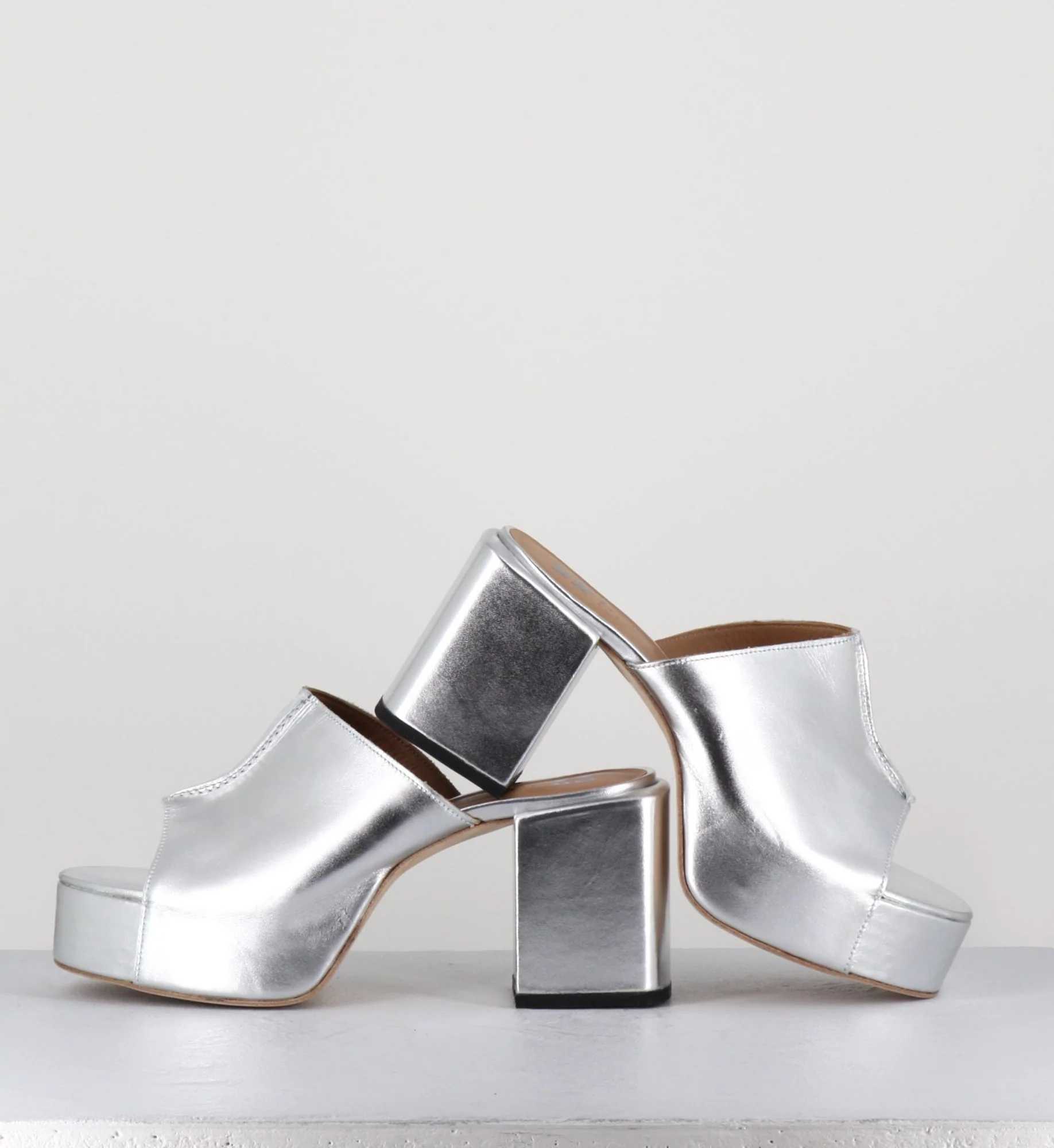 Mules-Sandales en cuir métallisé argent, ligne pure inspirée des années 70, montées sur un talon bloc rectangulaire & une plateforme structurée. D’un grand confort