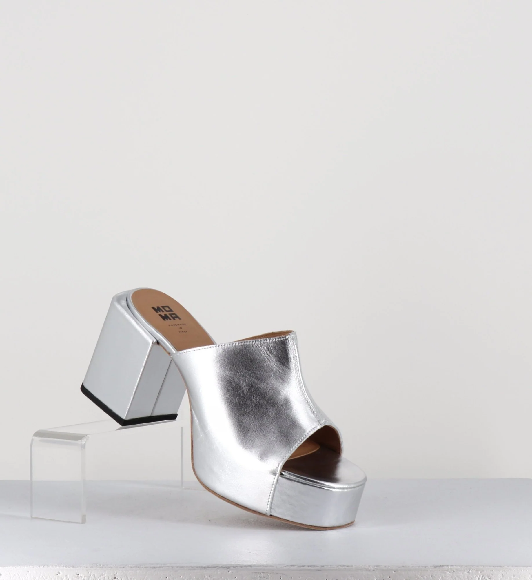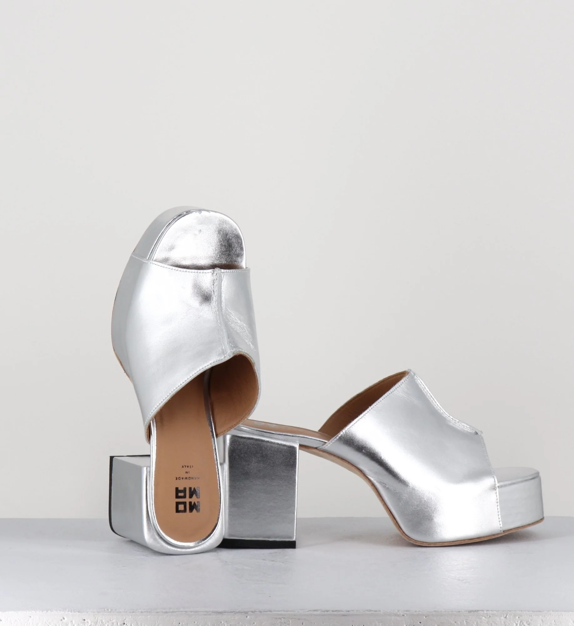 Mules-Sandales en cuir métallisé argent, ligne pure inspirée des années 70, montées sur un talon bloc rectangulaire & une plateforme structurée. D’un grand confort Fabrication Artisanale Italienne – Ateliers Moma Chausse grand Le cuir véritable laminé / métallisé peut présenter des irrégularités qui sont tout à fait normal