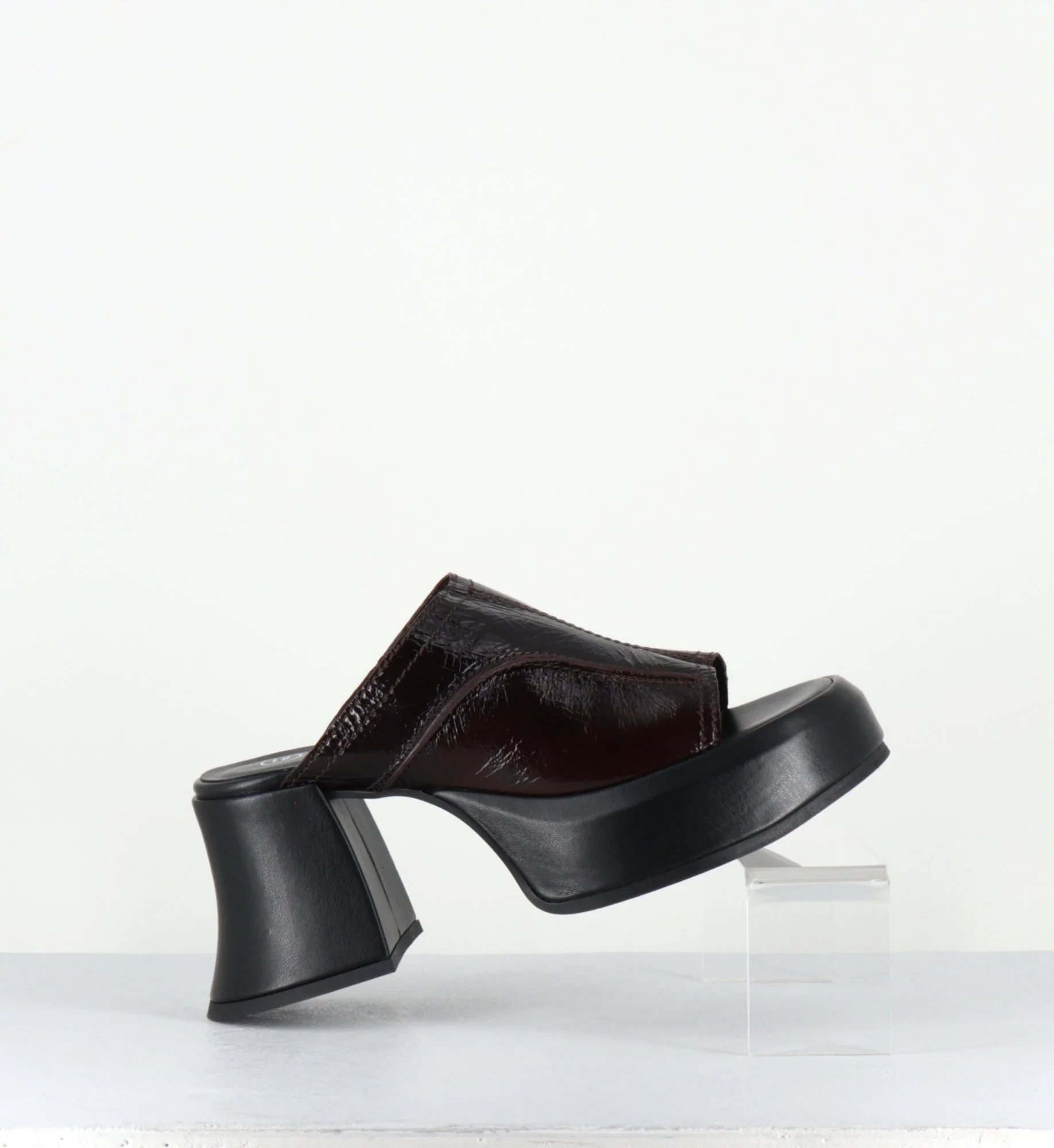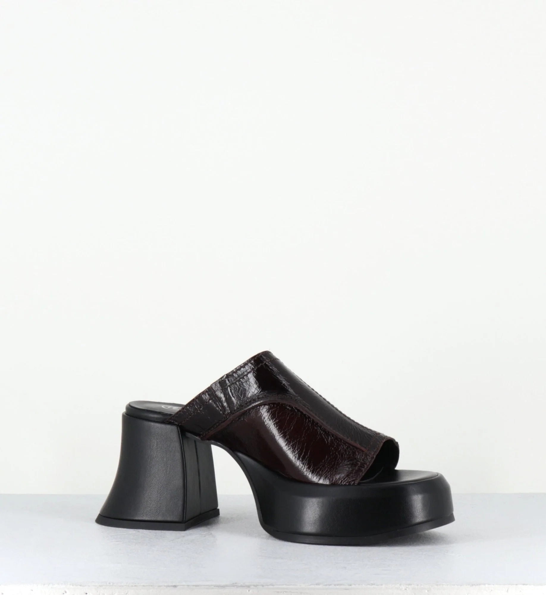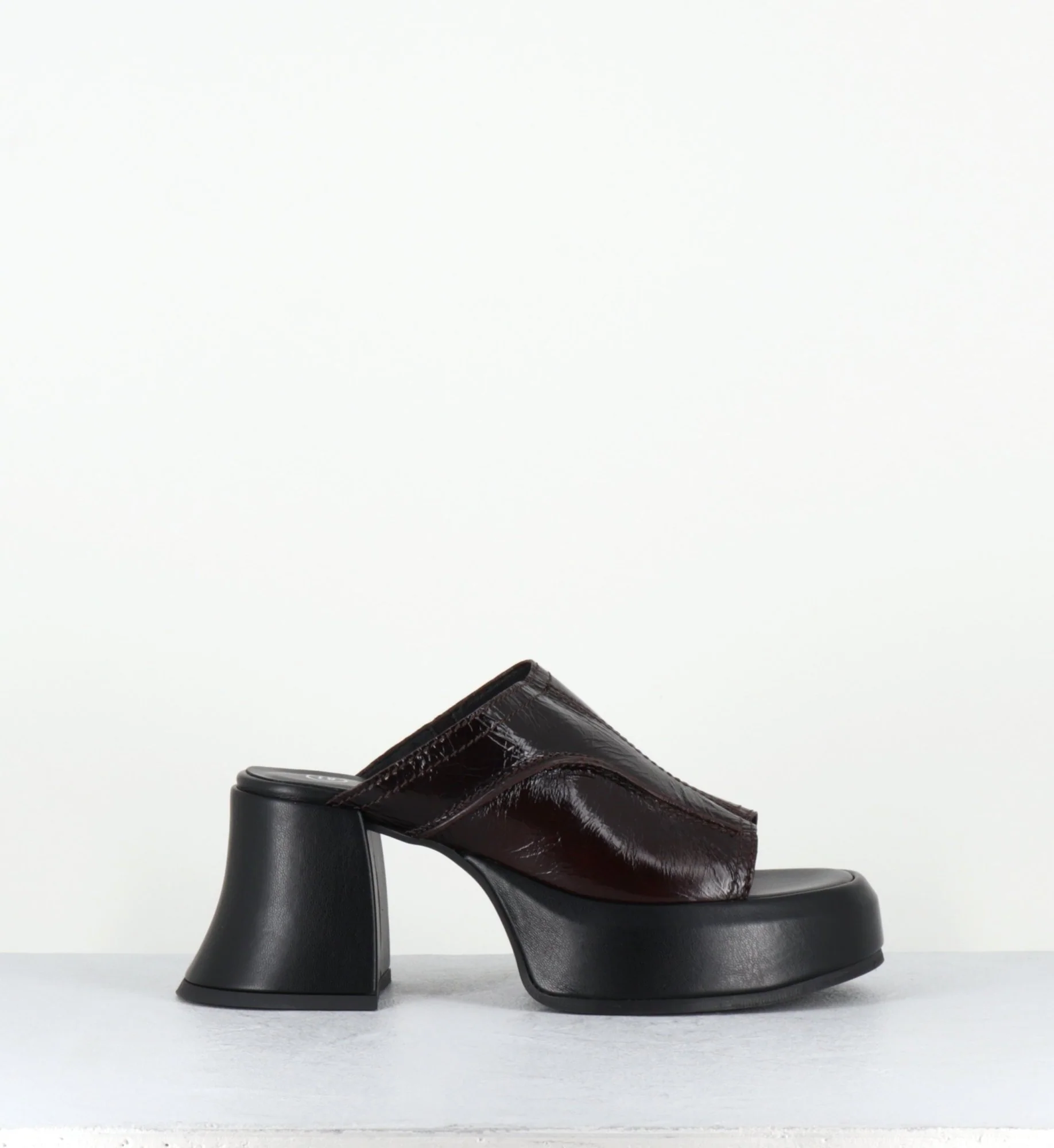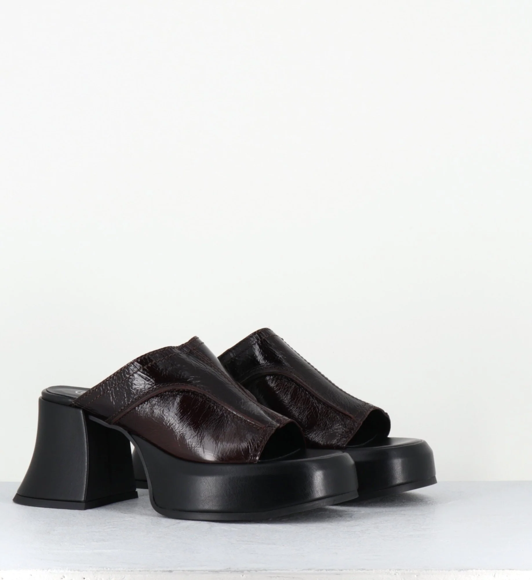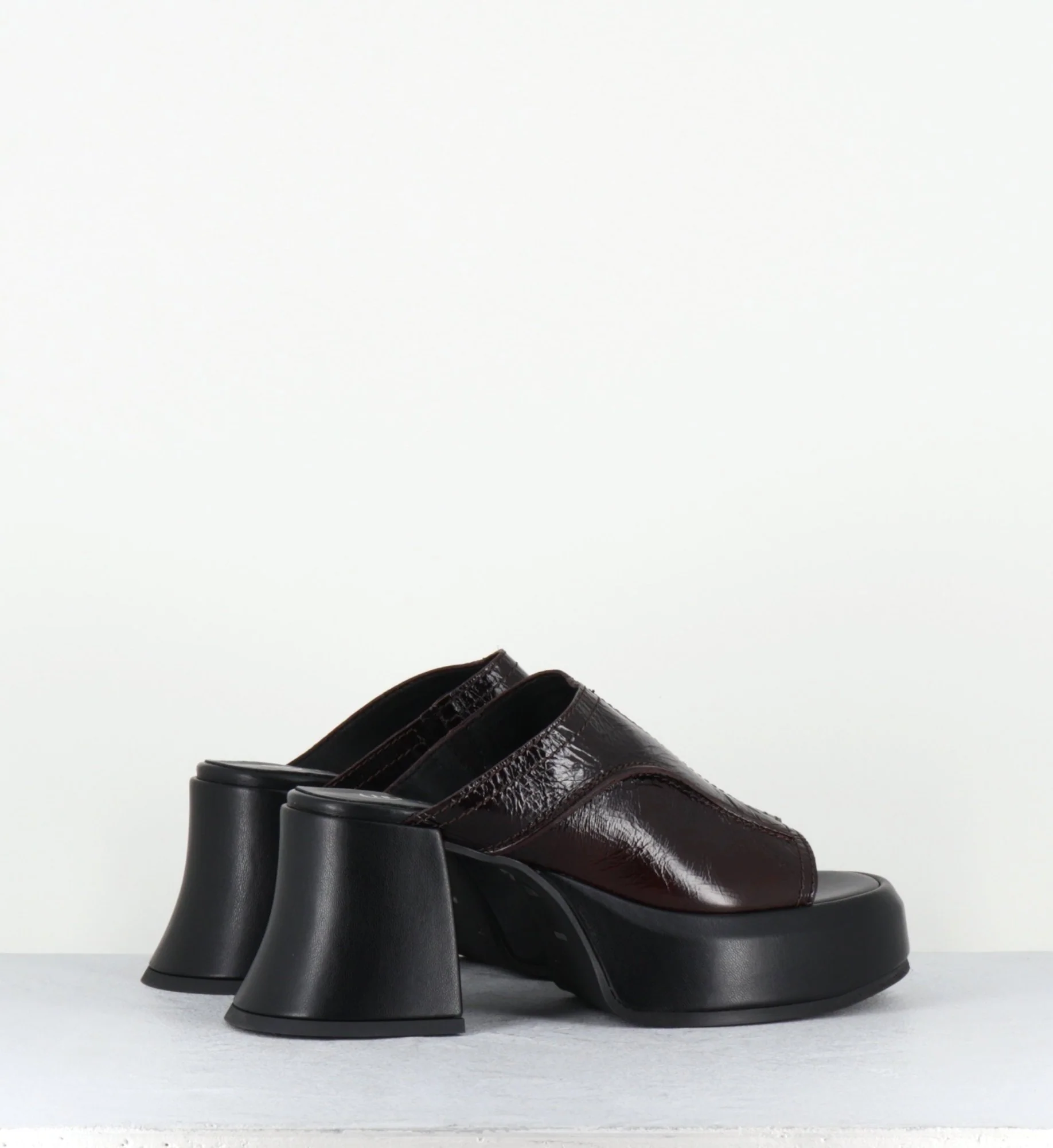 Sandales à plateforme en cuir brillant effet froissé marron chocolat avec détails de surpiqûres au look vintage, forme inspirée des années 70 montées sur un talon légèrement évasé et une plateforme ronde recouverts de cuir noir Fabriqué à la main au Portugal – Ateliers E8 by Miista Chausse grand (forme large)