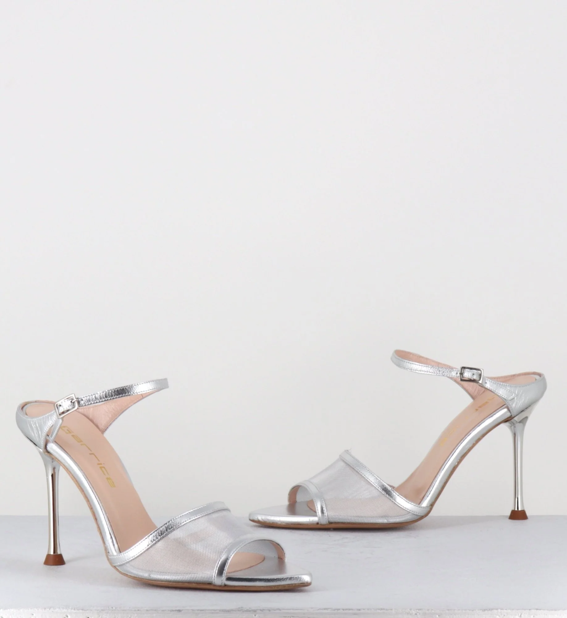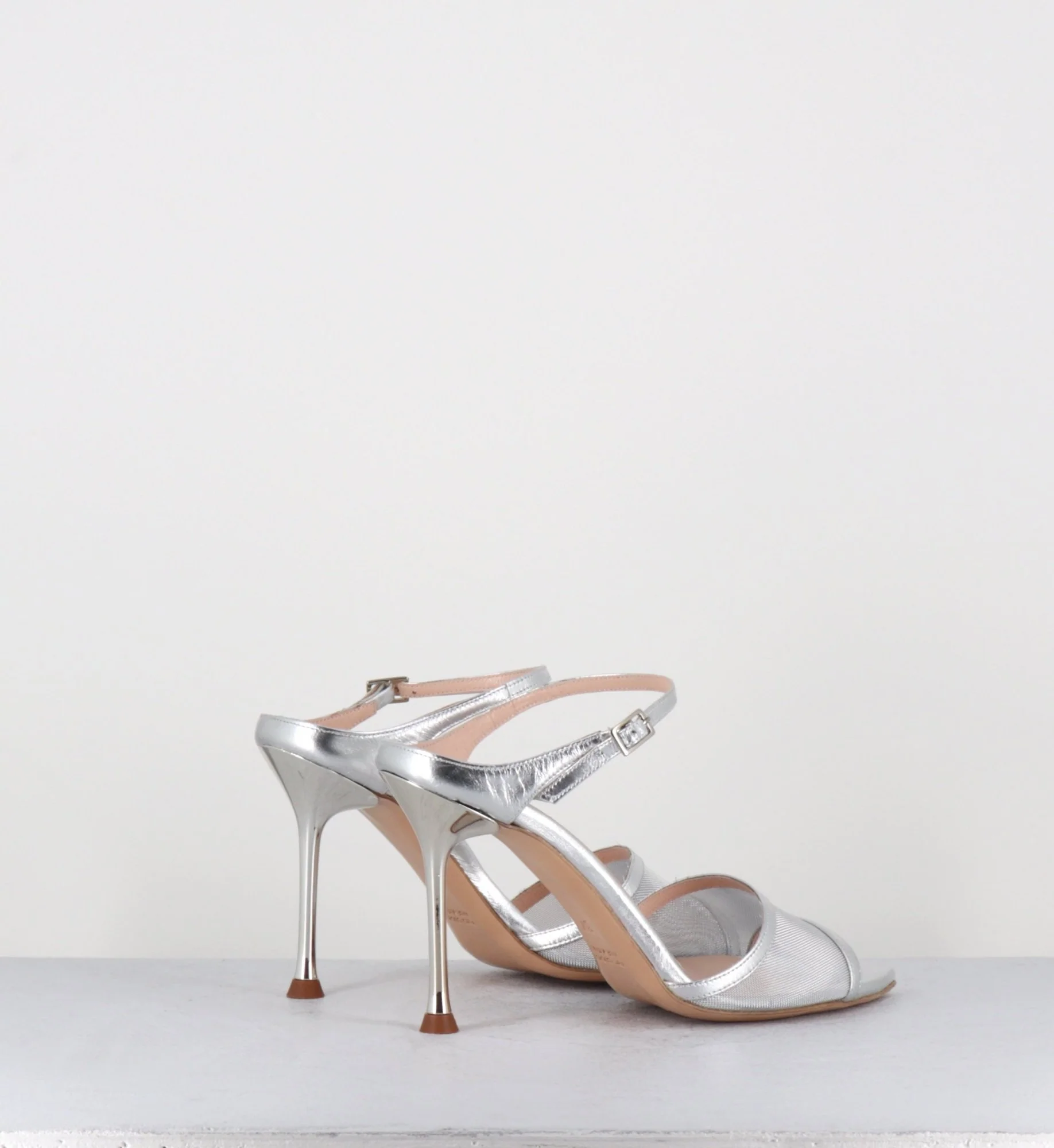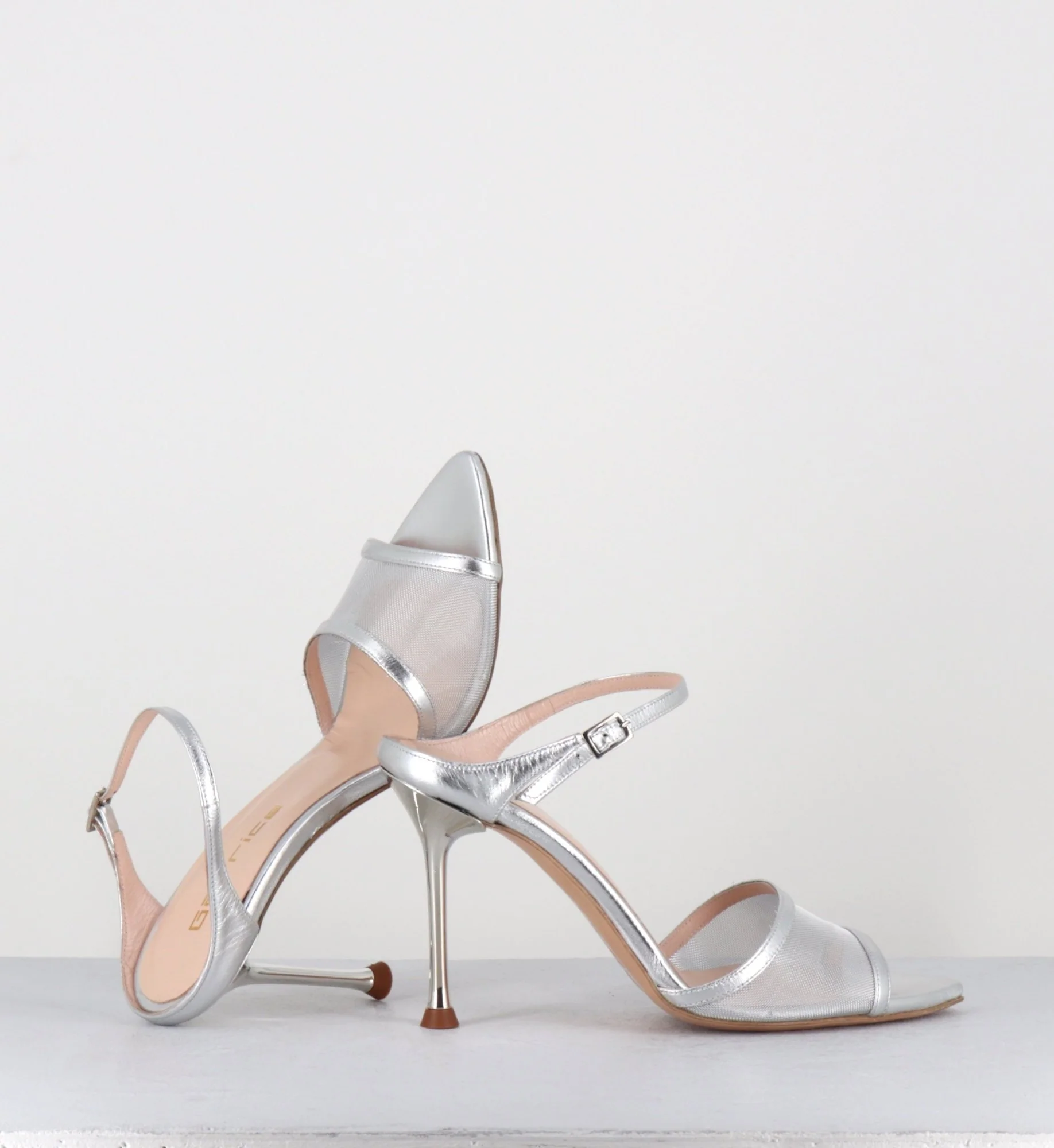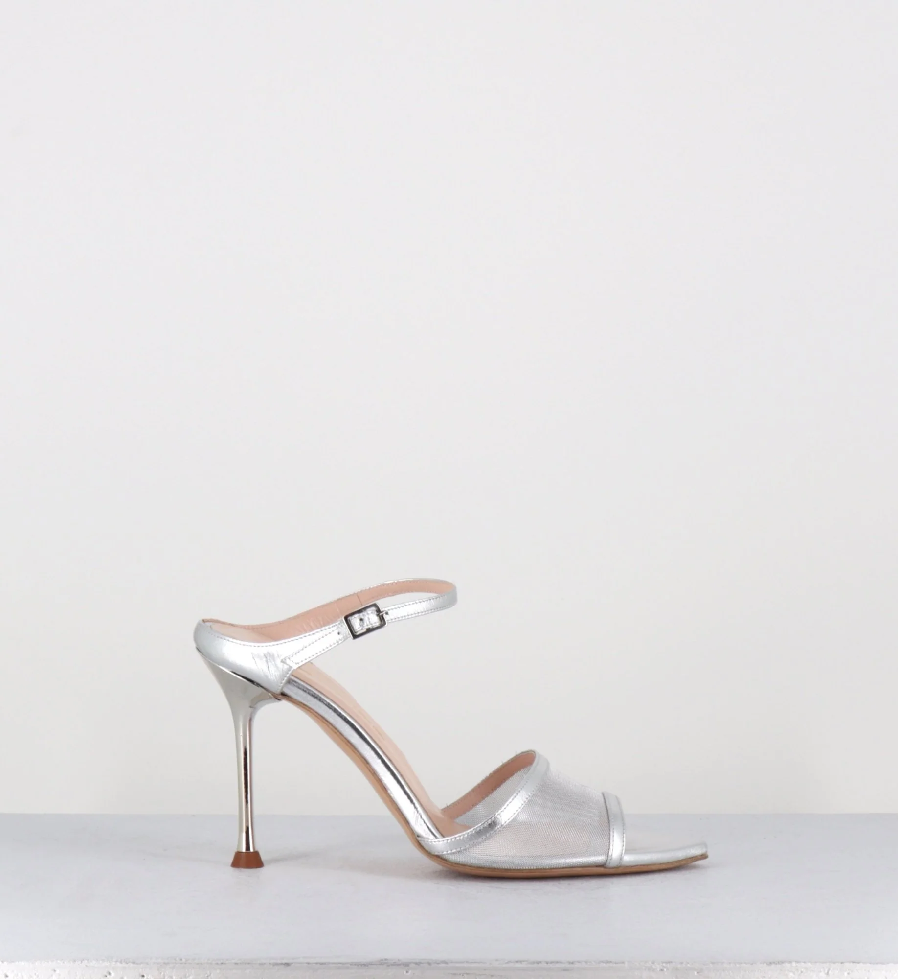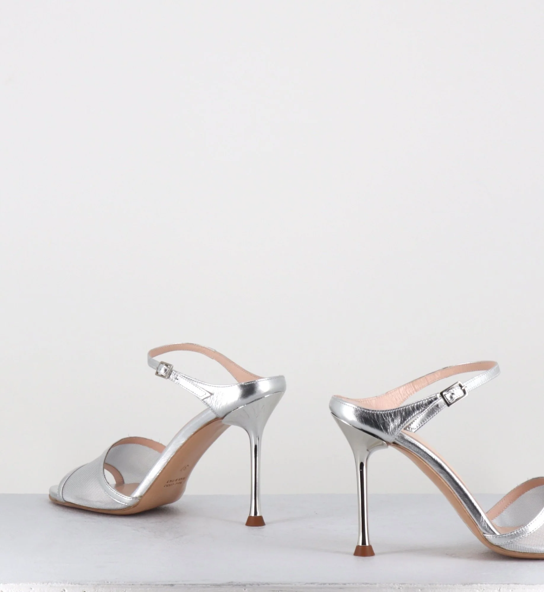 Mules à talon haut en cuir métallisé argent & mesh – ORLU RETE ARGENTO