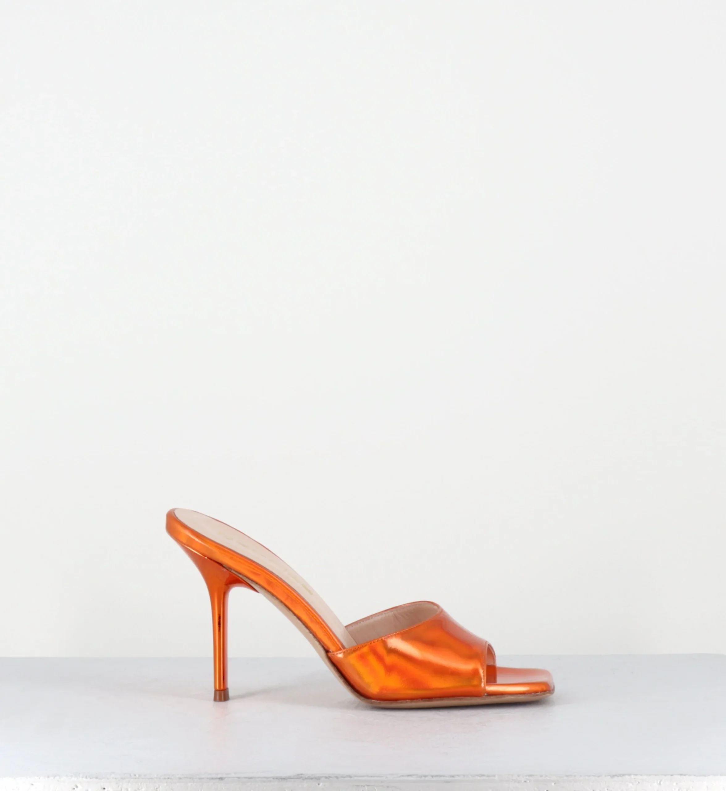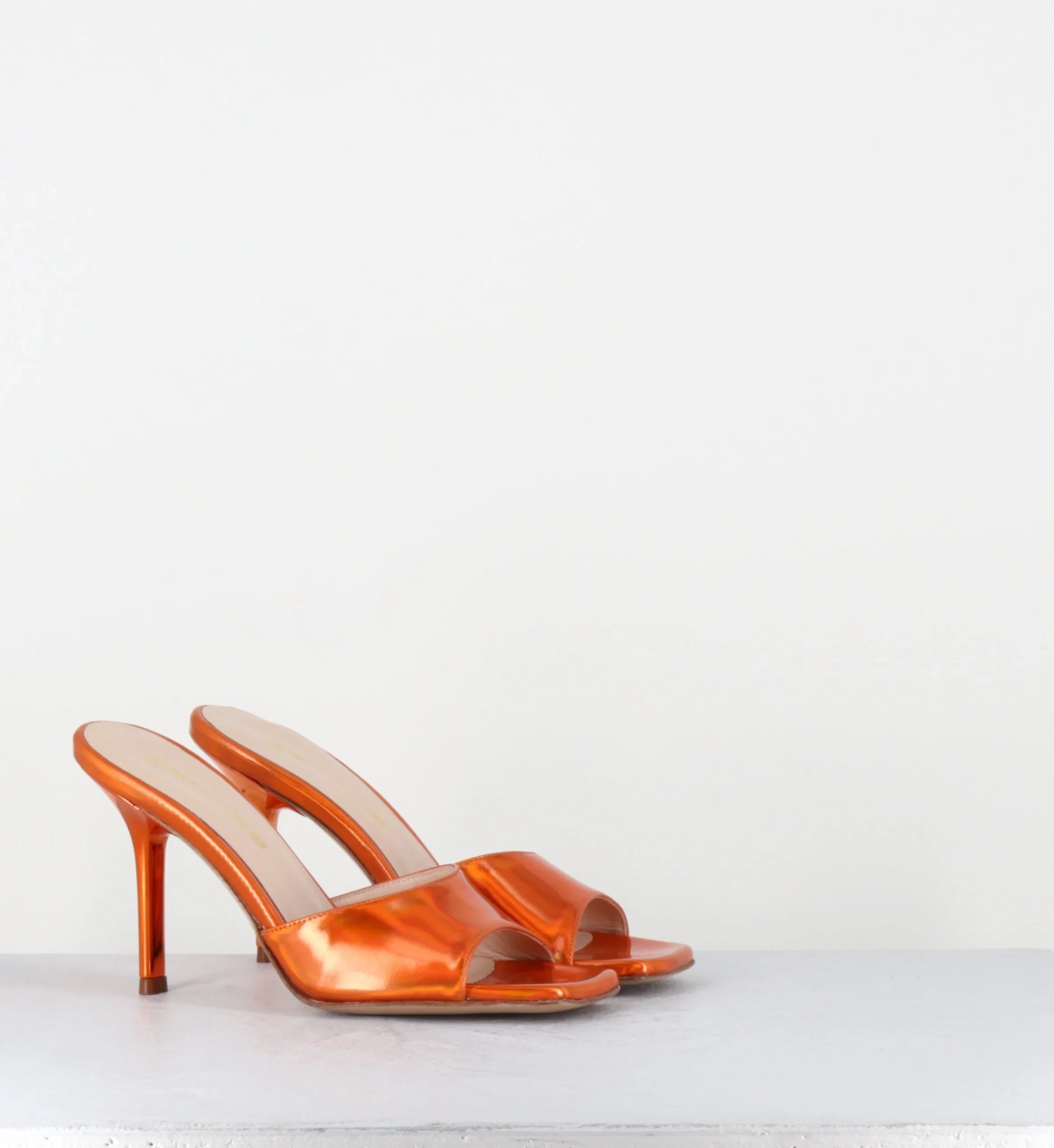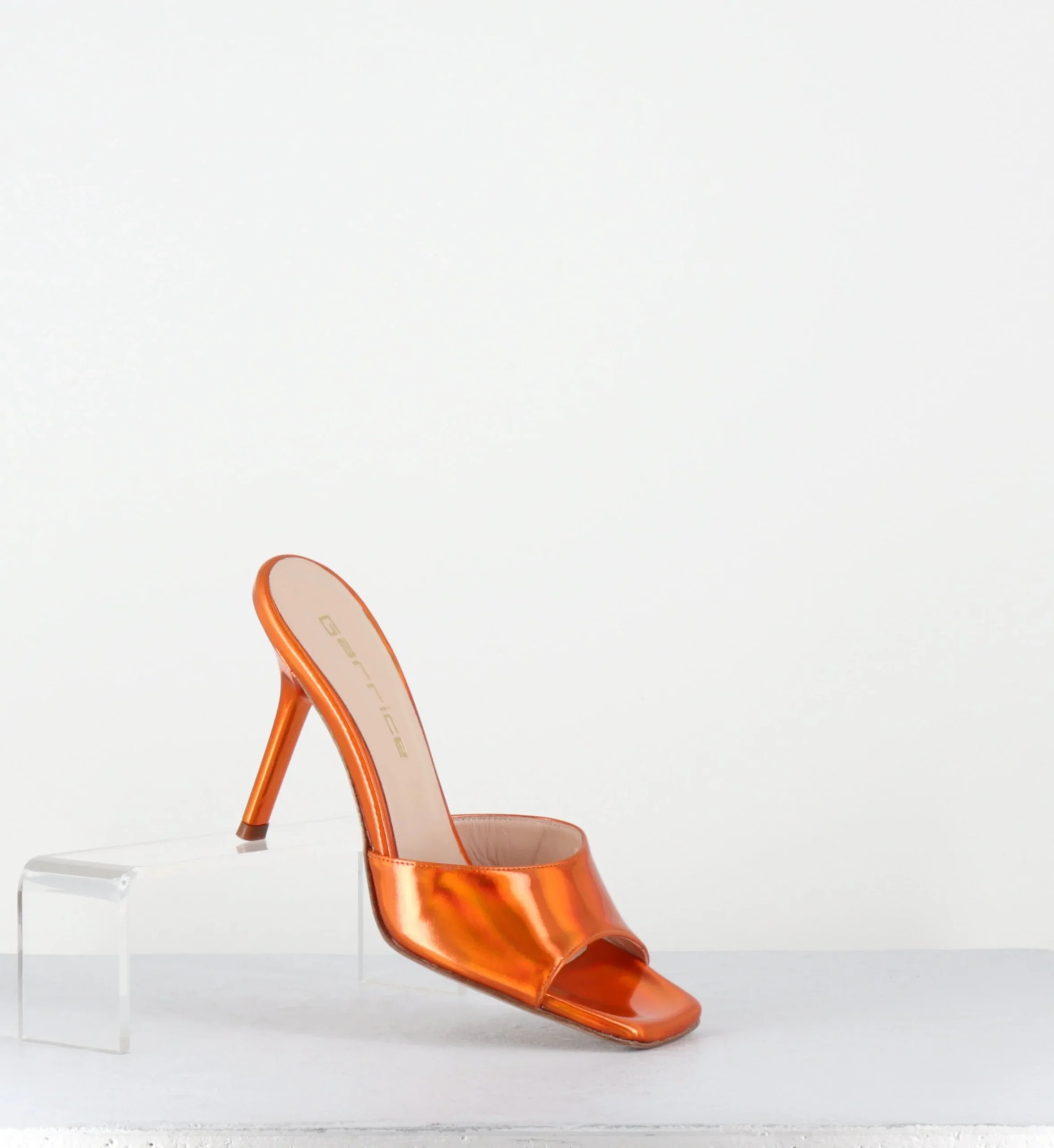 Mules à talon haut en cuir glacé miroir orange, bout carré esprit années 90, montées sur un talon stylisé laqué ton sur ton Fabrication Artisanale Italienne – Ateliers GarriceLab