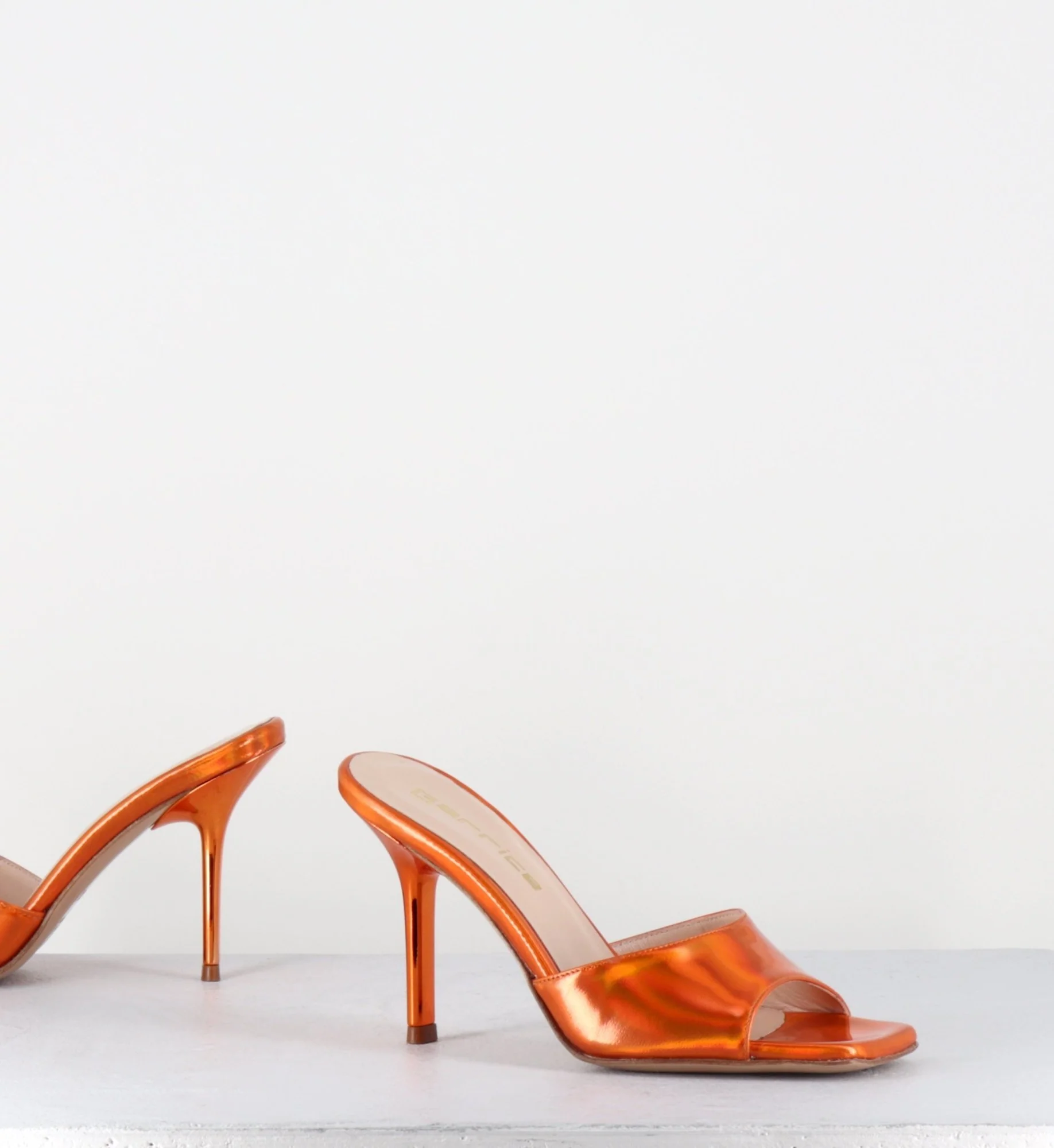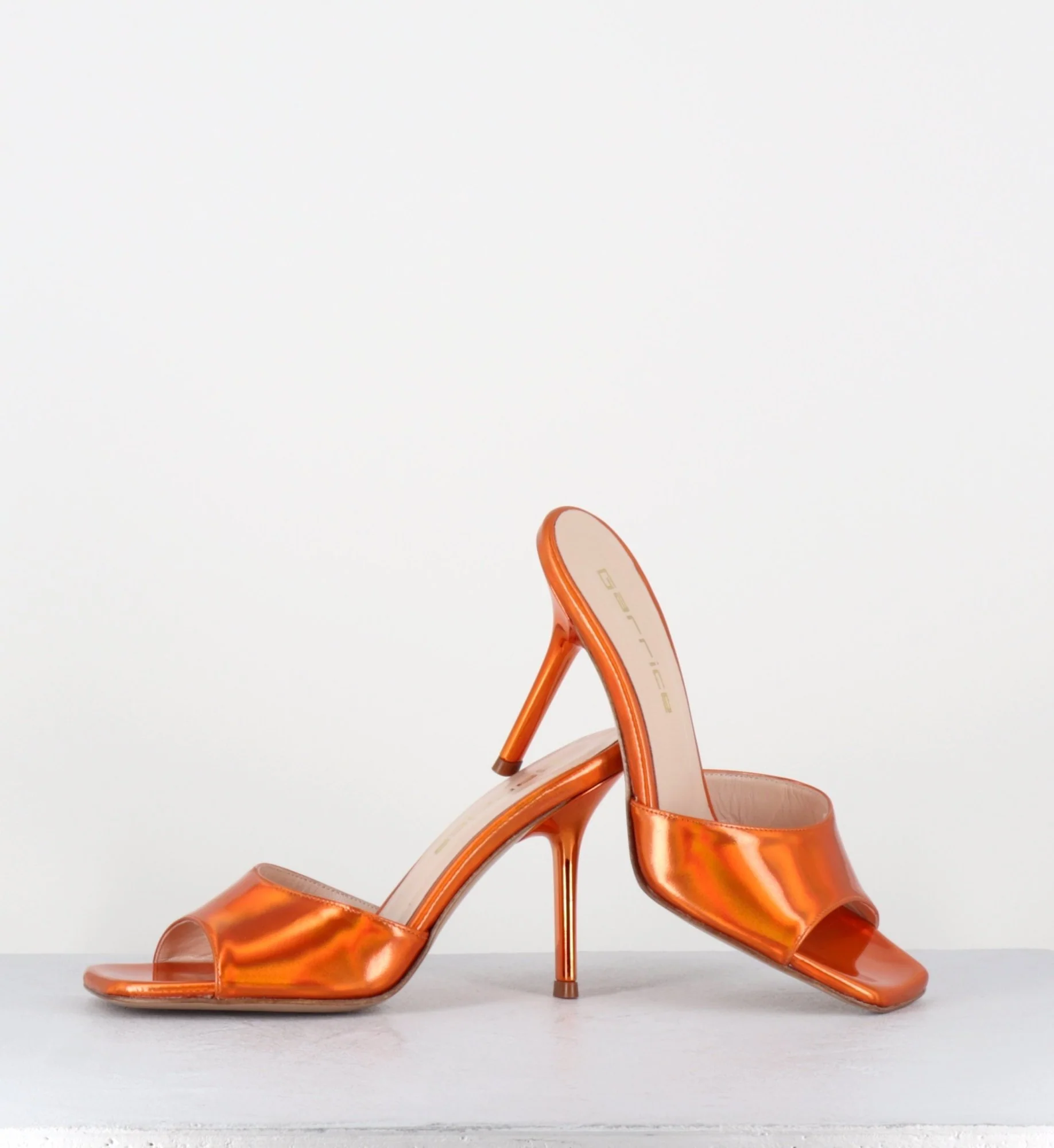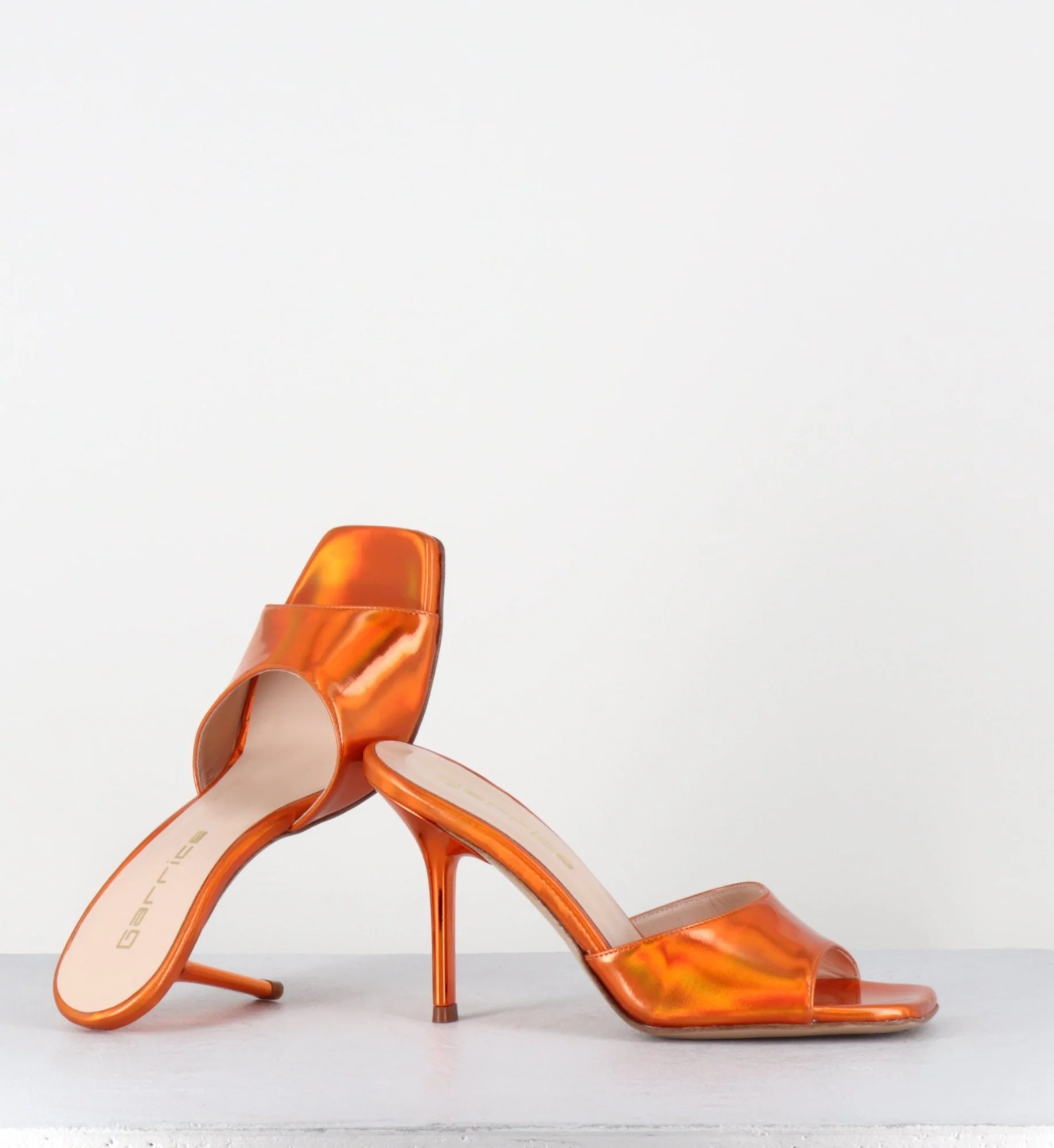 Mules à talon haut en cuir glacé miroir orange, bout carré esprit années 90, montées sur un talon stylisé laqué ton sur ton Fabrication Artisanale Italienne – Ateliers GarriceLab