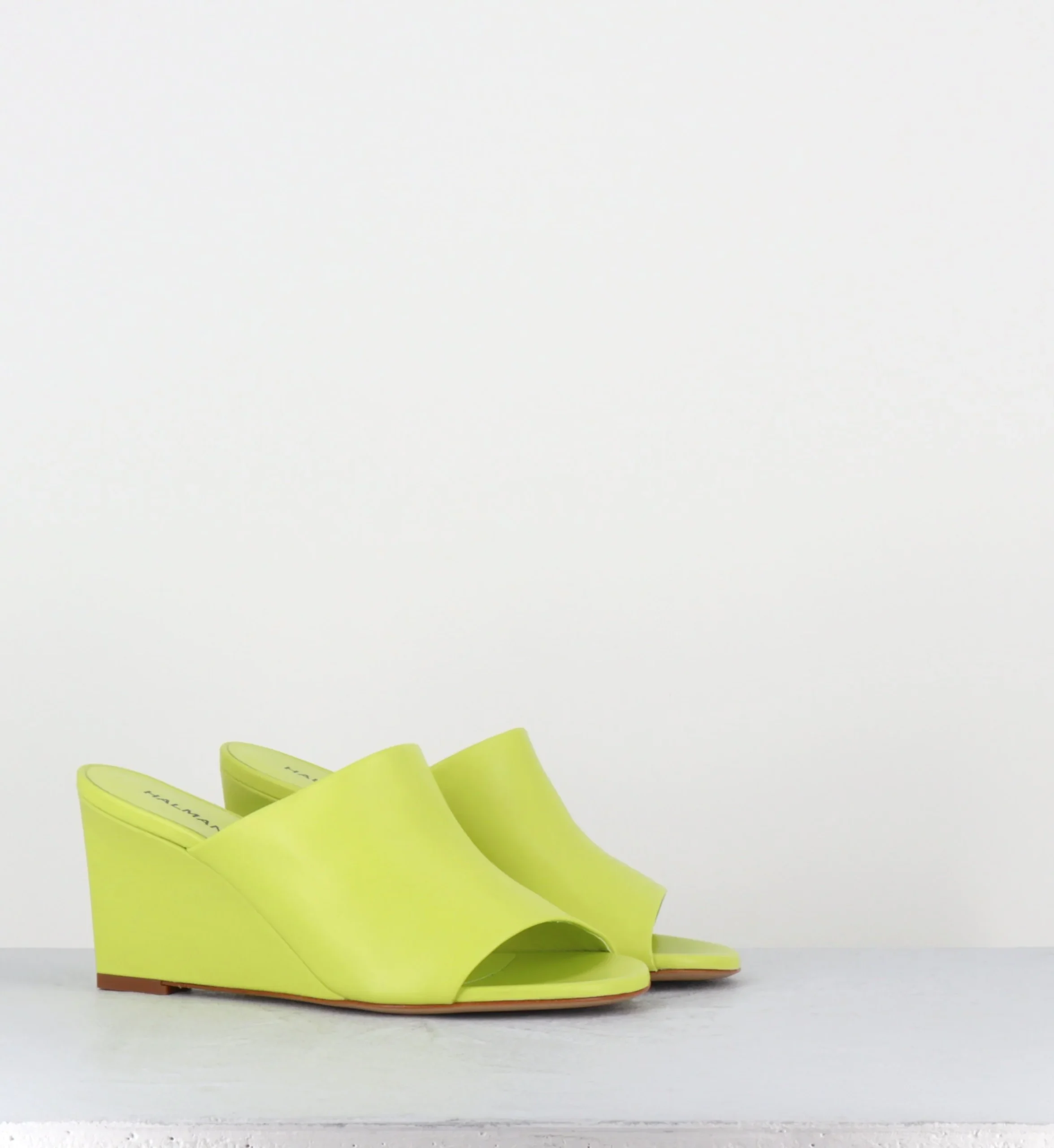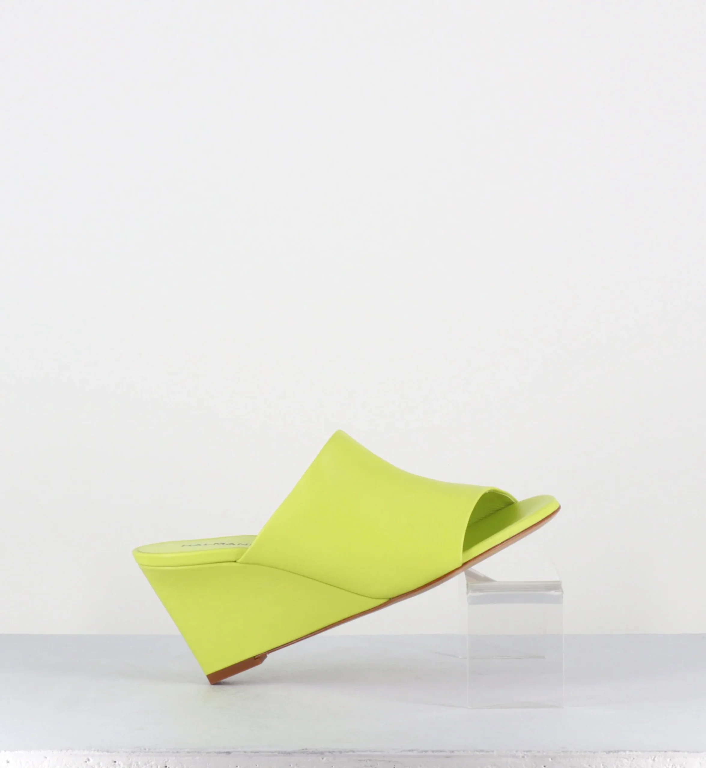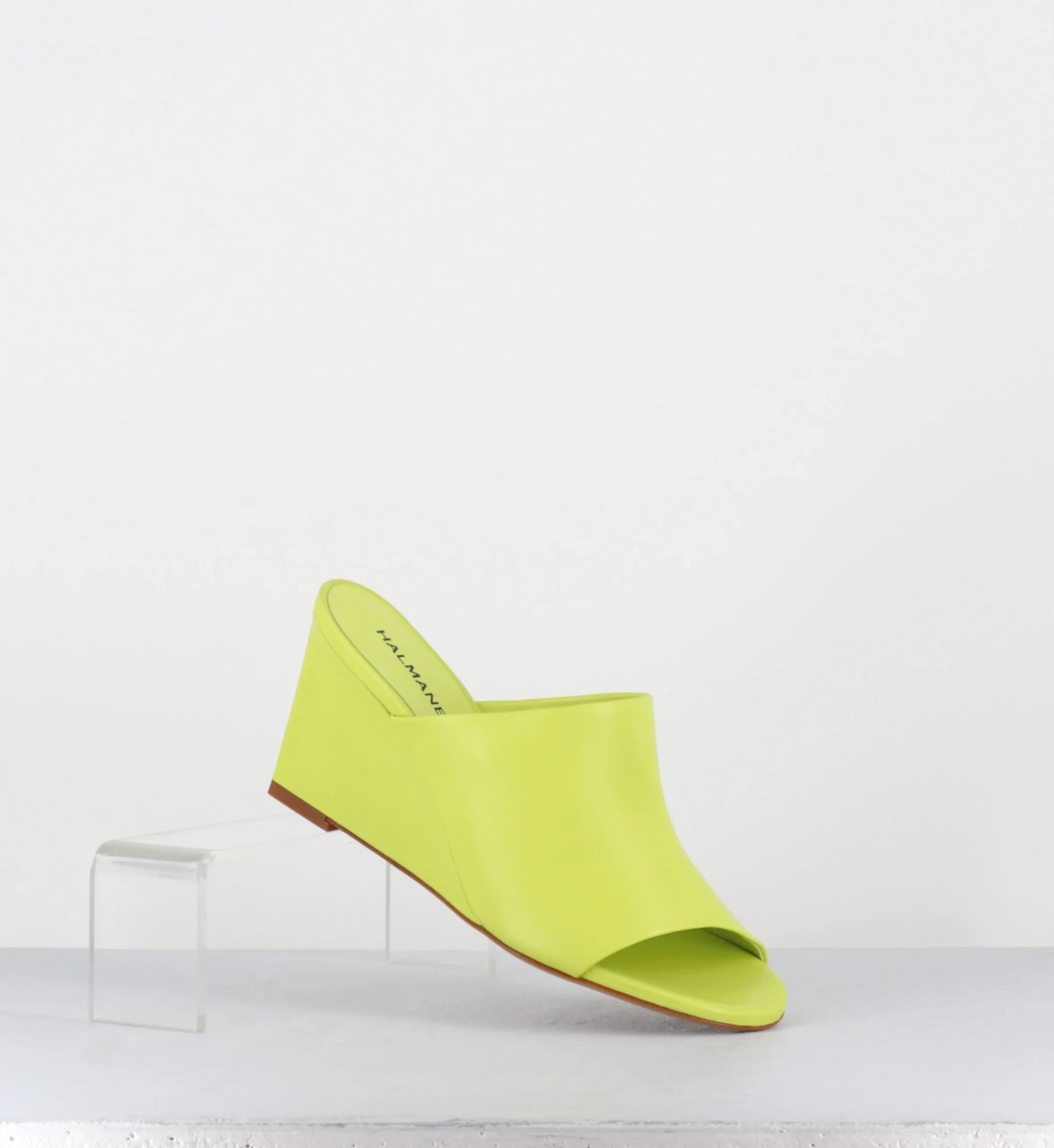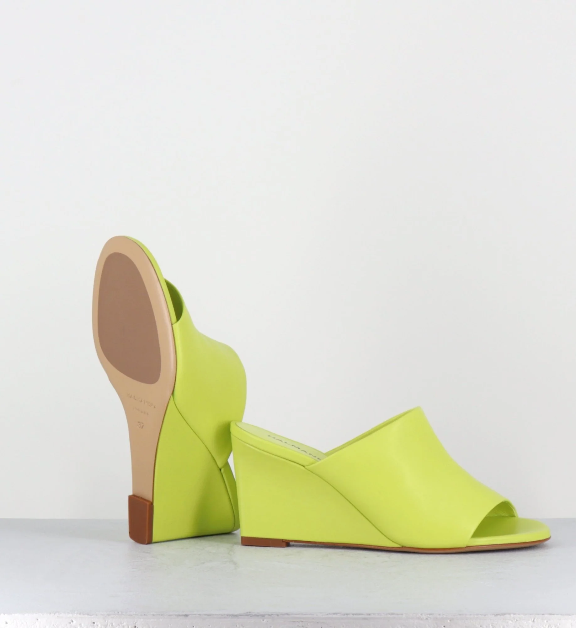 Mules sandales compensées en cuir souple jaune citron, ligne pure avec découpe asymétrique Fabrication Artisanale Italienne – Ateliers Halmanera Chausse légèrement grand