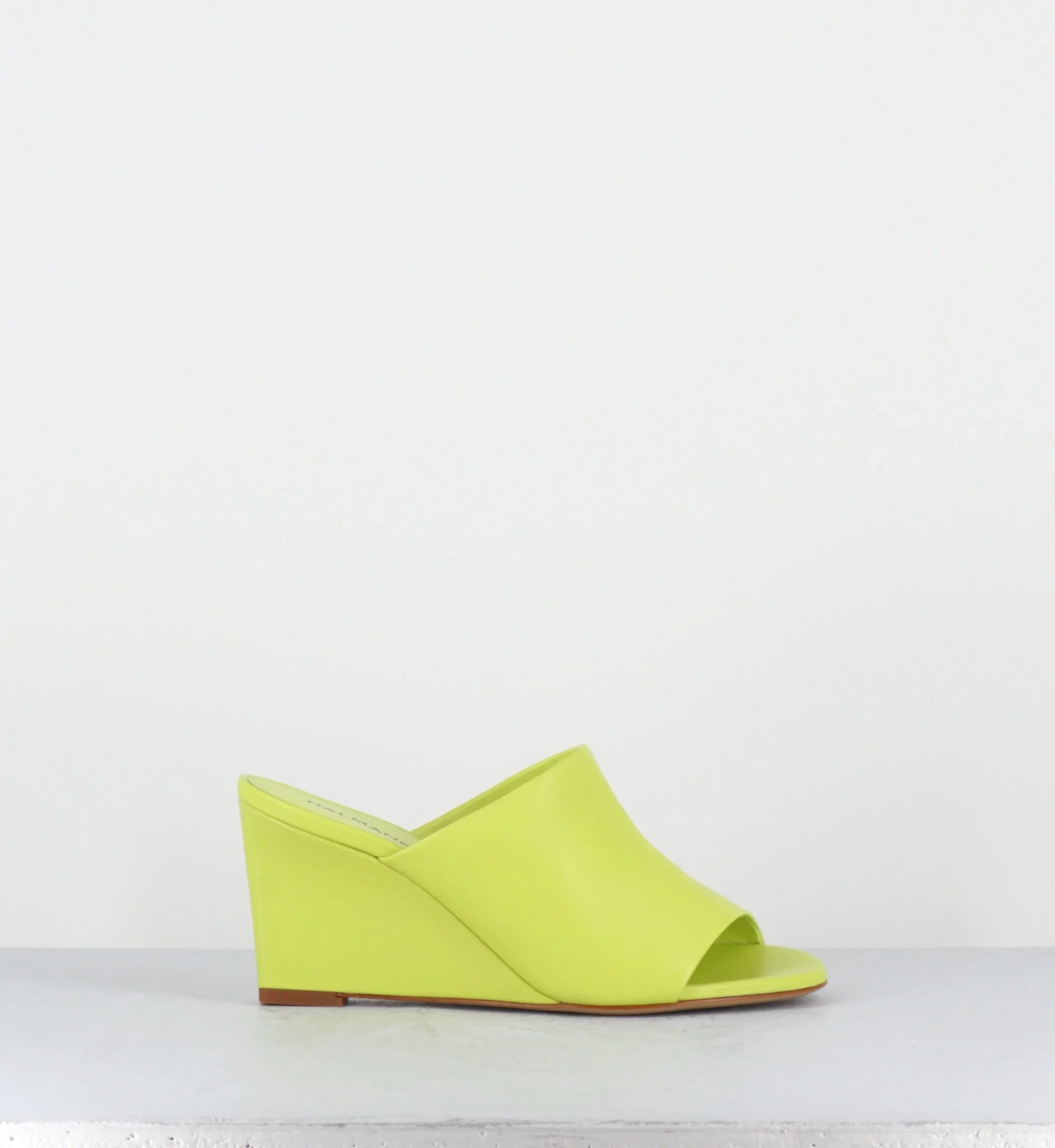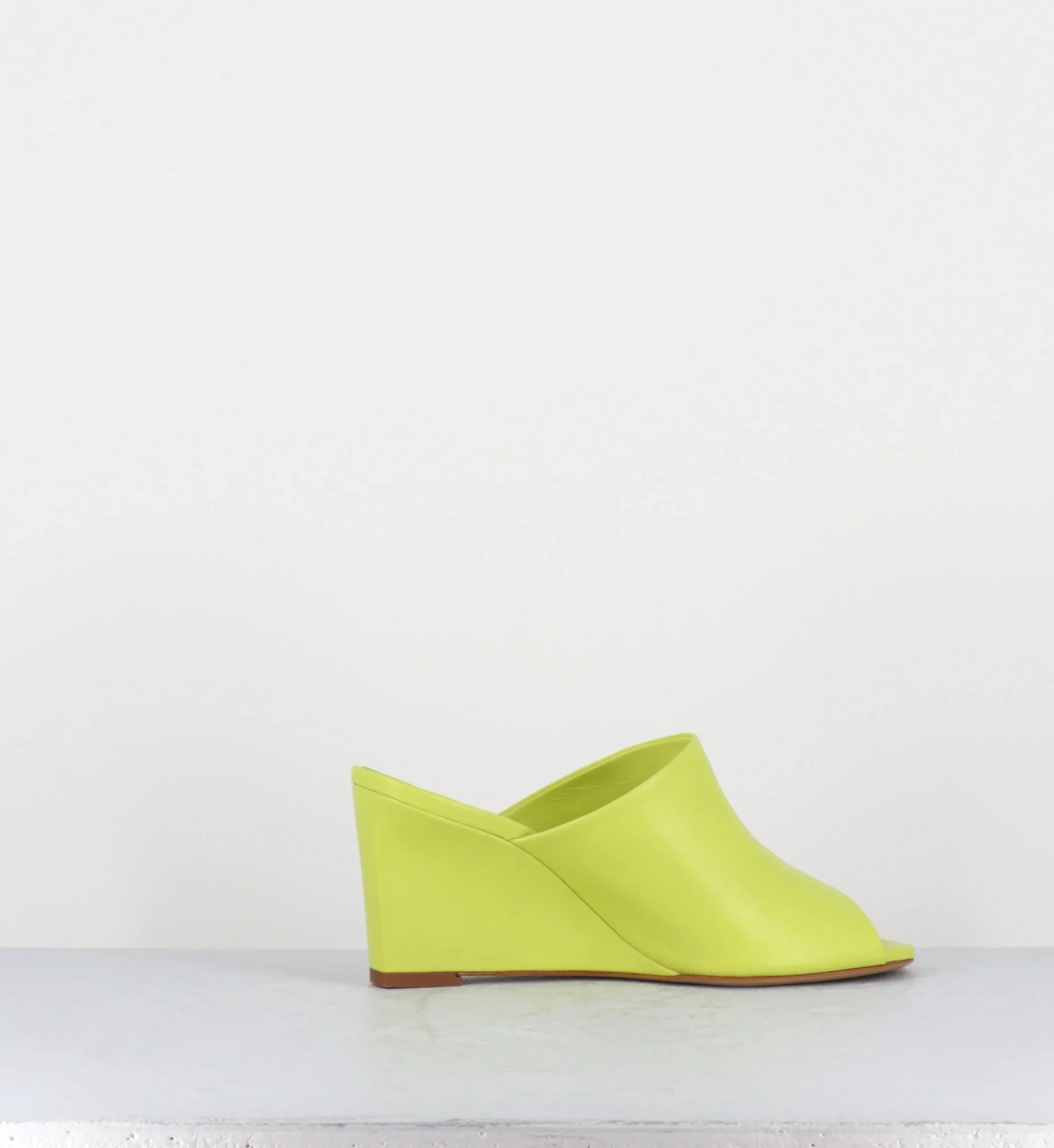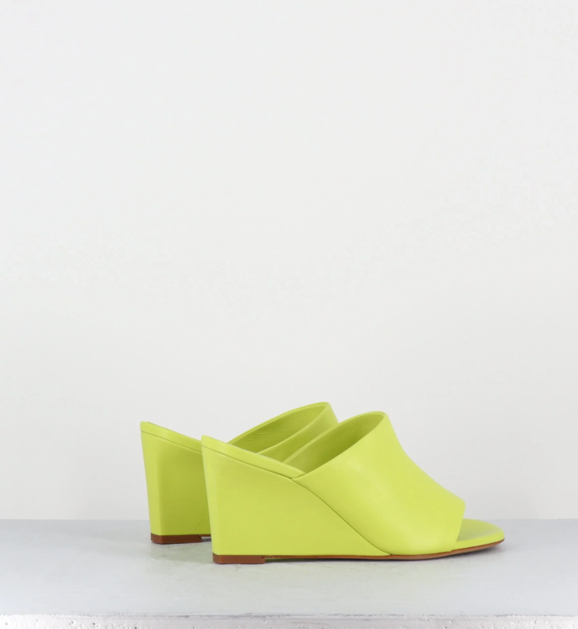 Mules sandales compensées en cuir souple jaune citron, ligne pure avec découpe asymétrique